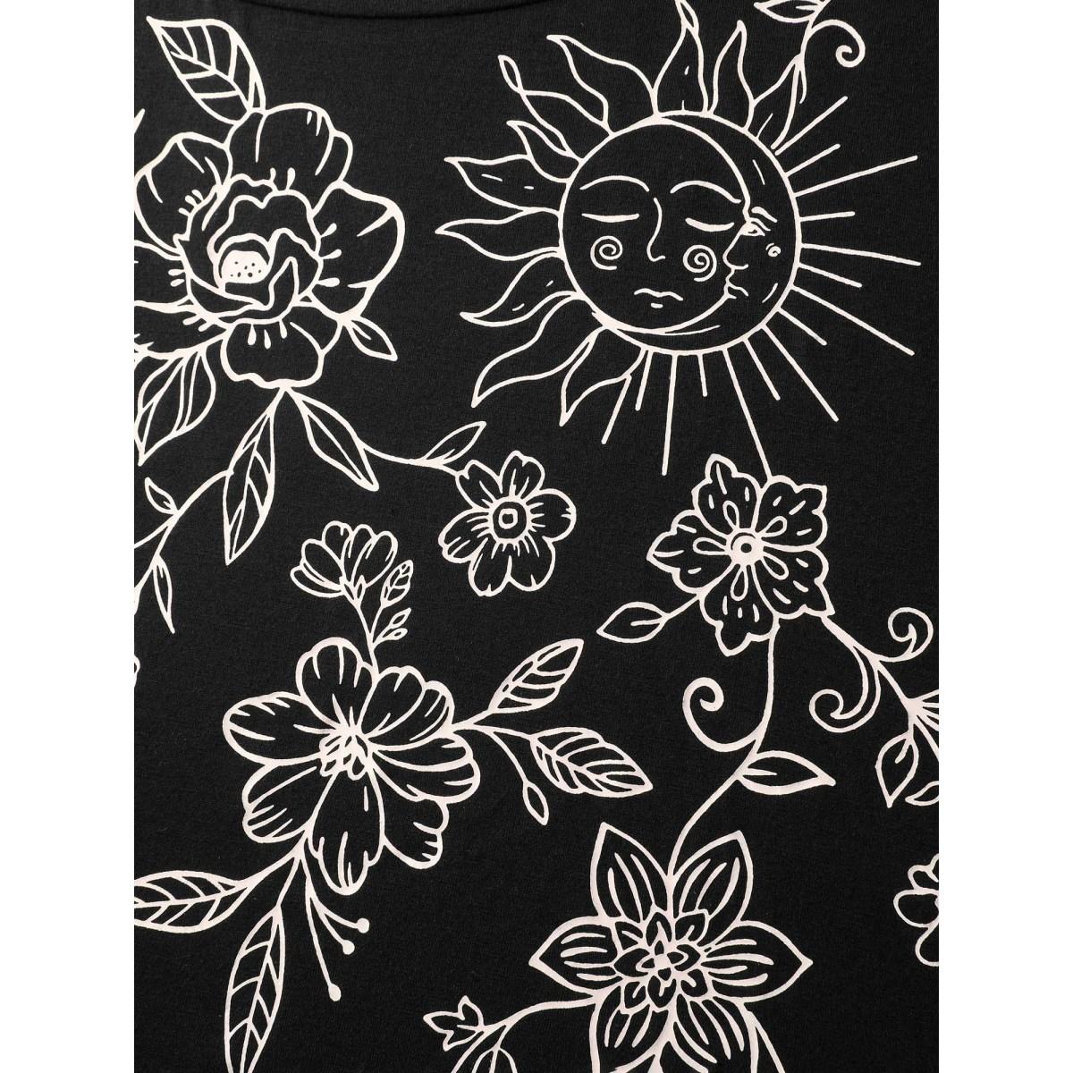 Plus Size Floral Print Stretchy Round Neck T-Shirt Black Women Leisure Non Round Neck Casual T-shirts BloomChic 22-24/3X