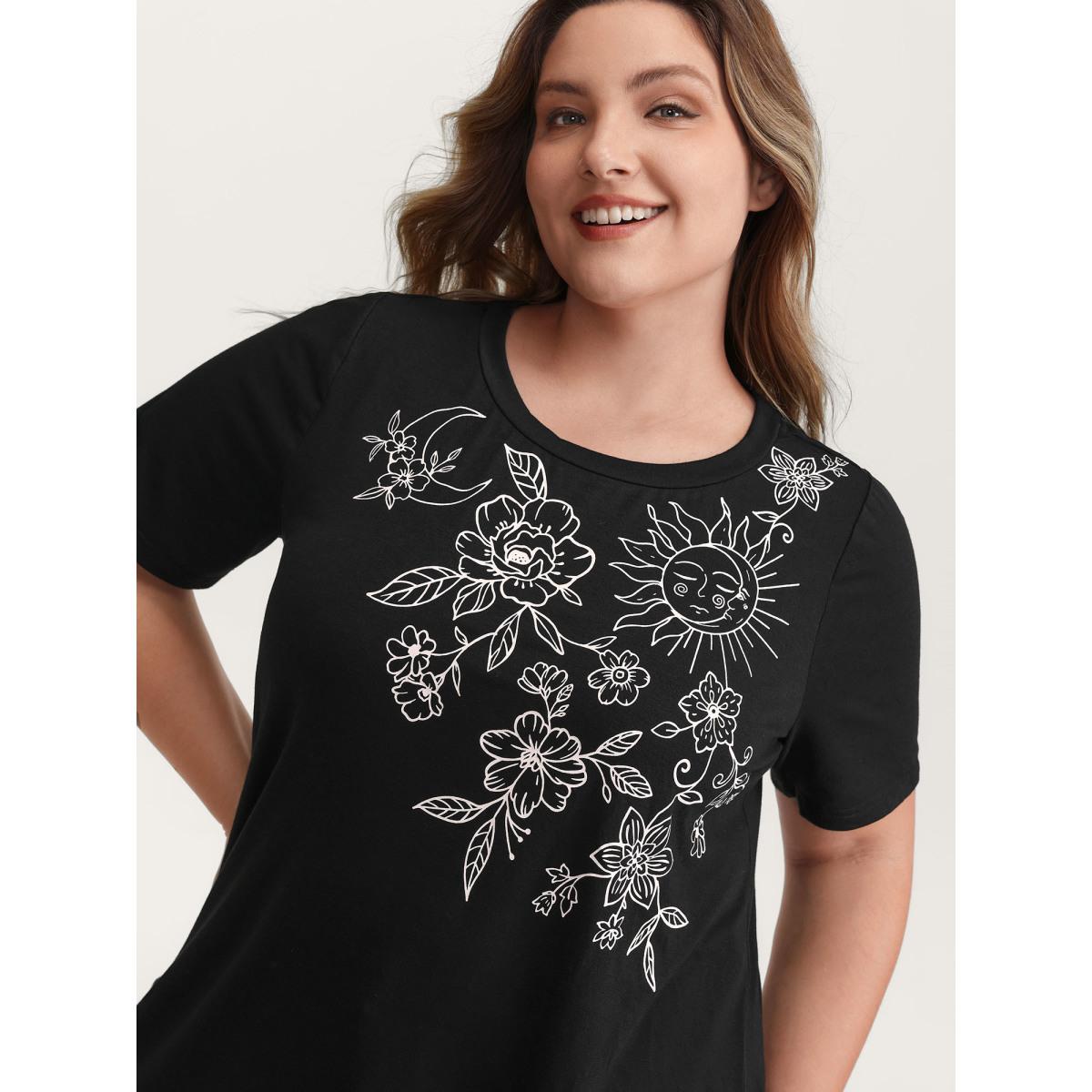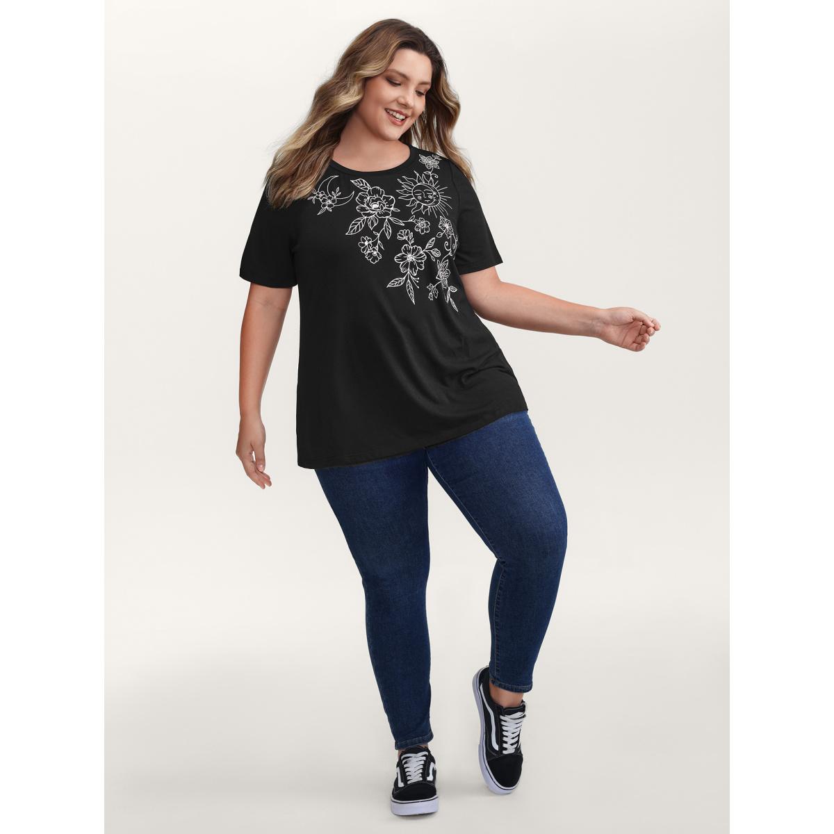 Plus Size Floral Crew Neck Stretchy T-Shirt Black Women Casual Non Natural Flowers Round Neck Everyday T-shirts BloomChic 10/M