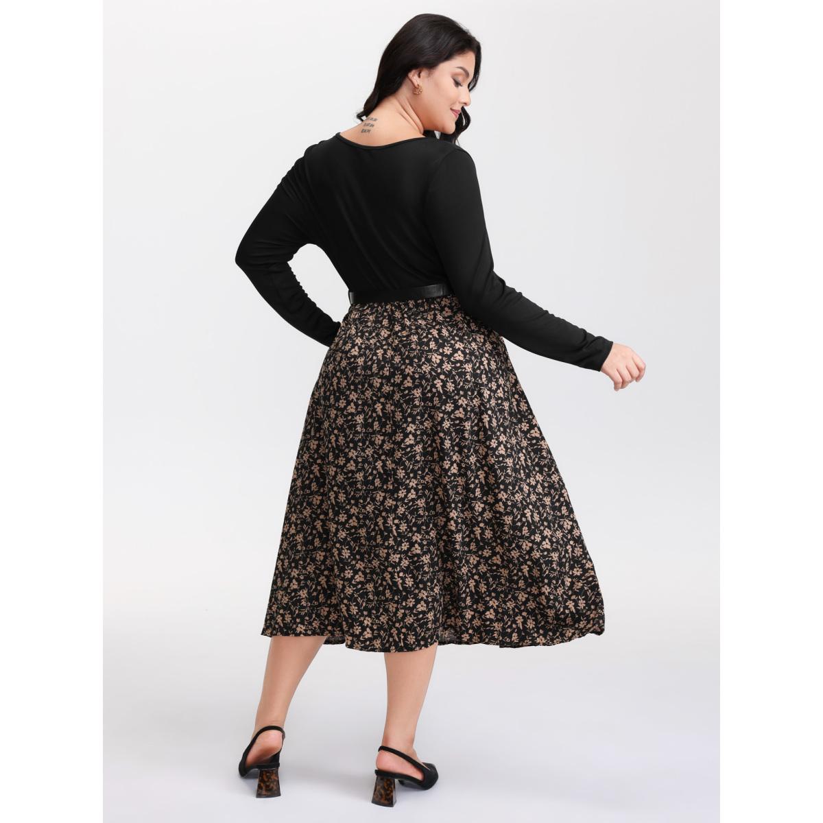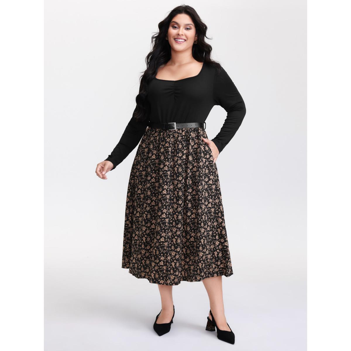 Plus Size Square Neck Floral Print Belted Contrast Dress Black Women Office Belted Square Neck Long Sleeve Curvy Midi Dress BloomChic 28/5X
