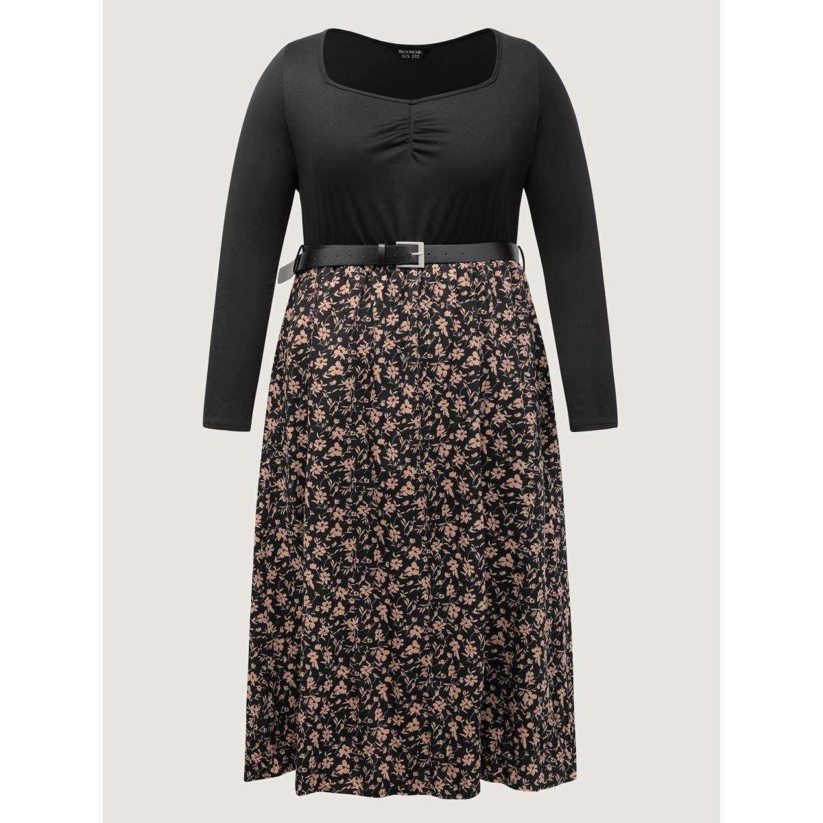 Plus Size Floral Contrast Ruched Square Neck Belted Dress Black Women Elegant Gathered Square Neck Long Sleeve Curvy Midi Dress BloomChic 14-16/1X