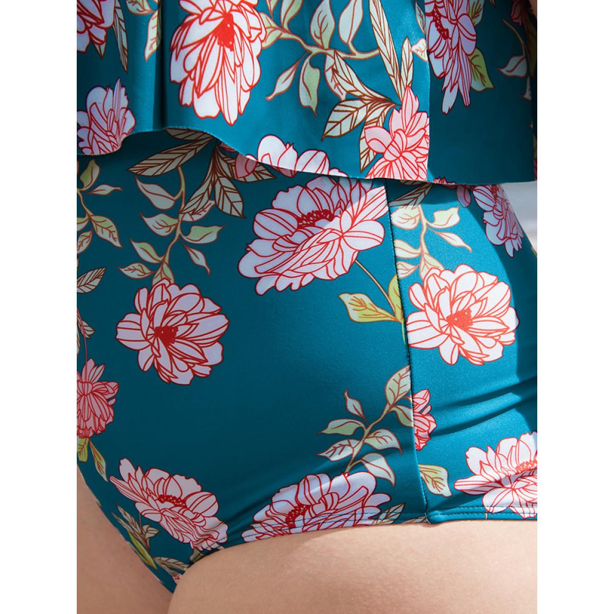 Plus Size Floral Sculpt Waist Ruffles Trim One Piece Swimsuit Women's Swimwear Emerald Vacation Adjustable Straps Curve Bathing Suits High stretch One Pieces BloomChic 28/5X
