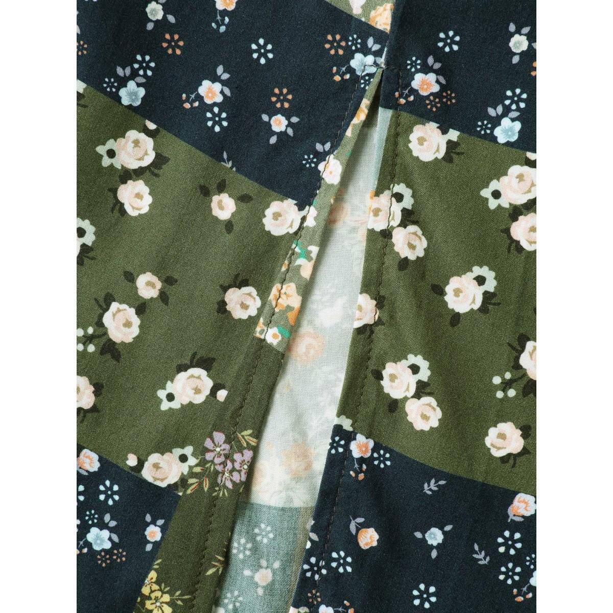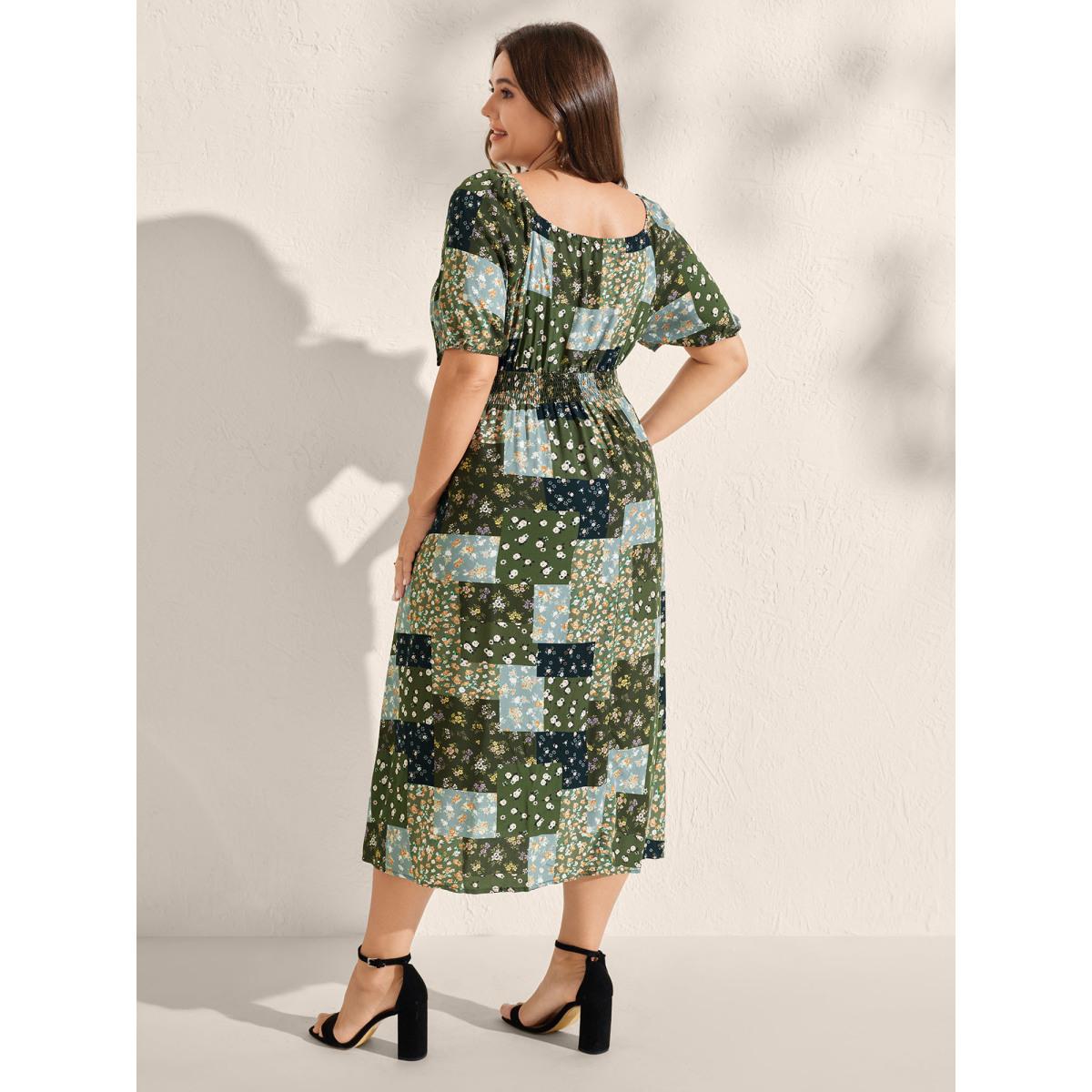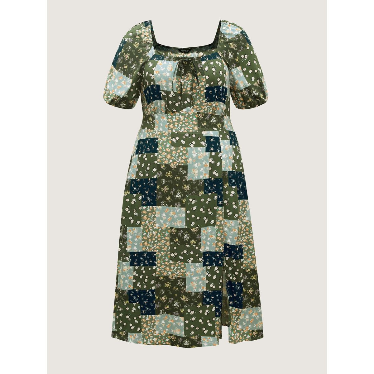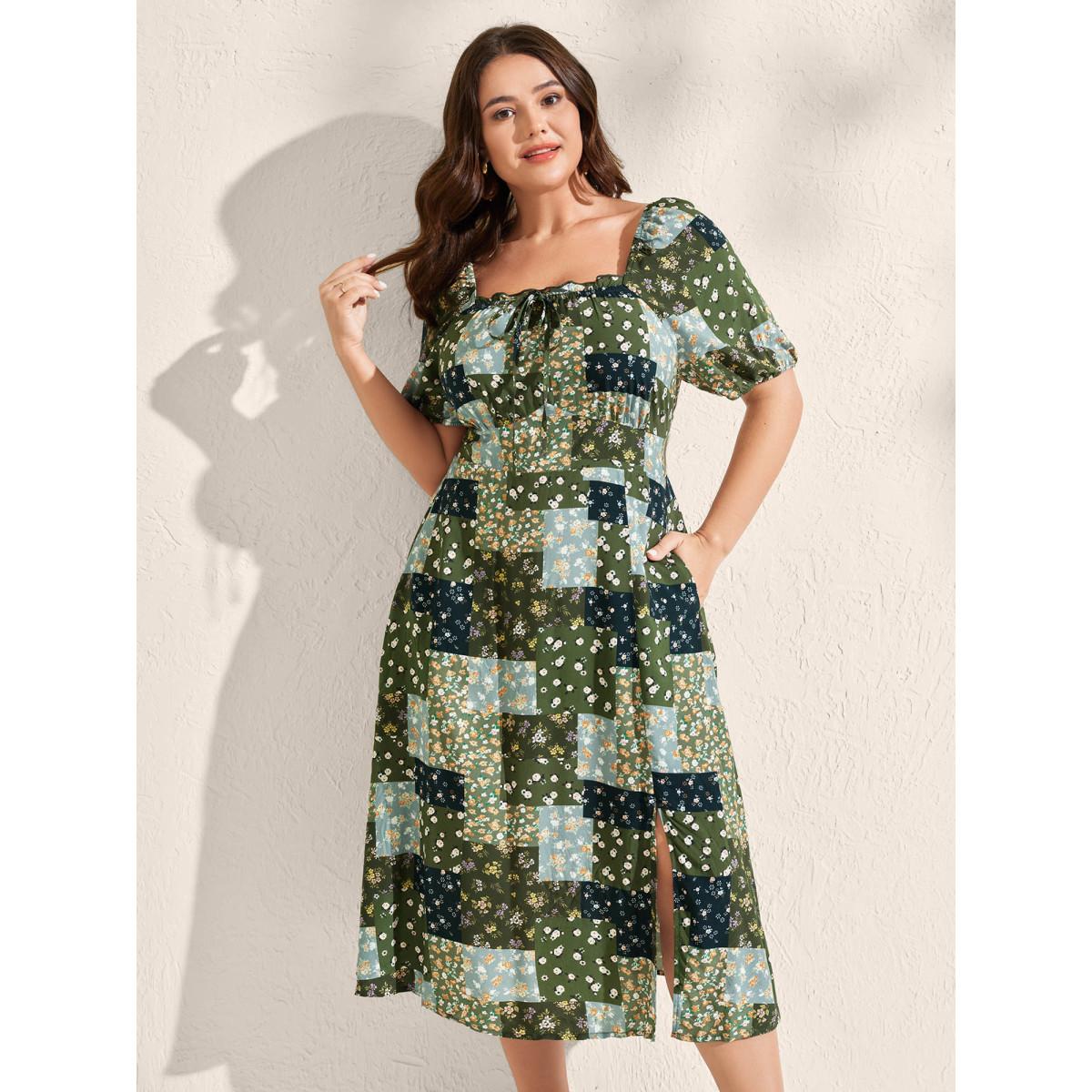 Plus Size Floral Split Hem Neck Tie Midi Dress Moss Women Timeless Gathered Heart neckline Short sleeve Curvy BloomChic 10/M