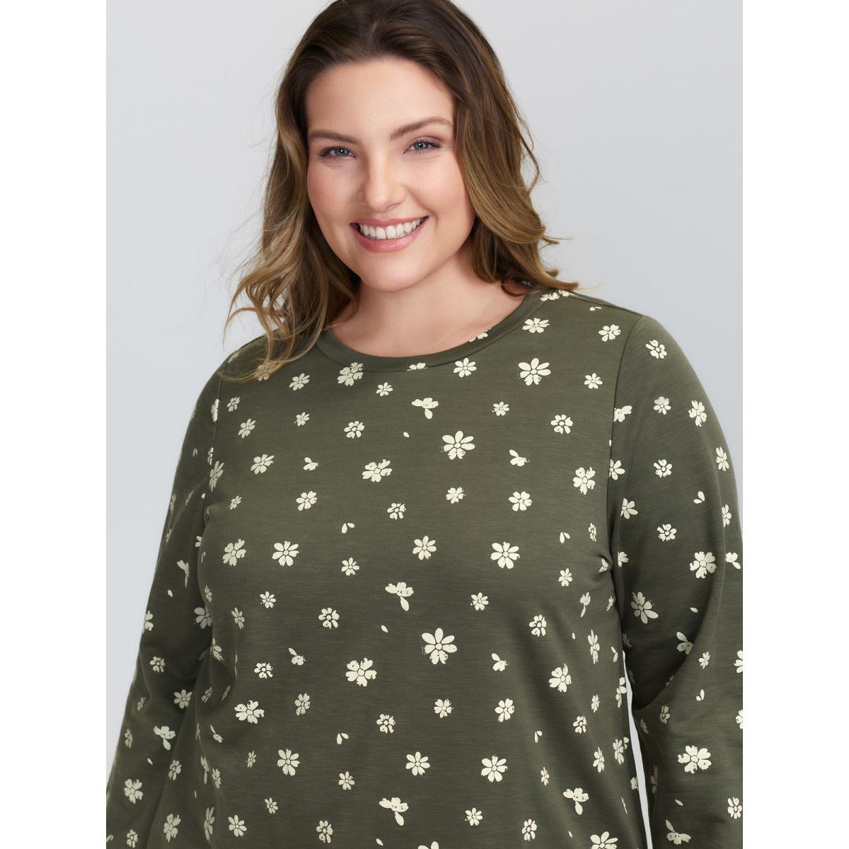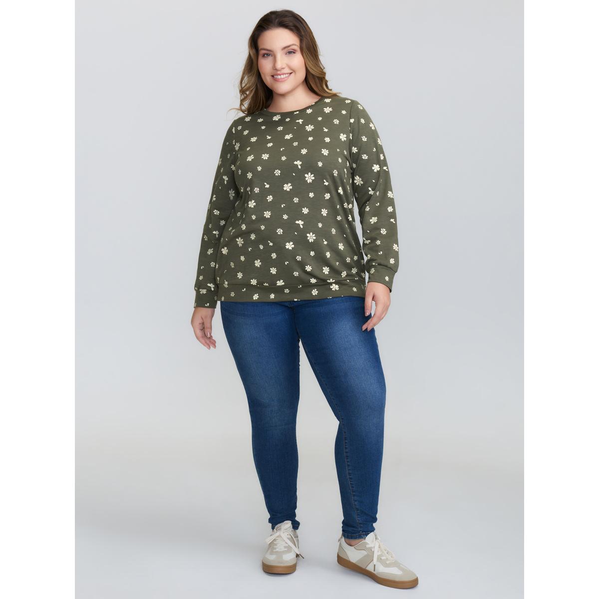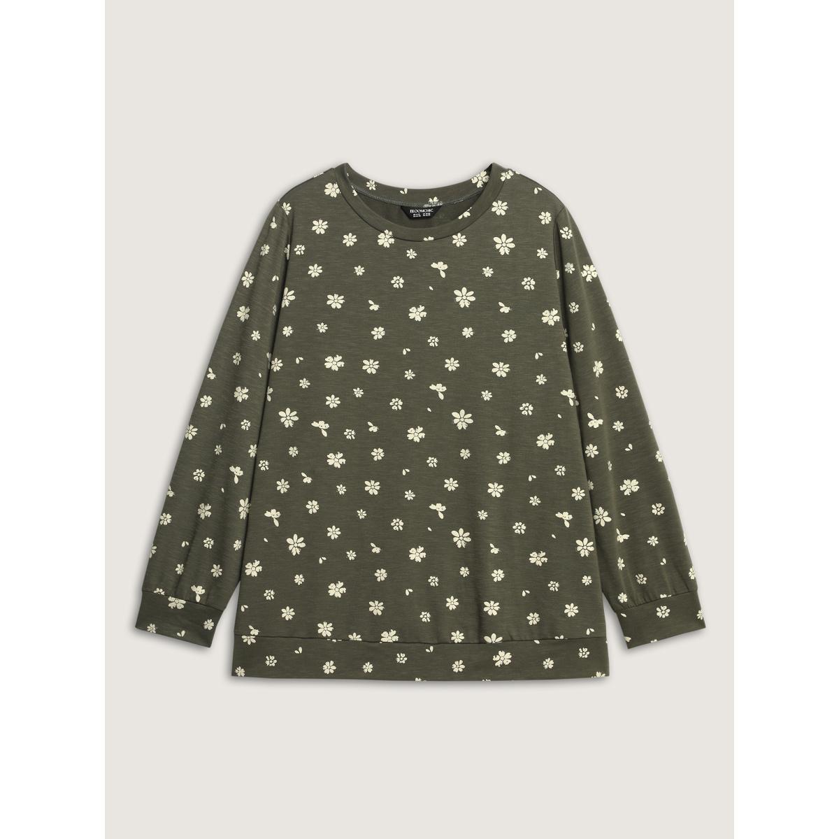 Plus Size Floral Print Round Neck Sweatshirt Women DarkGreen Casual Printed Dailywear Sweatshirts BloomChic 14-16/1X