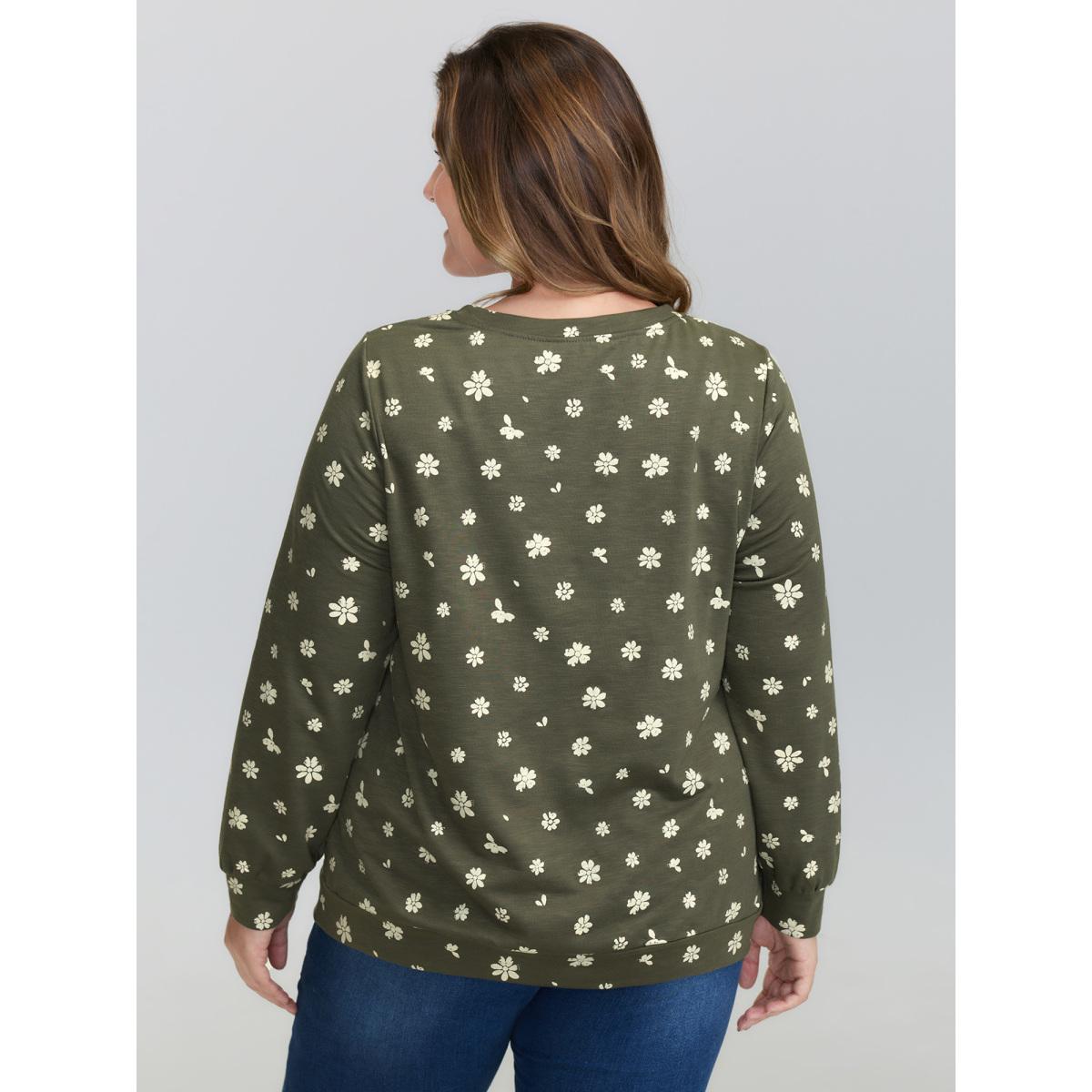 Plus Size Floral Stretchy Textured Printed Sweatshirt Women ArmyGreen Leisure Round Neck Casual Sweatshirts BloomChic 12/L