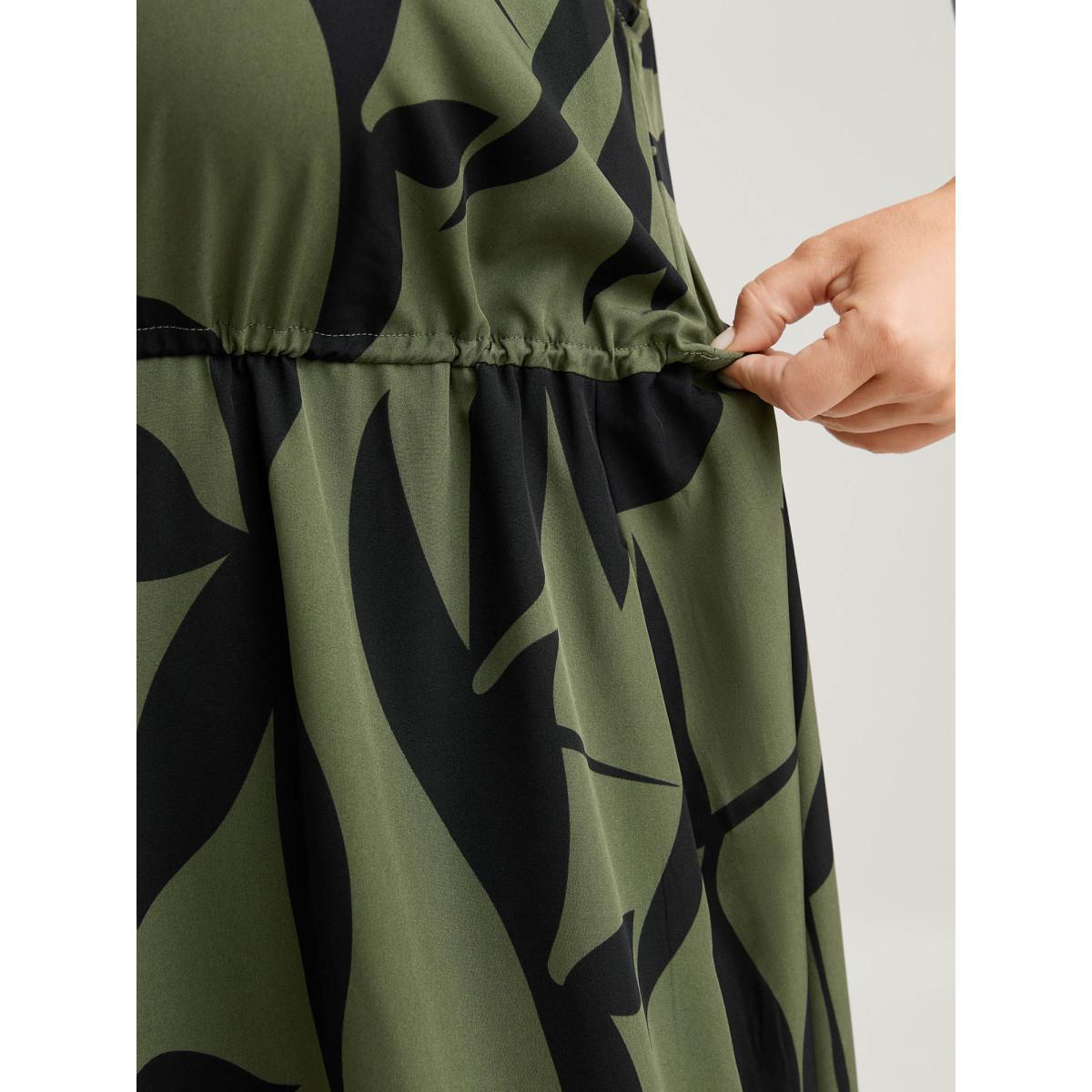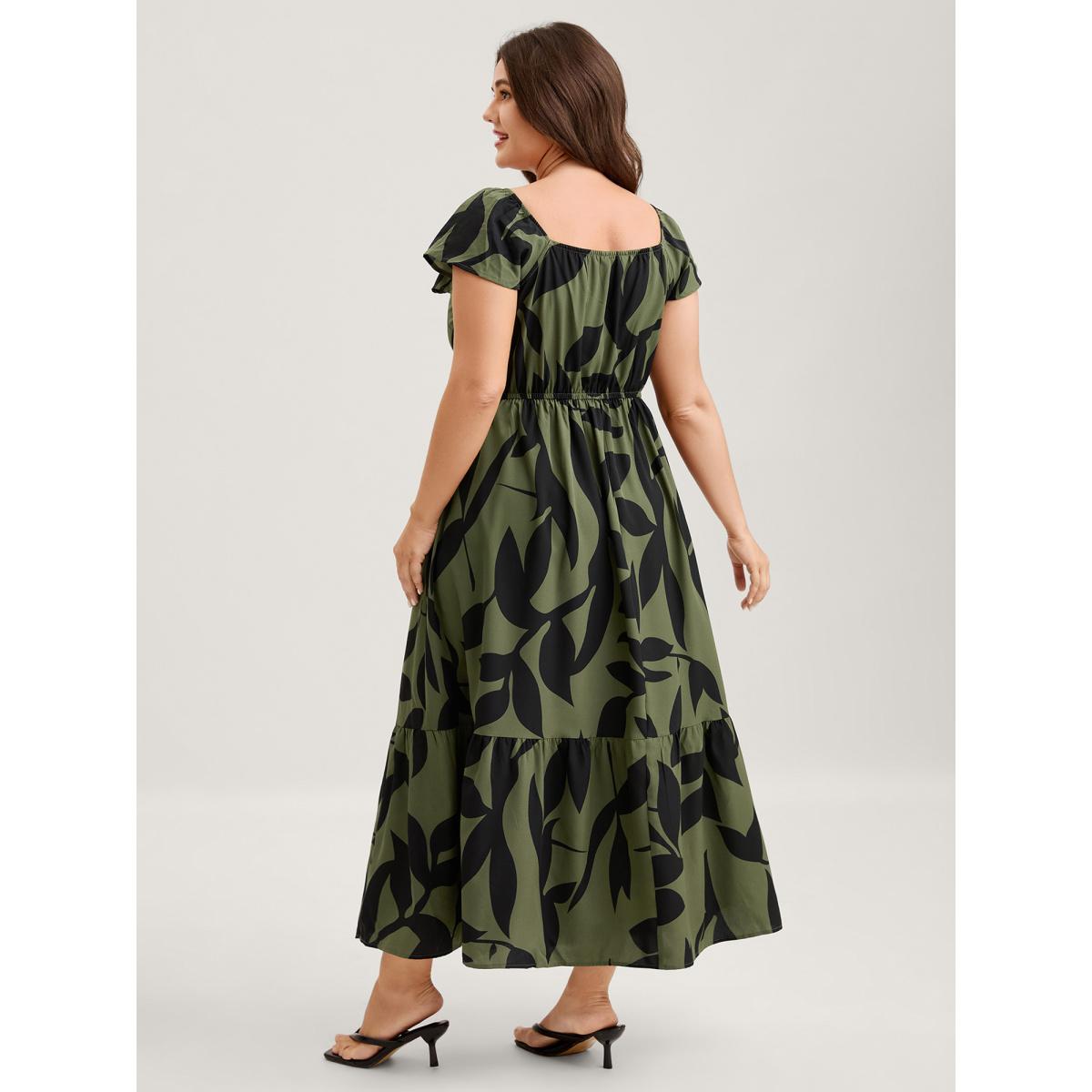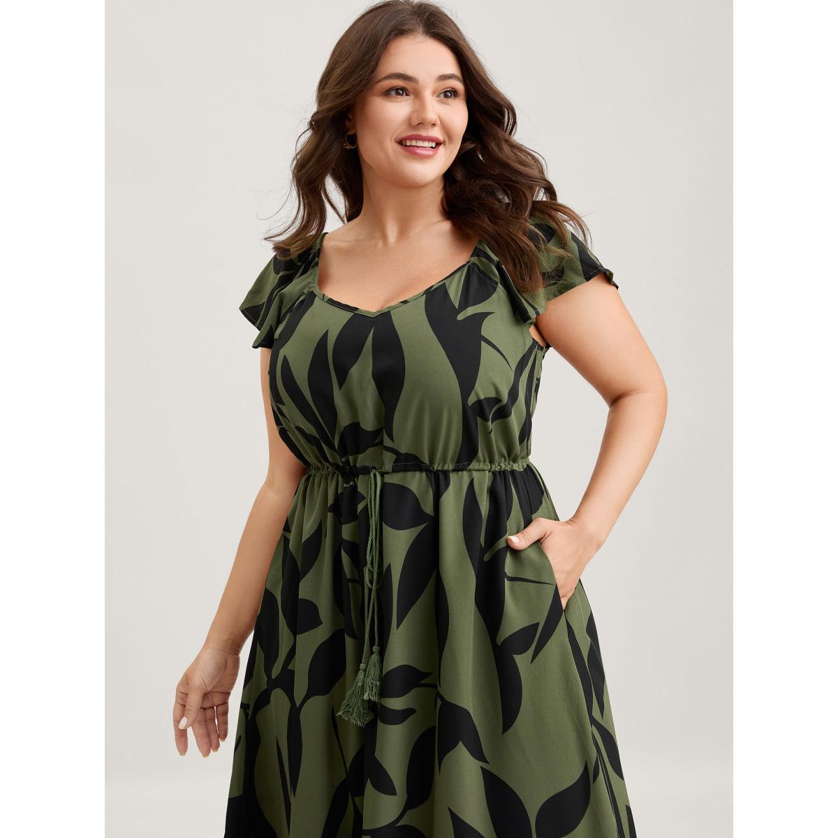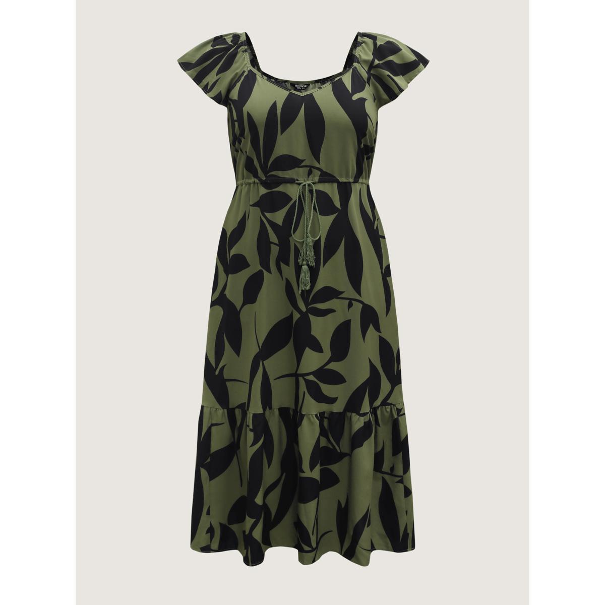 Plus Size Floral Waist-Cinched Drawstring Maxi Dress ArmyGreen Women Timeless Ruffles Heart neckline Cap Sleeve Curvy BloomChic 26/4X
