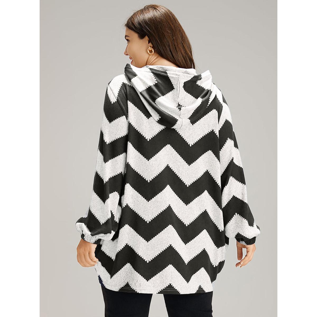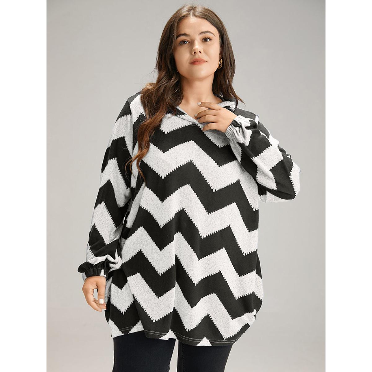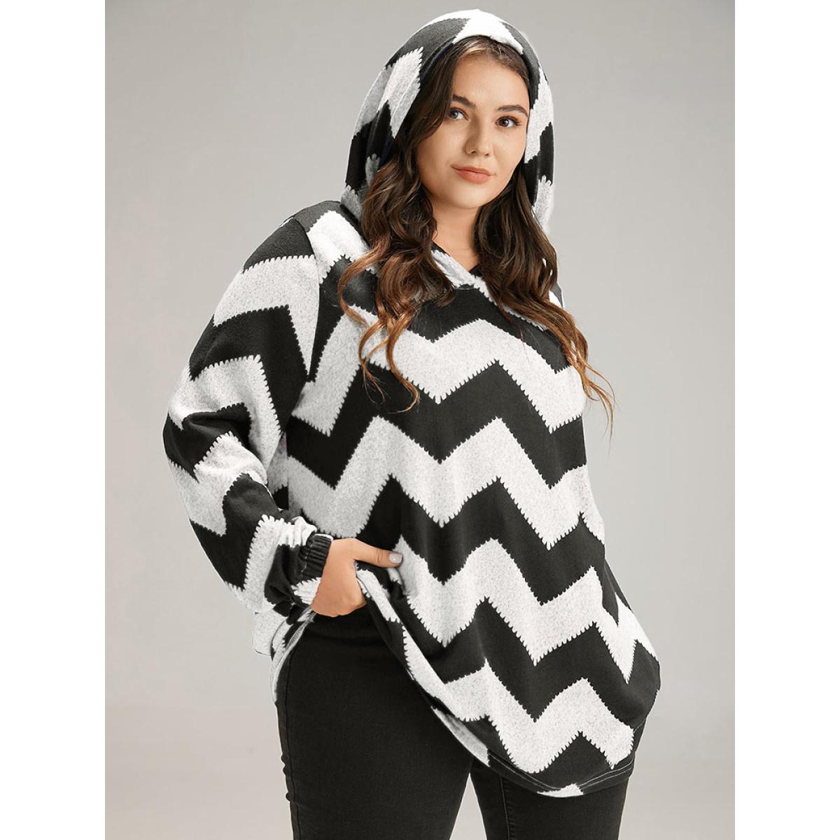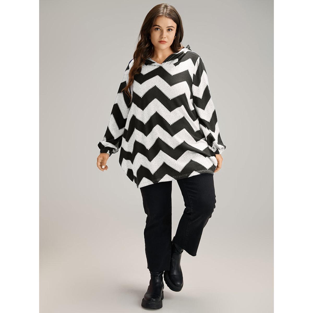 Plus Size Geo Striped Hooded Elastic Cuffs T-shirt Black Women Casual Elastic cuffs Geometric Hooded Dailywear T-shirts BloomChic 18-20/2X