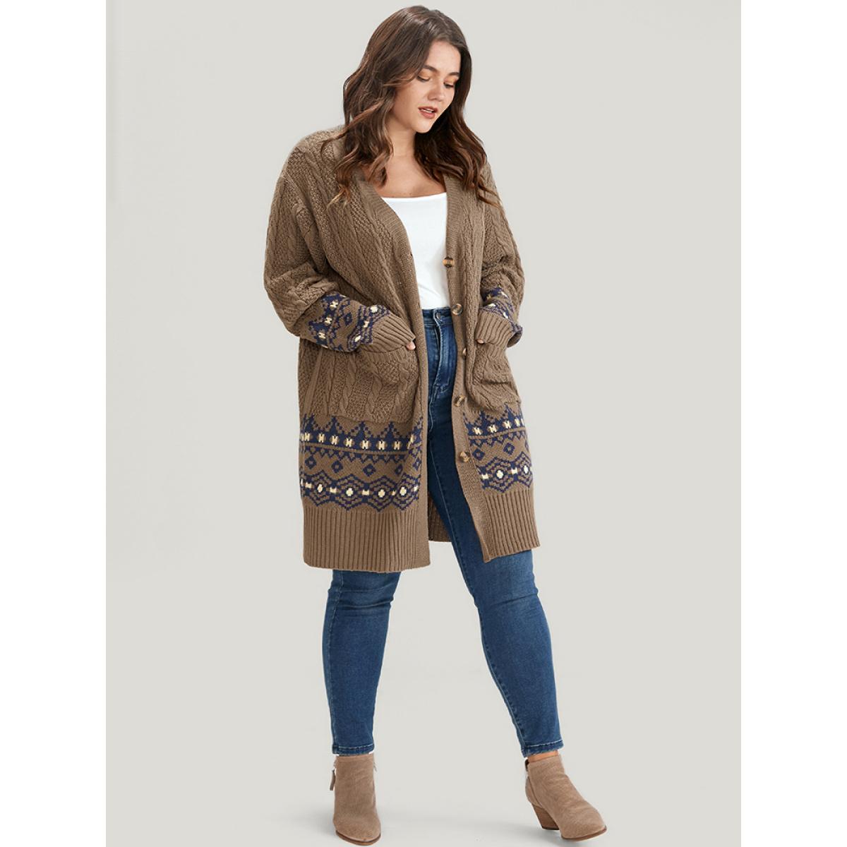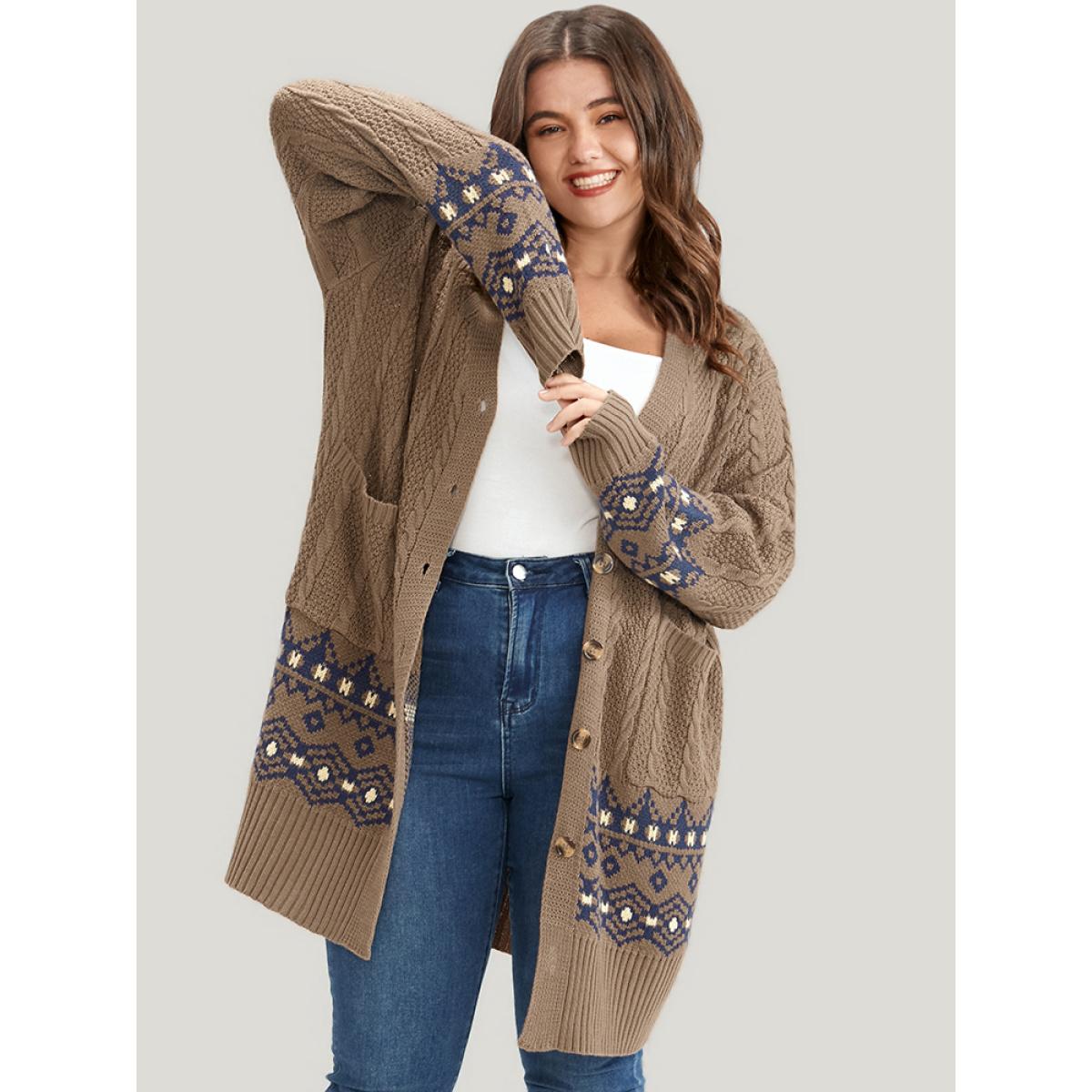 Plus Size Geometric Contrast Pointelle Knit Pocket Cable Knit Button Front Cardigan Bronze Women Elegant Loose Long Sleeve Dailywear Cardigans BloomChic 10/M