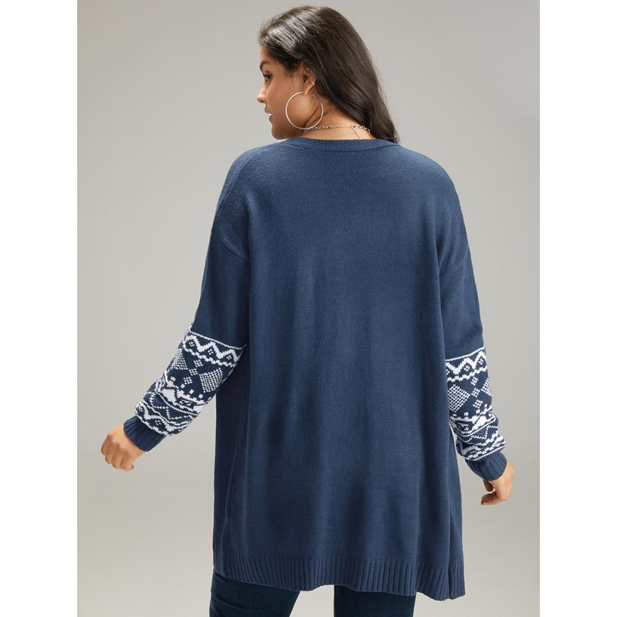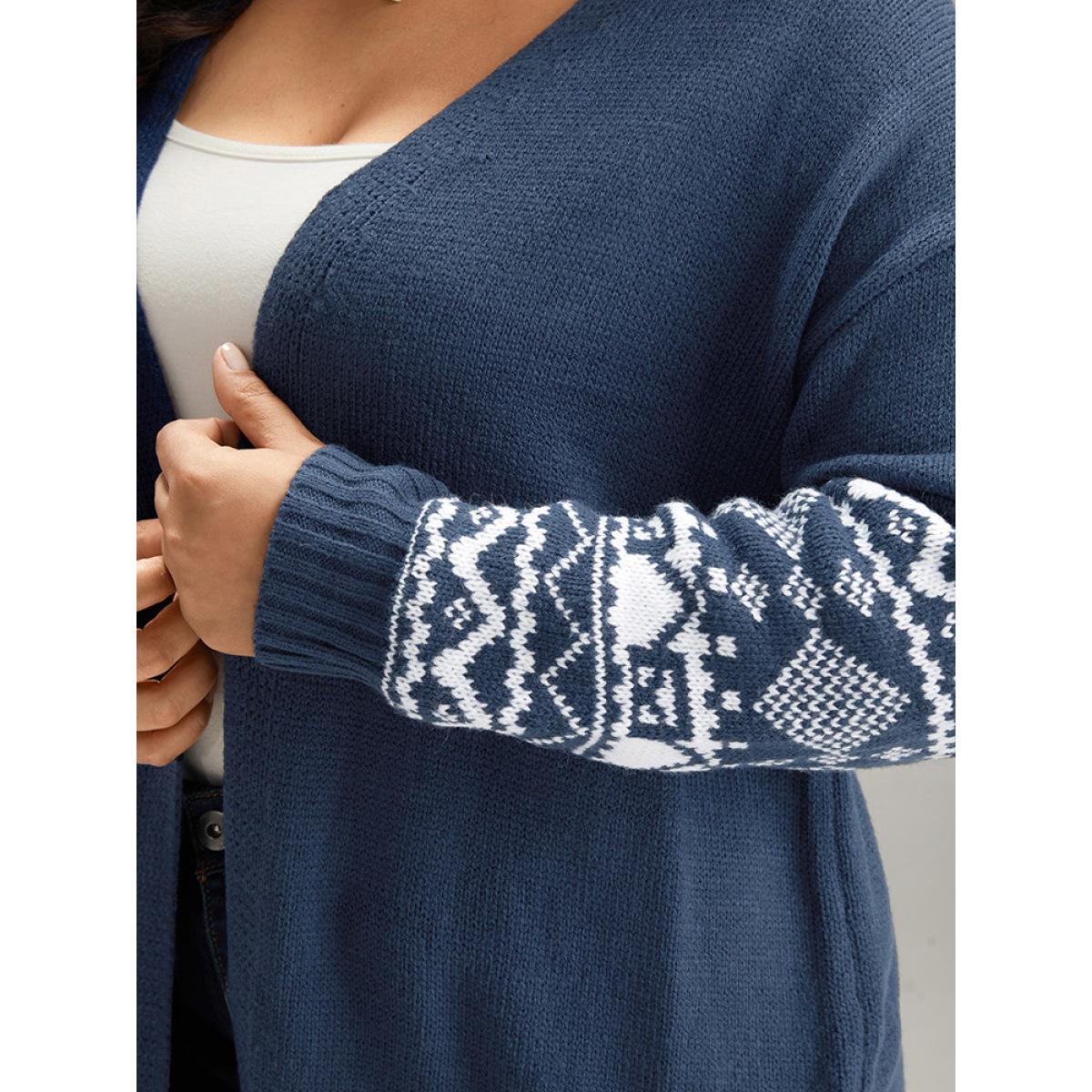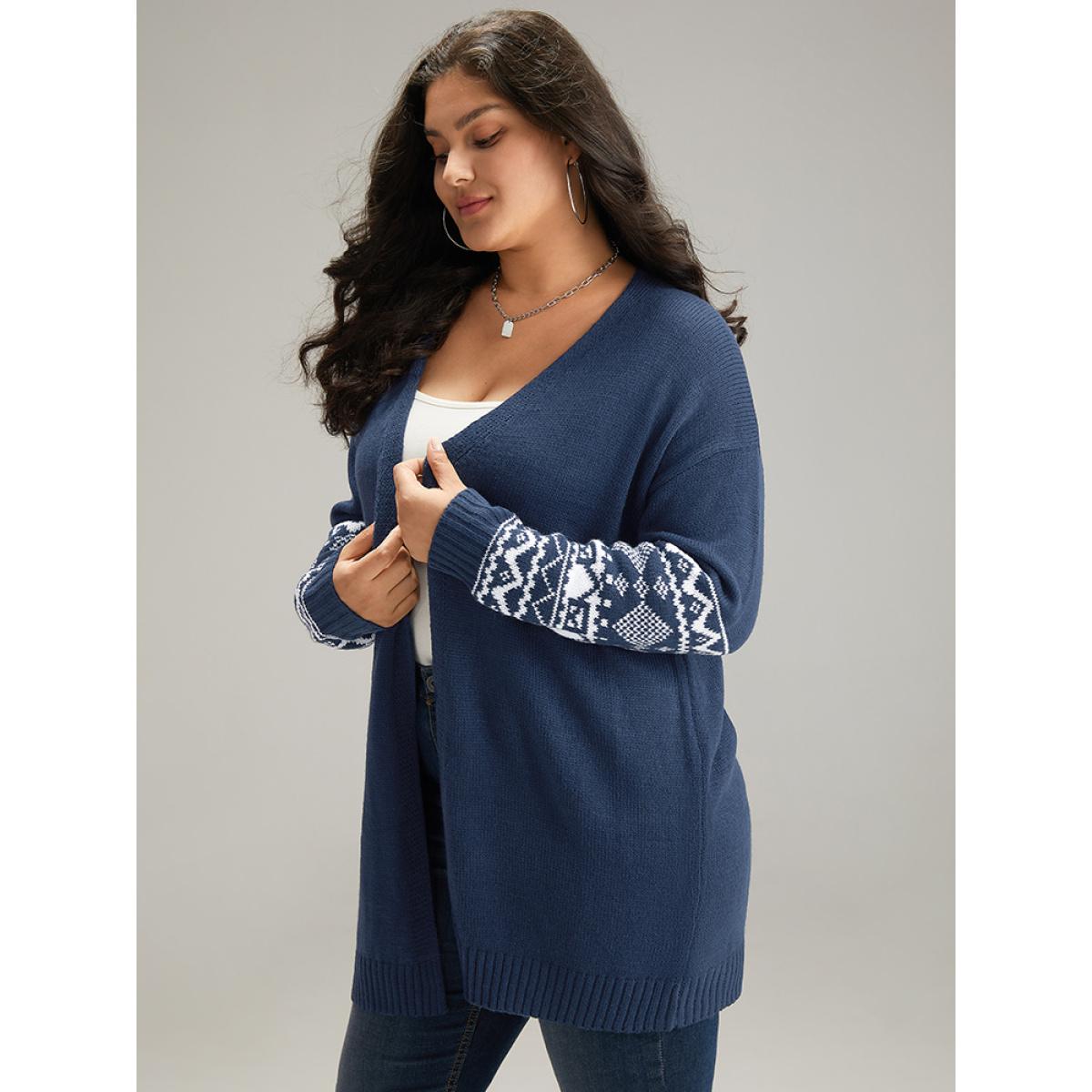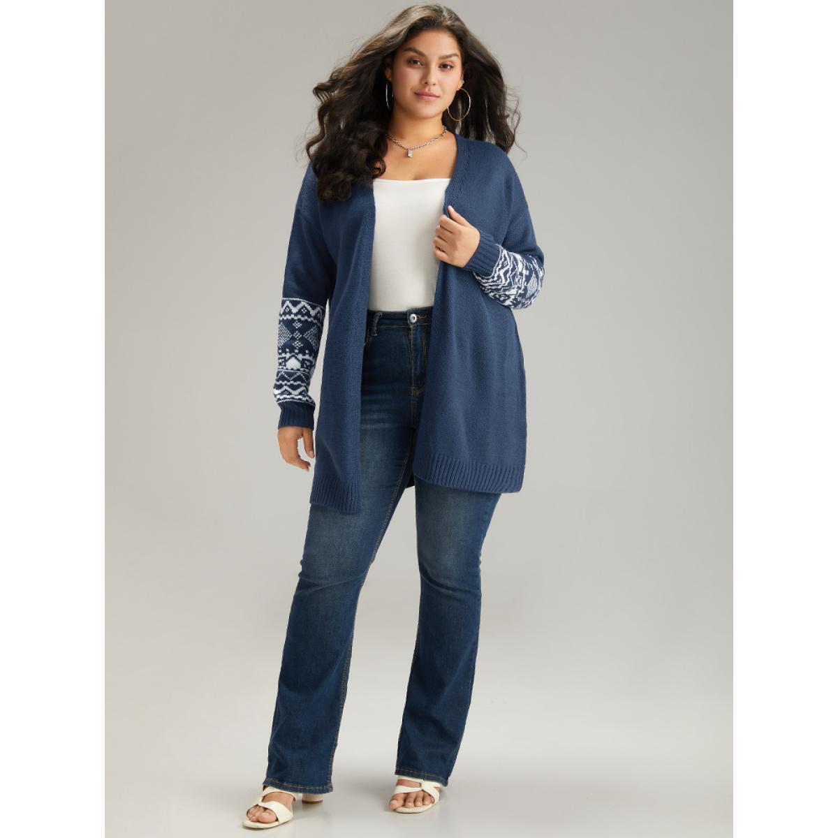 Plus Size Geometric Graphic Open Front Tunic Cardigan Indigo Women Casual Loose Long Sleeve Dailywear Cardigans BloomChic 28/5X