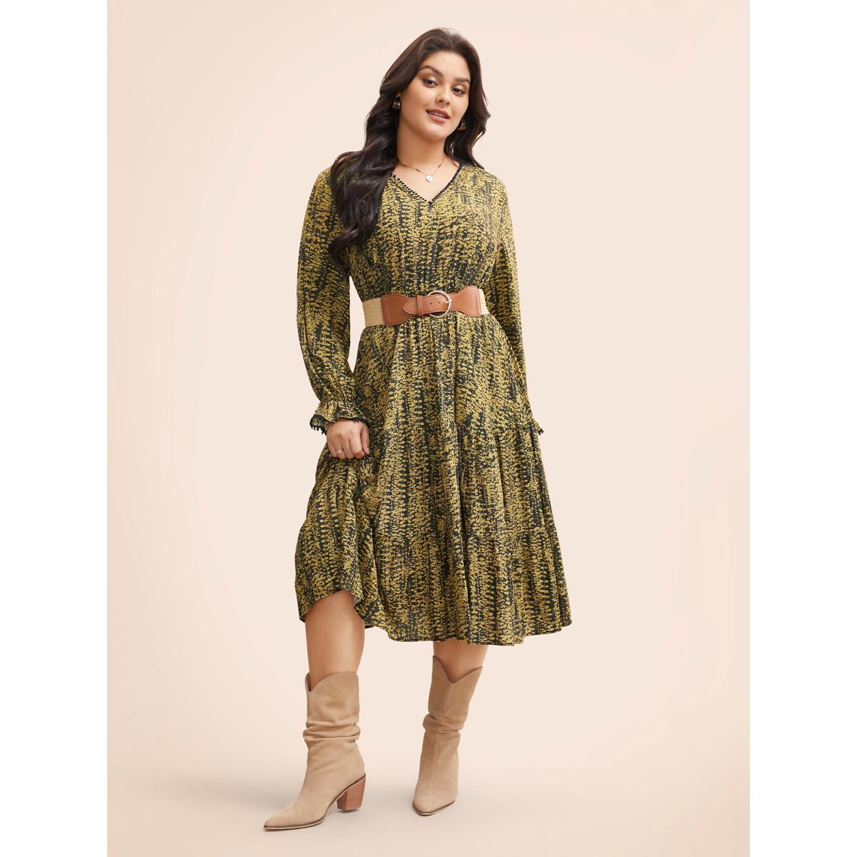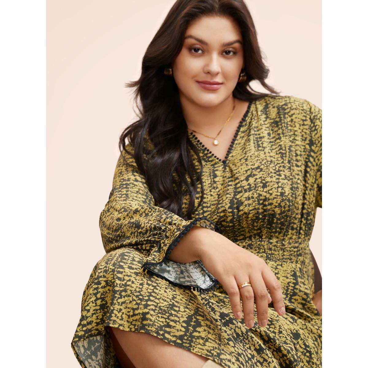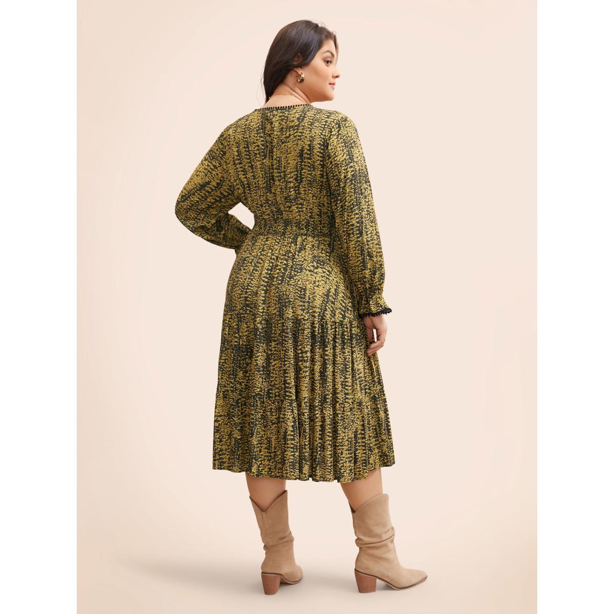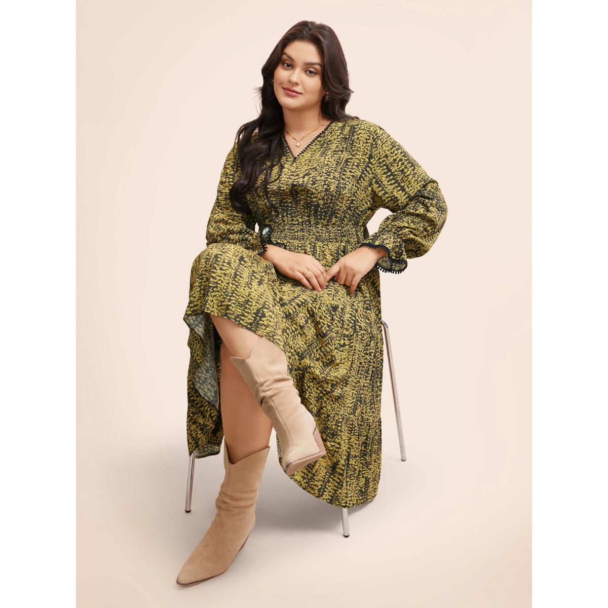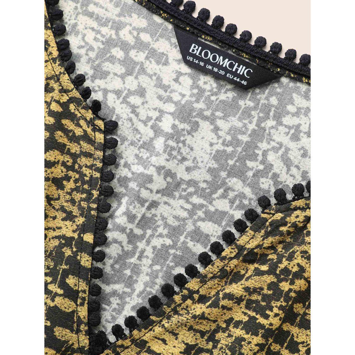 Plus Size Geometric Print Pompom Trim Ruffles Dress Black Women Resort Woven ribbon&lace trim V-neck Long Sleeve Curvy BloomChic 18-20/2X