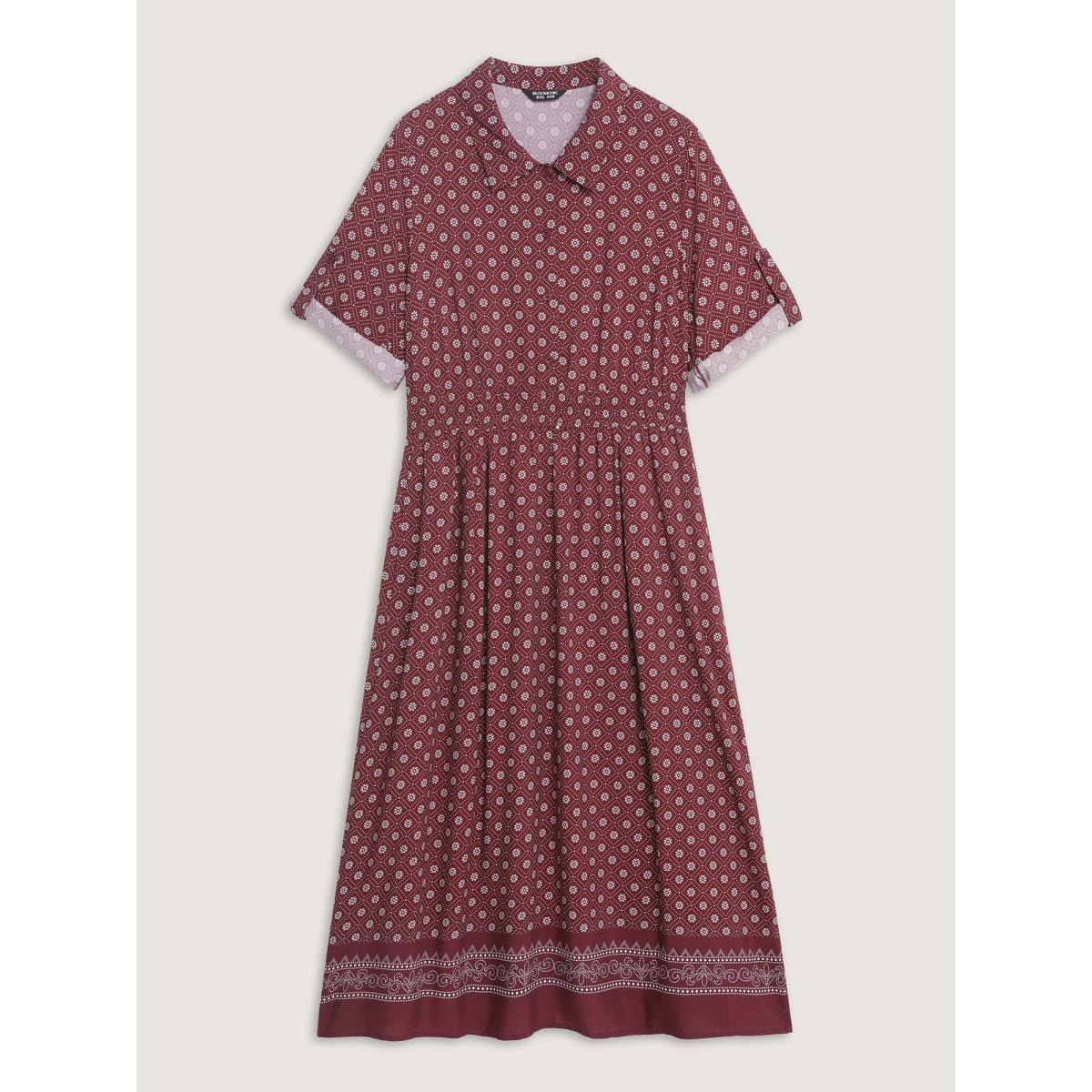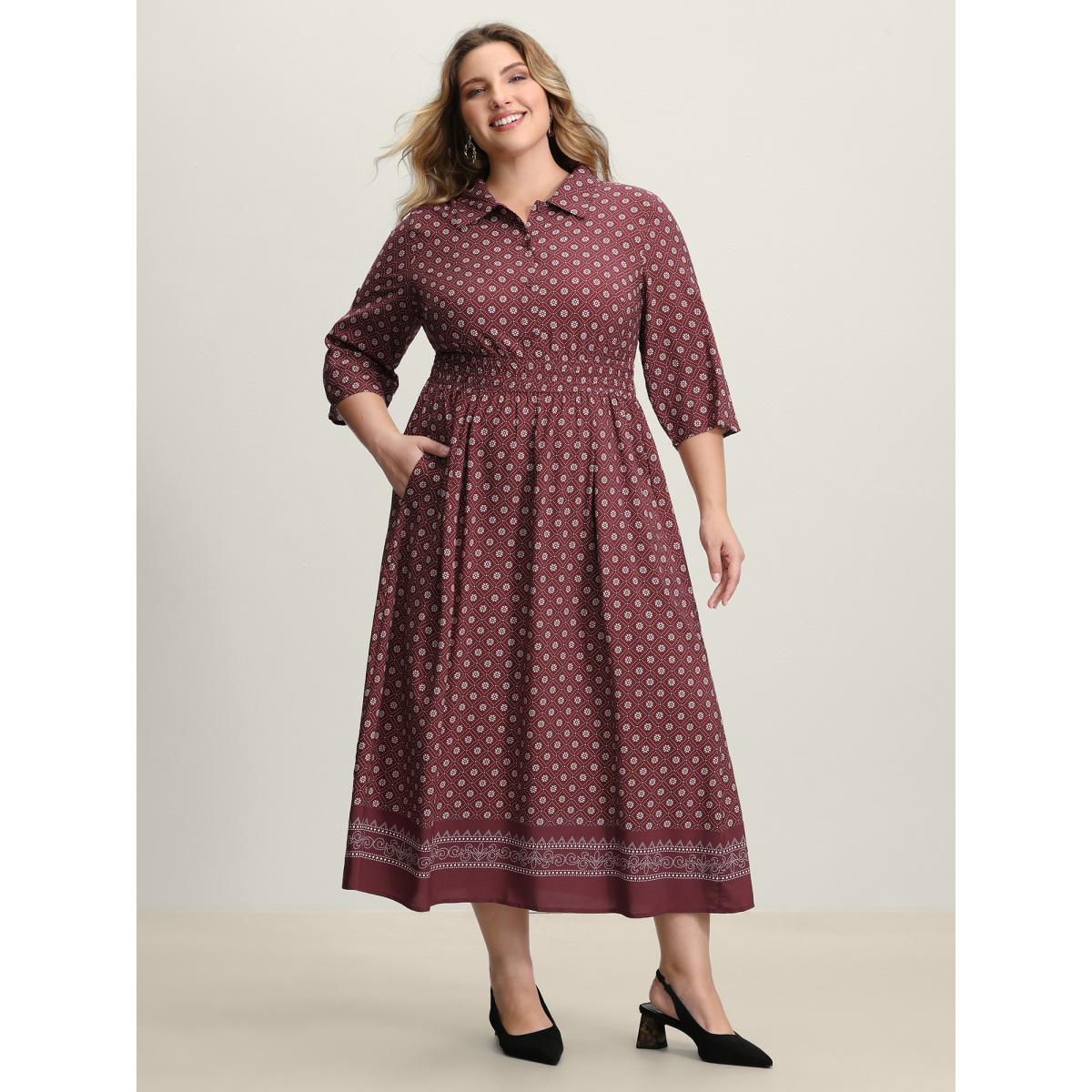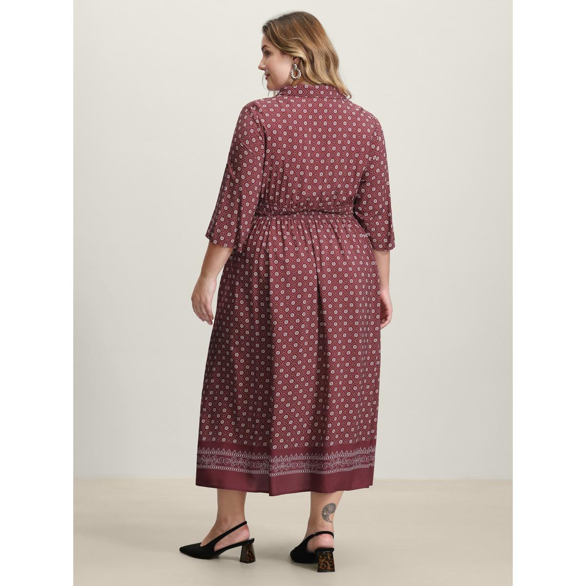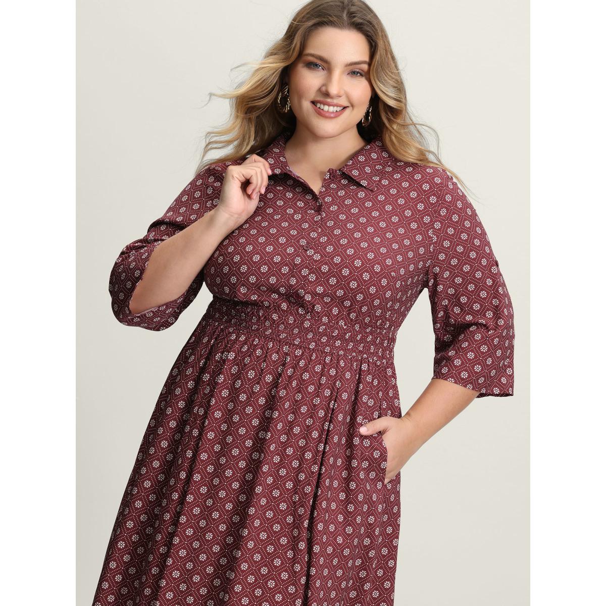 Plus Size Geometric Print Shirred Waist Maxi Dress Deepred Women Office Button Shirt collar Elbow-length sleeve Curvy BloomChic 12/L