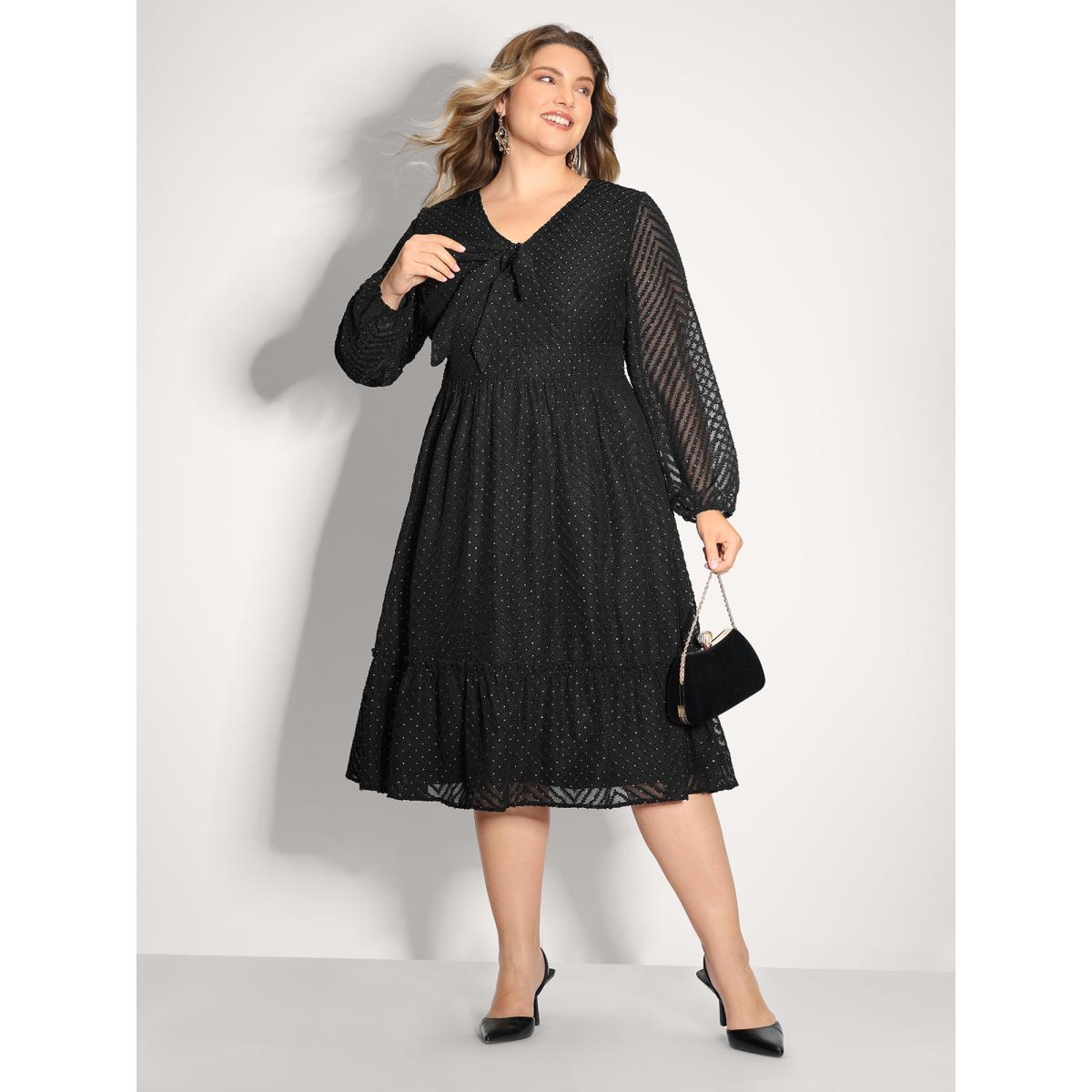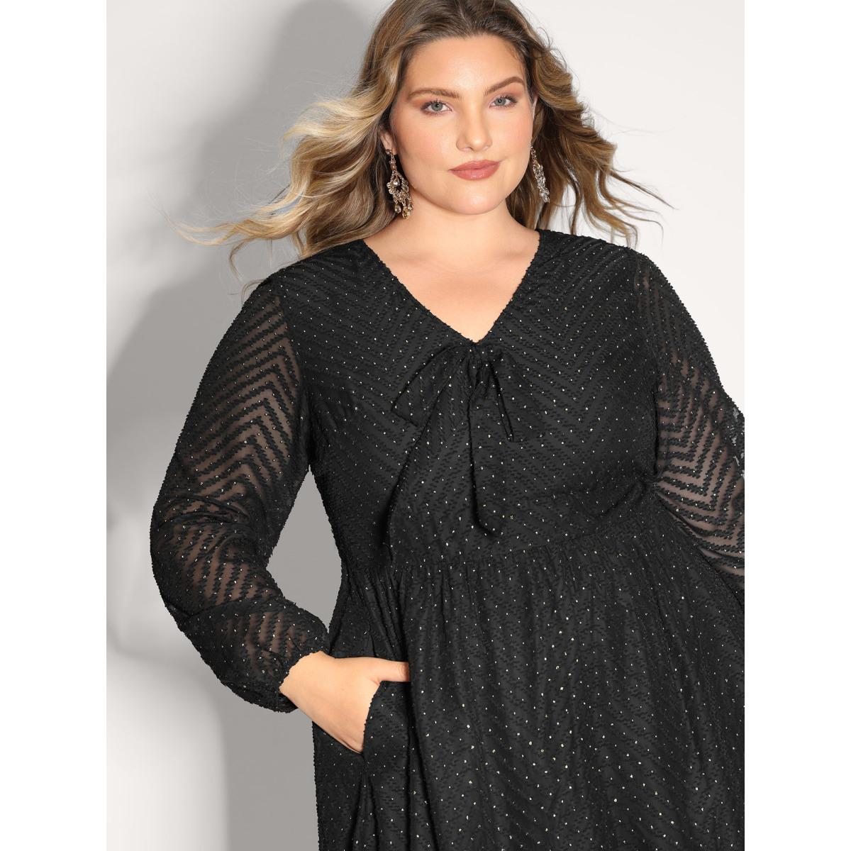 Plus Size Solid Sequin Knotted Side Wrap Lantern Sleeve Dress Black Women Party Knotted V-neck Long Sleeve Curvy Midi Dress BloomChic 26/4X