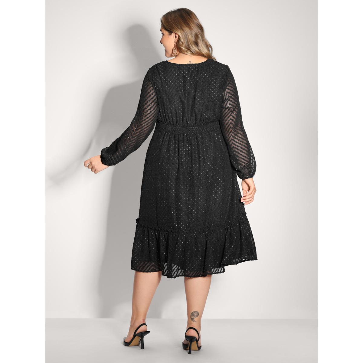 Plus Size Glitter Contrast Lace Wrap Elastic Waist Dress Black Women Party Elastic cuffs Overlap Collar Long Sleeve Curvy Midi Dress BloomChic 26/4X