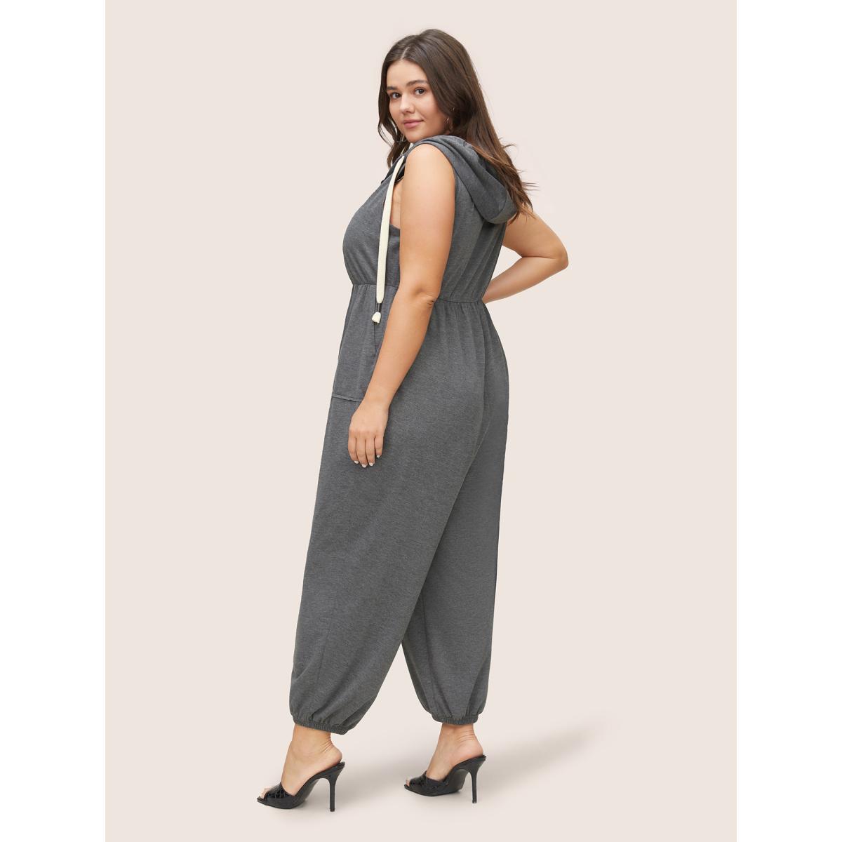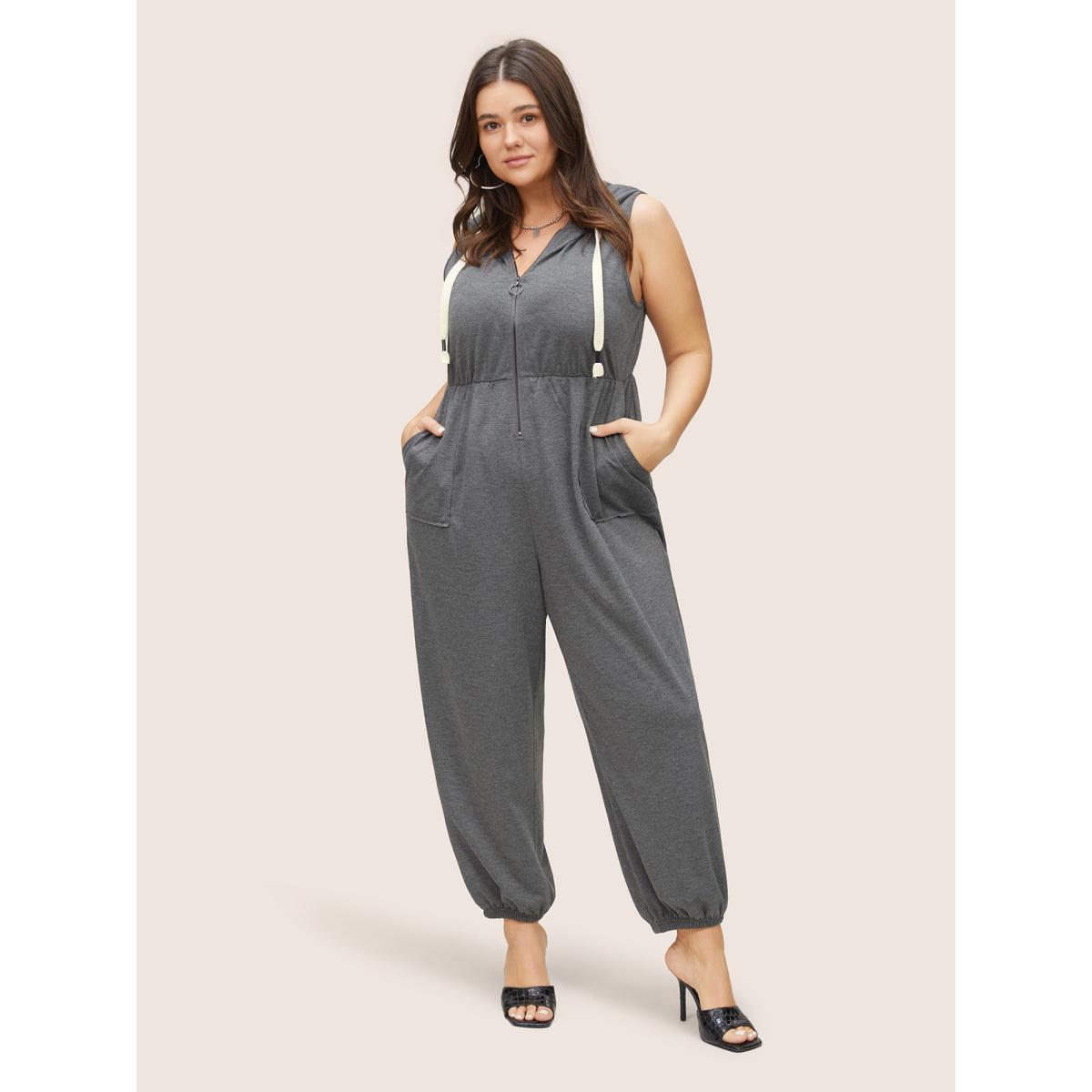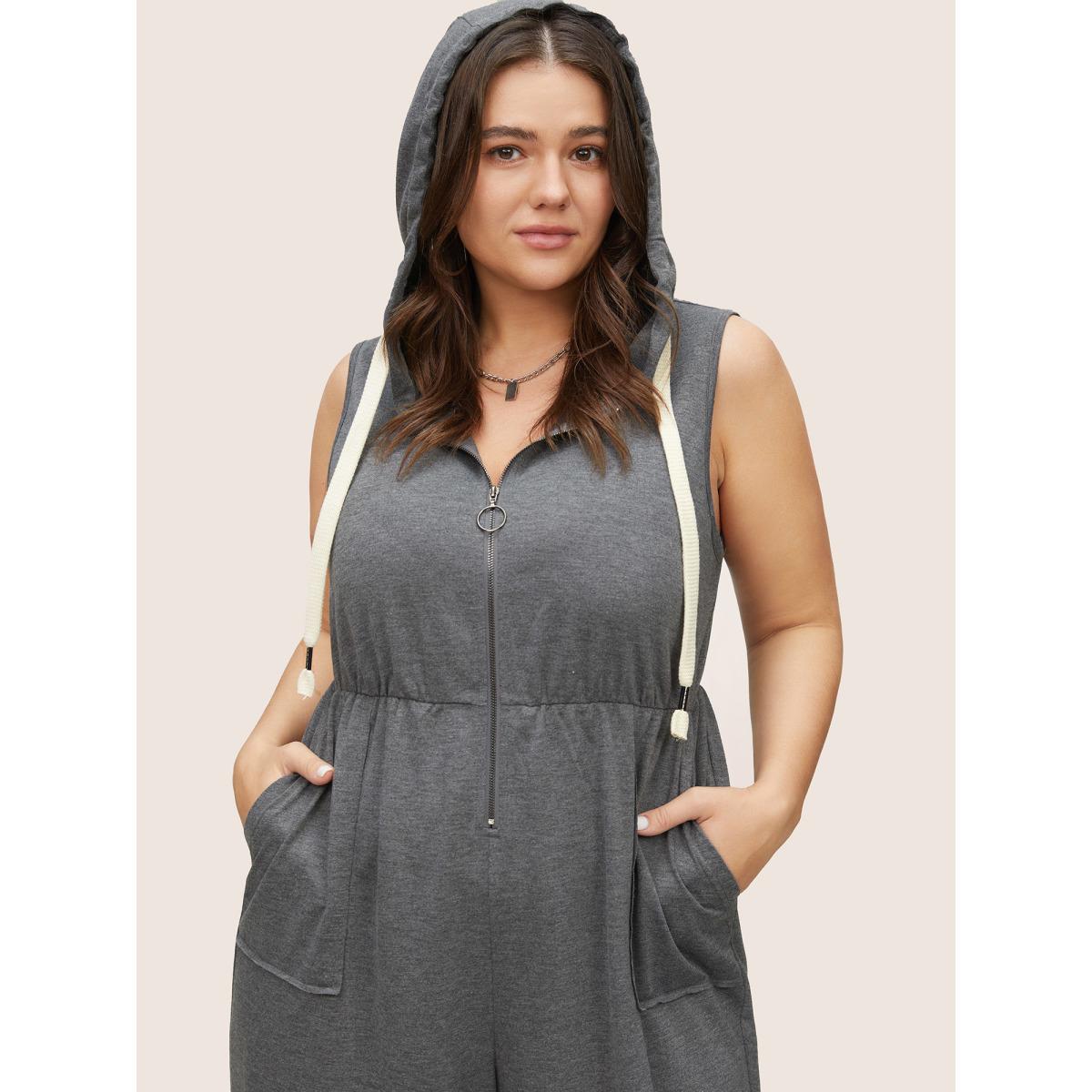 Plus Size Gray Solid O Ring Zipper Sleeveless Drawstring Jumpsuit Women Casual Sleeveless Hooded Everyday Loose Jumpsuits BloomChic 12/L