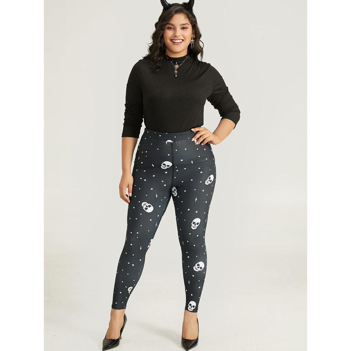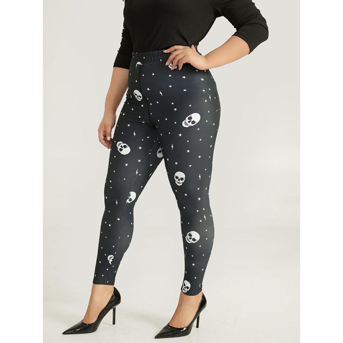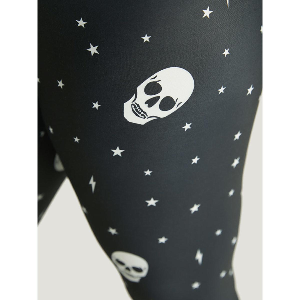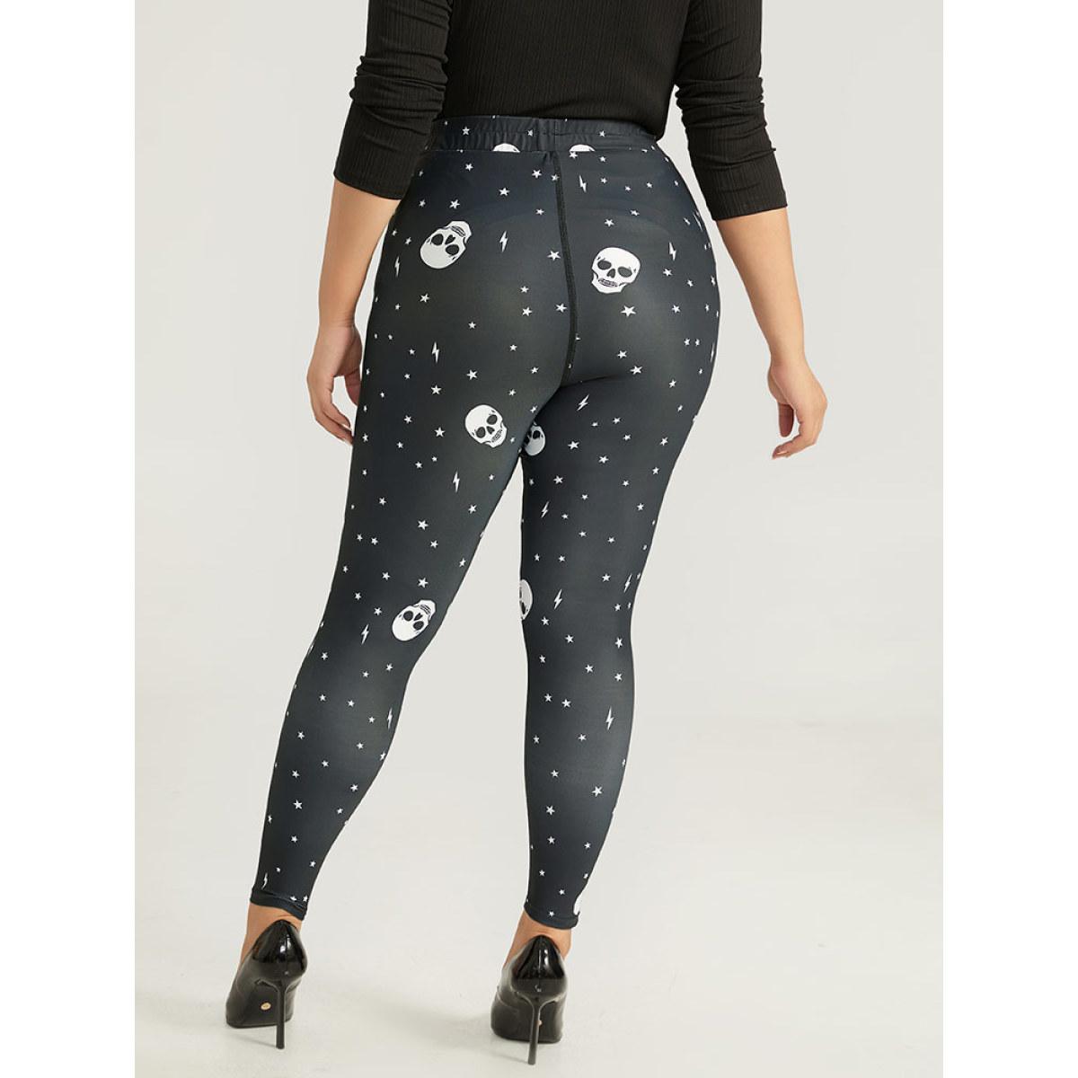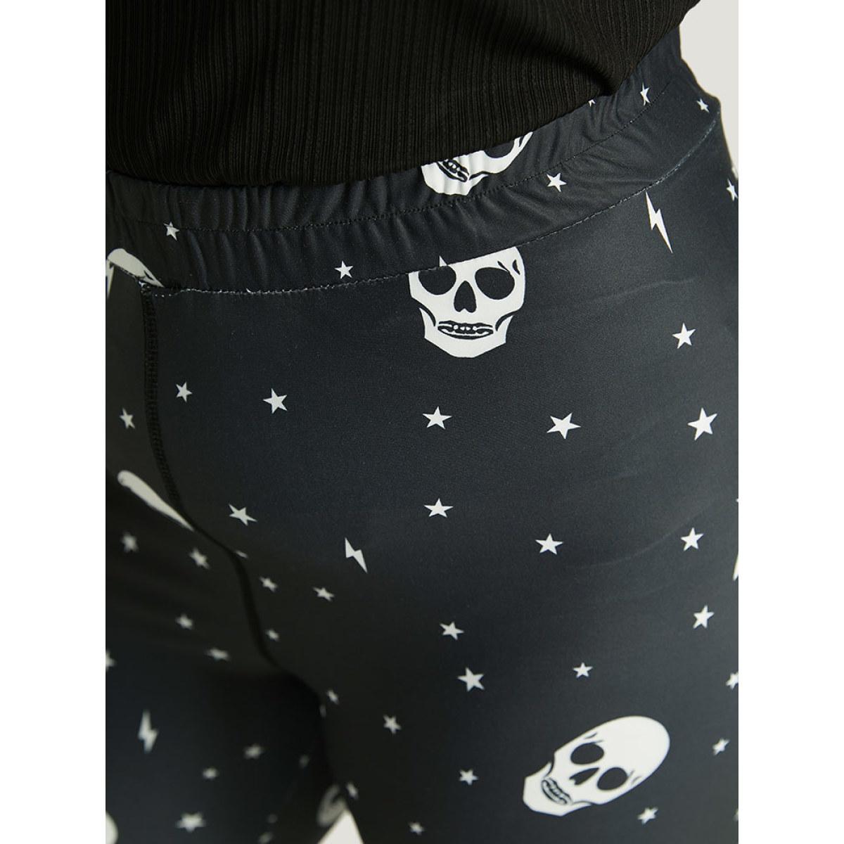 Plus Size Halloween Skull & Star Print Elastic Waist Leggings Women Black Elegant High stretch Skinny High Rise Festival-Halloween Leggings BloomChic 10/M