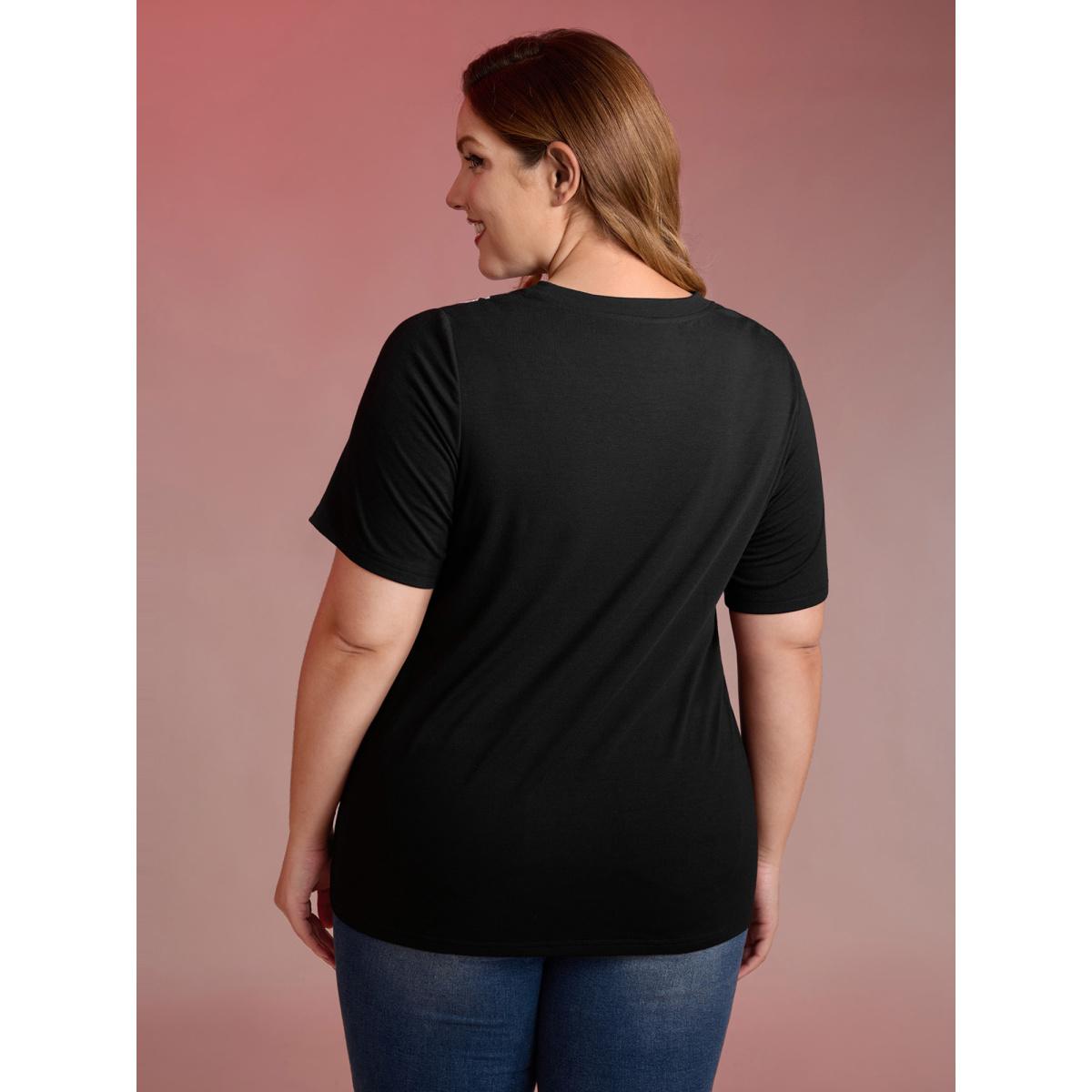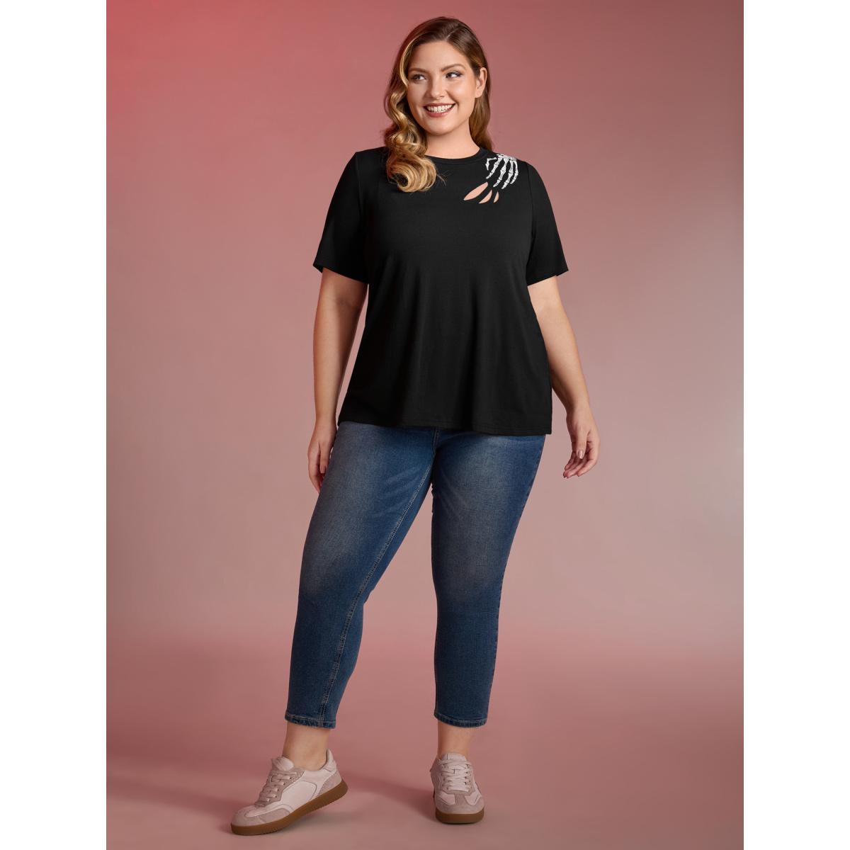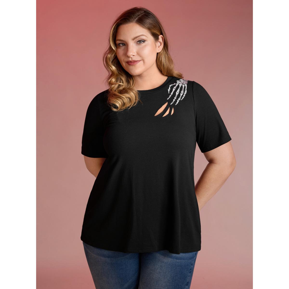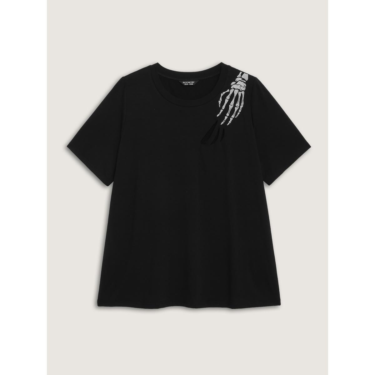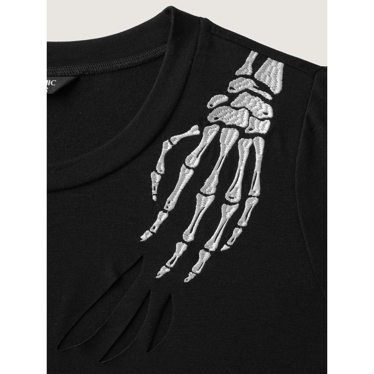 Plus Size Haunted Skeleton Hand Embroidery T-Shirt Black Women Leisure Cut-Out Graphic-Halloween Round Neck Casual T-shirts BloomChic 10/M