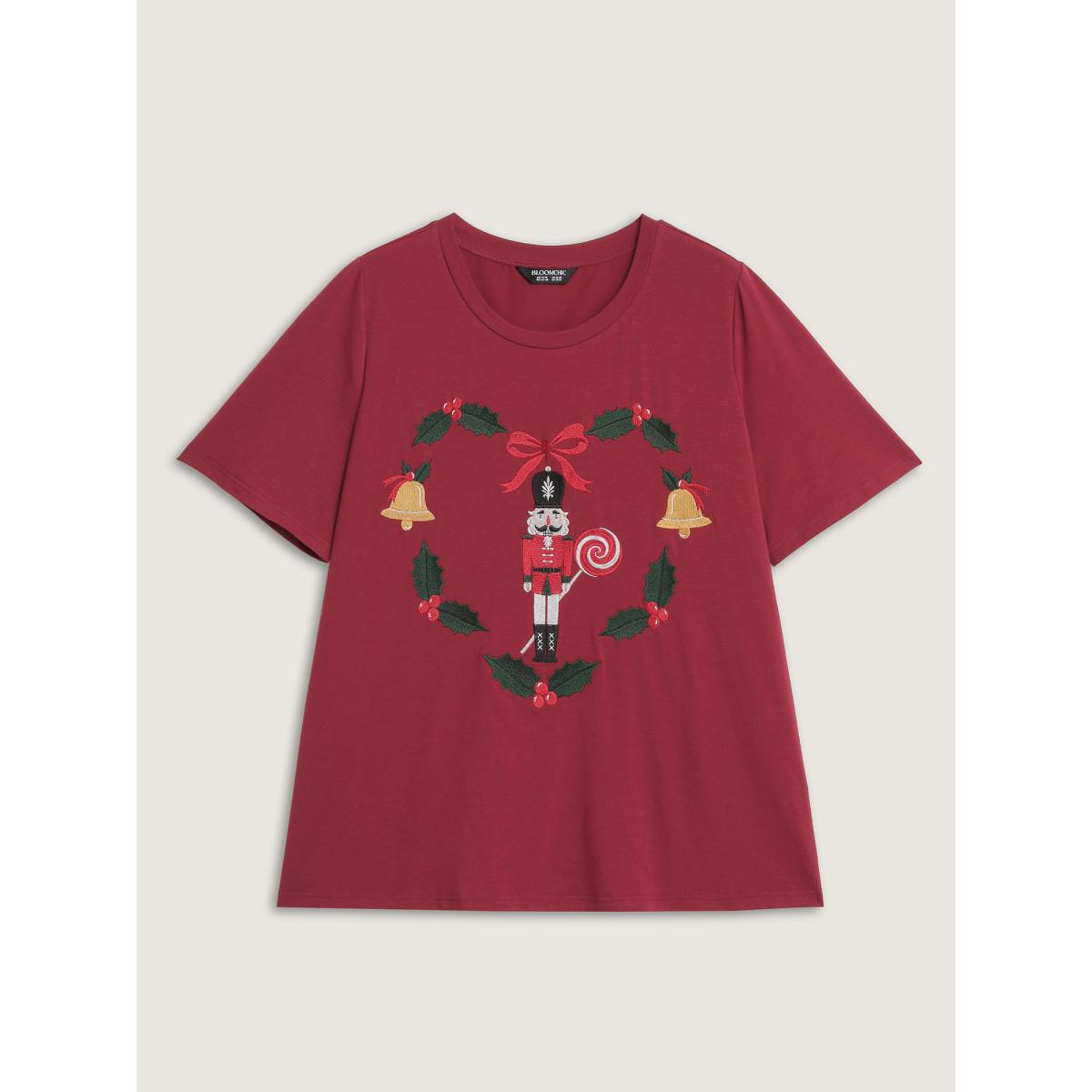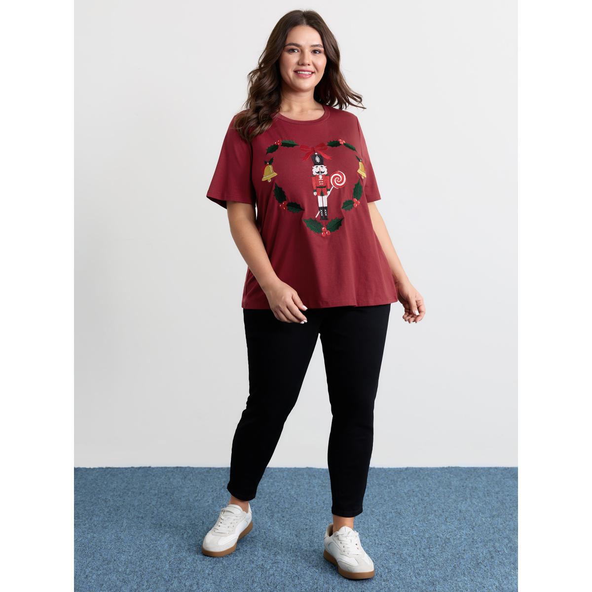 Plus Size Holiday Nutcracker Round Neck T-Shirt Burgundy Women Playful Christmas Round Neck Casual T-shirts BloomChic 28/5X