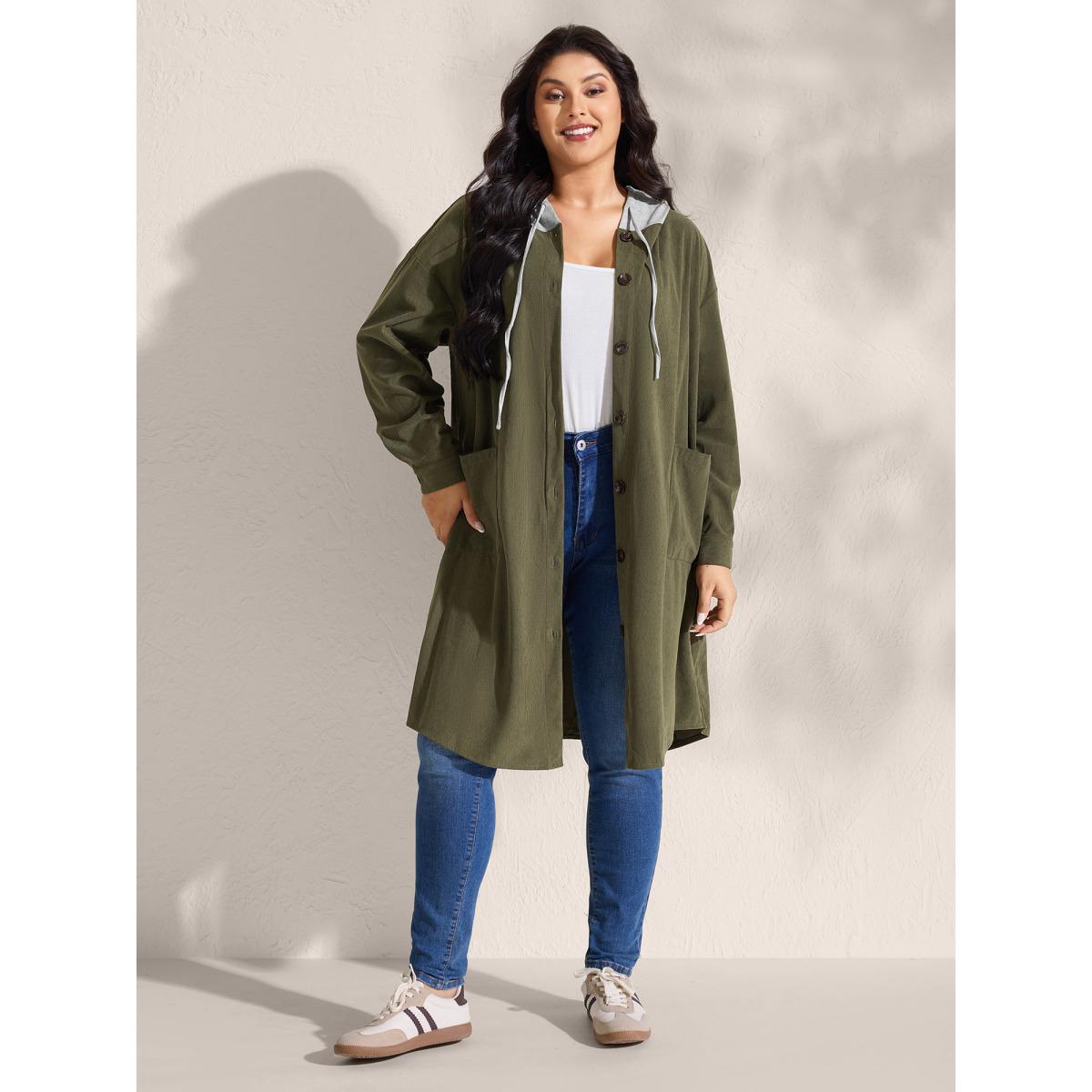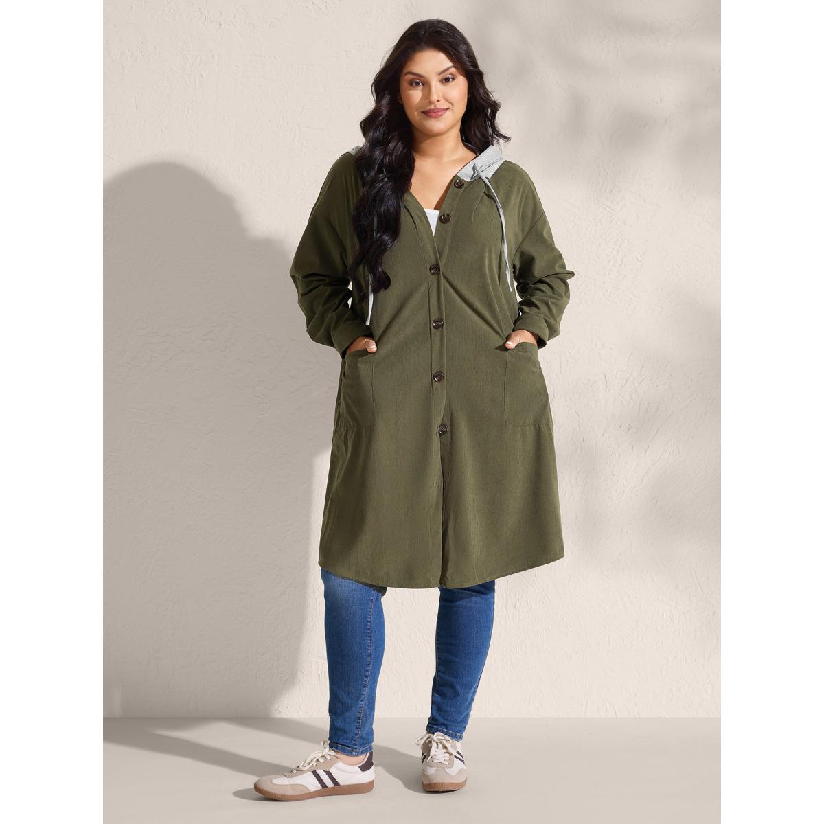Plus Size Hooded Button-Front Pockets Jacket Women ArmyGreen Contrast Loose Patch pocket Casual Jackets BloomChic 22-24/3X
