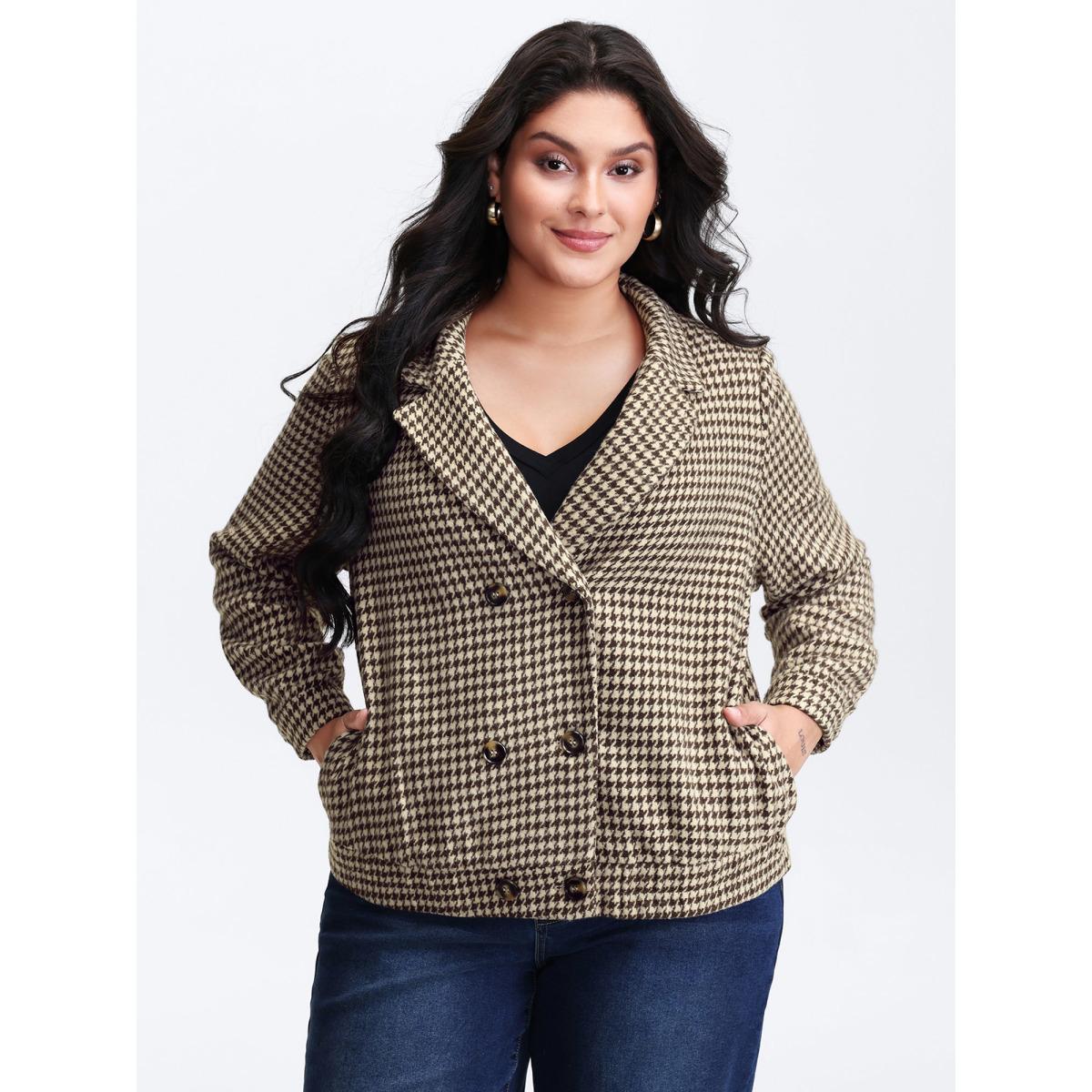 Plus Size Houndstooth Fleece Pockets Button Jacket Women DarkBrown Button Slanted pocket Casual Jackets BloomChic 14-16/1X
