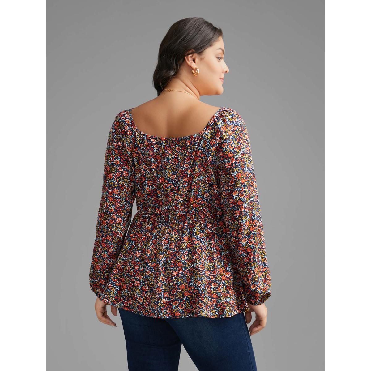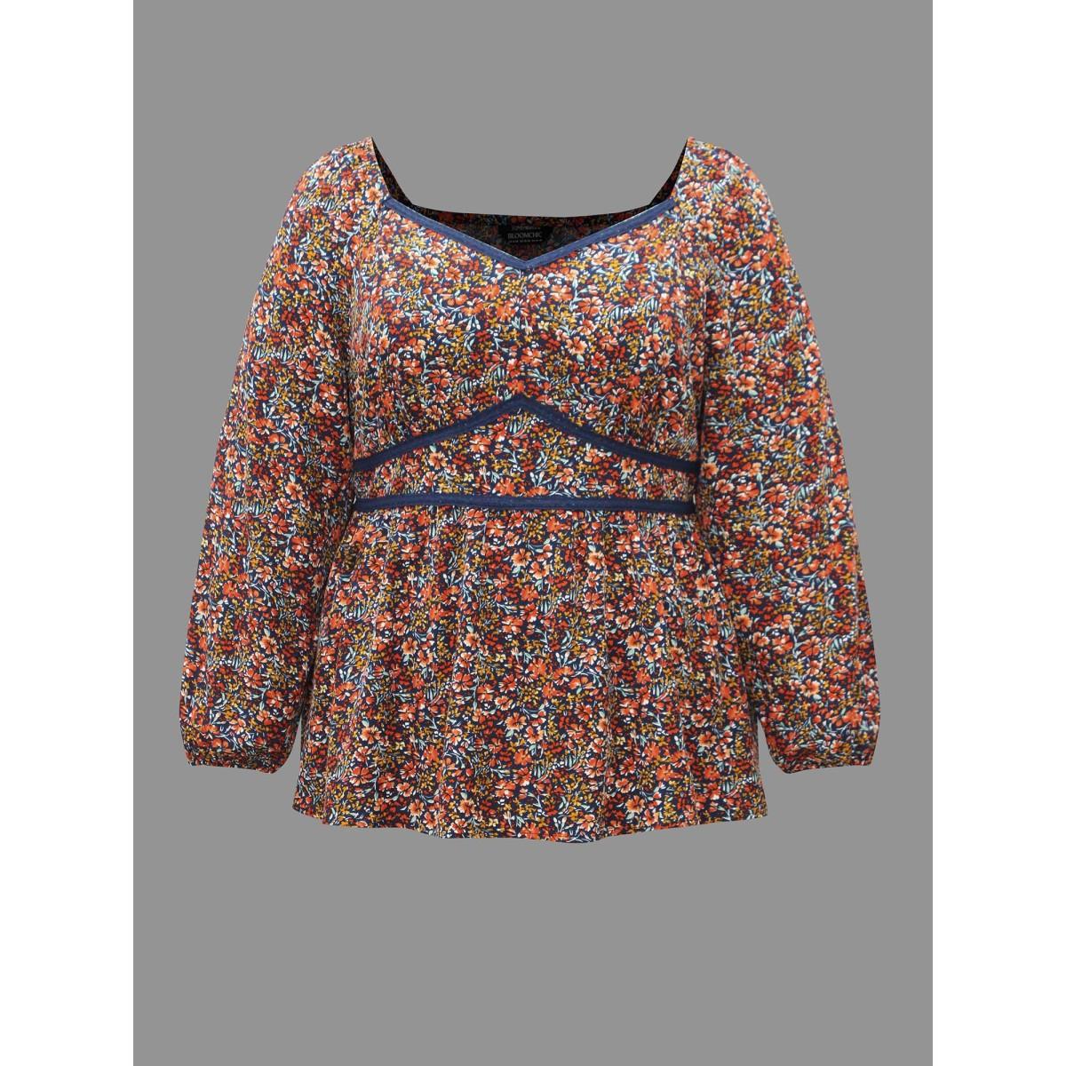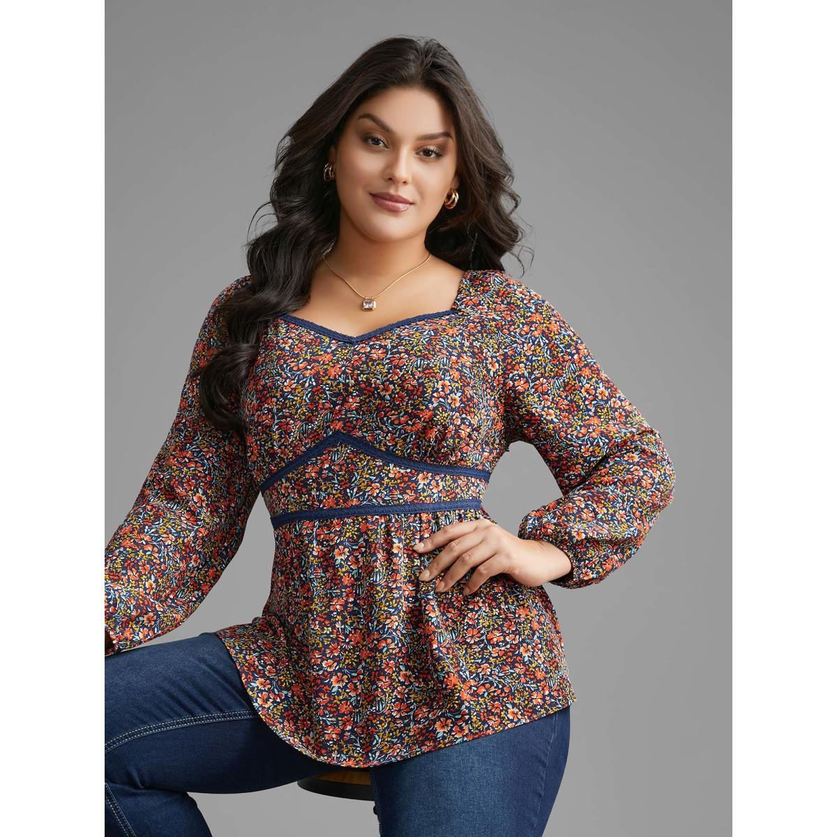 Plus Size Indigo Ditsy Floral Woven Ribbon Gathered Blouse Women Elegant Long Sleeve Heart neckline Everyday Blouses BloomChic 22-24/3X