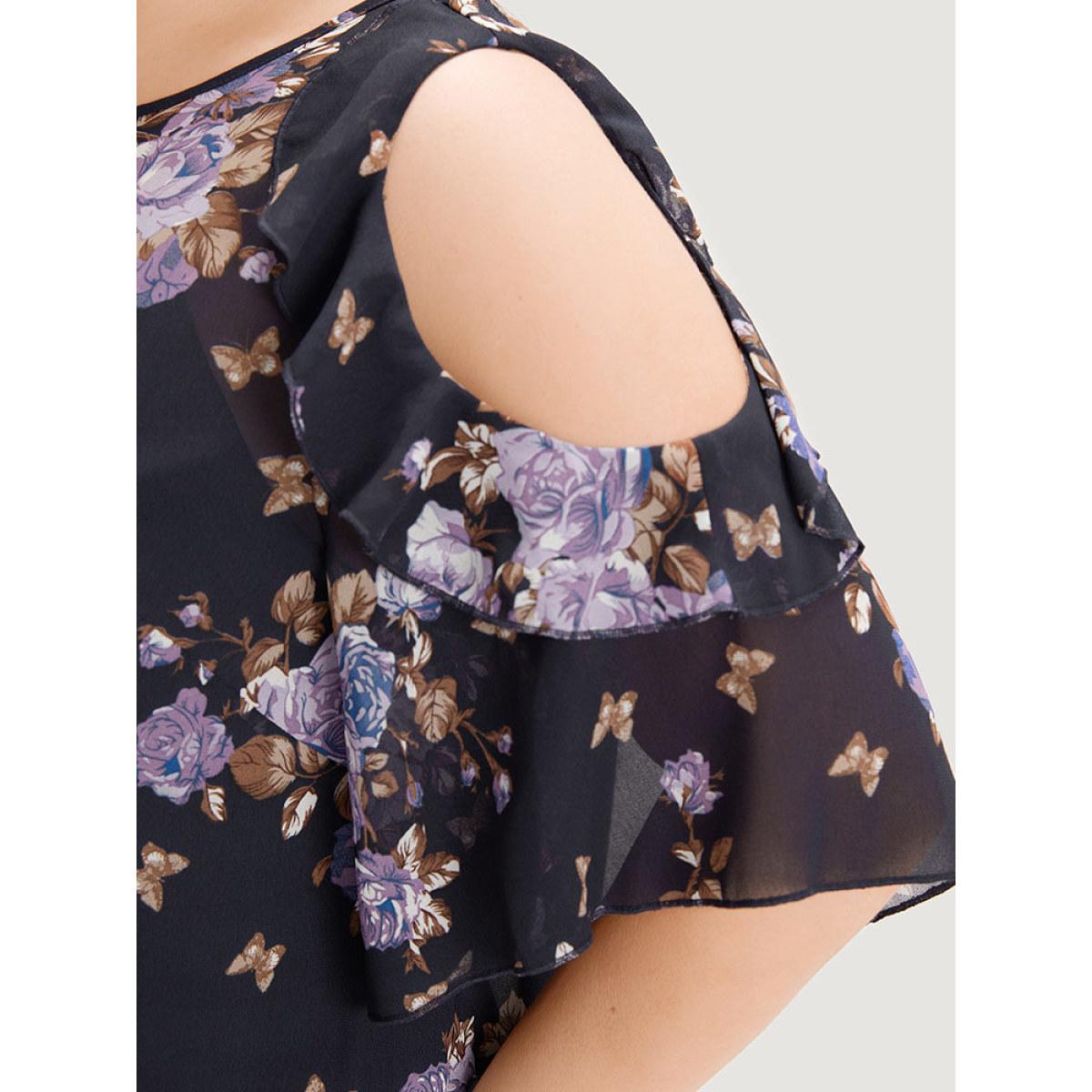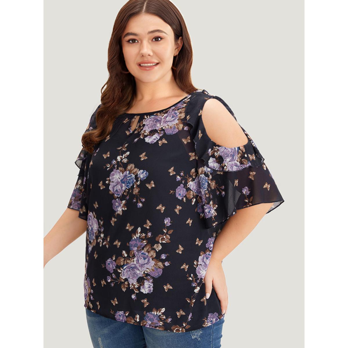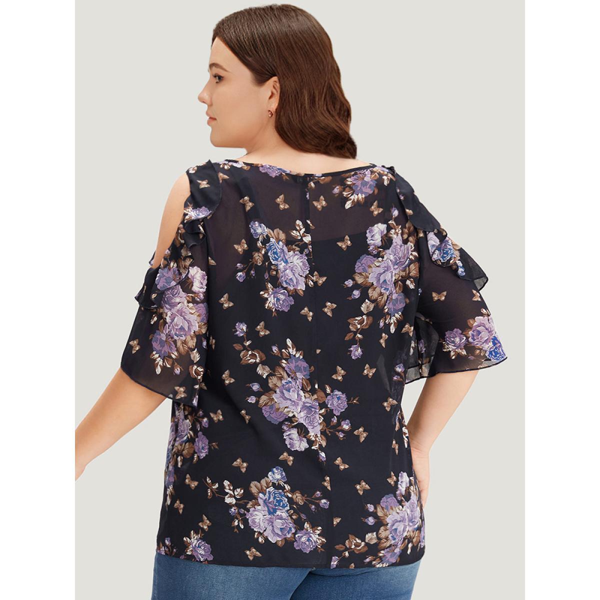 Plus Size Indigo Floral Cut Out Ruffle Trim Blouse With Cami Top Women Elegant Half Sleeve Cold Shoulder Dailywear Blouses BloomChic 30/6X