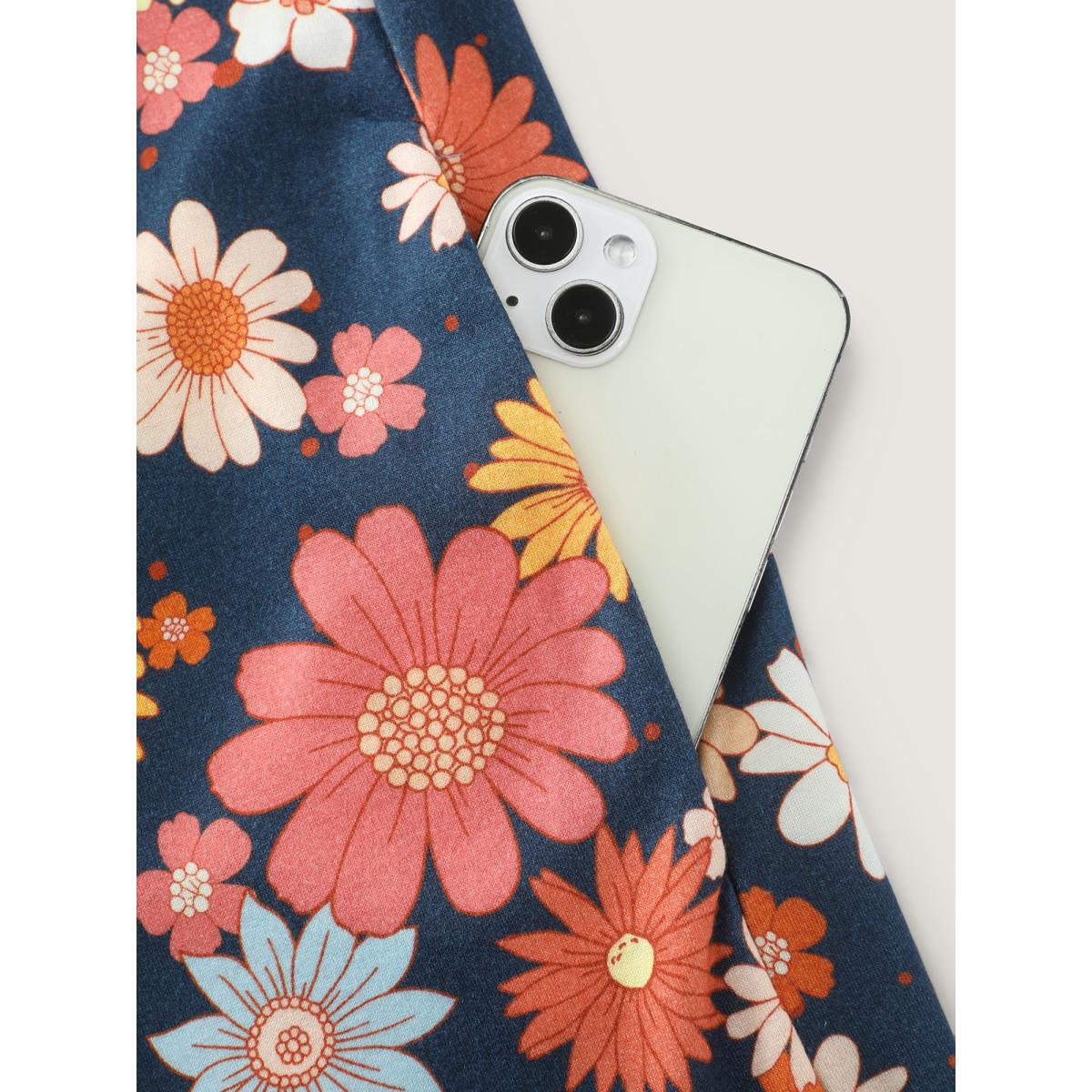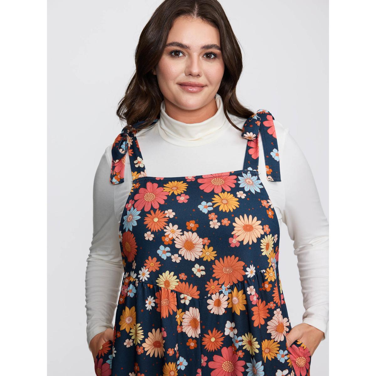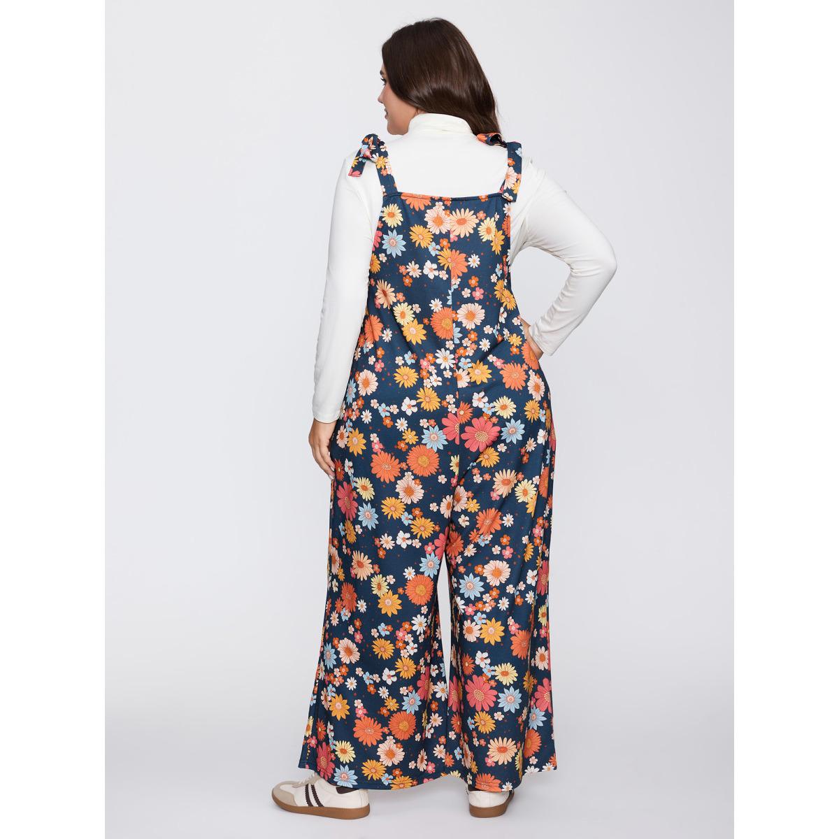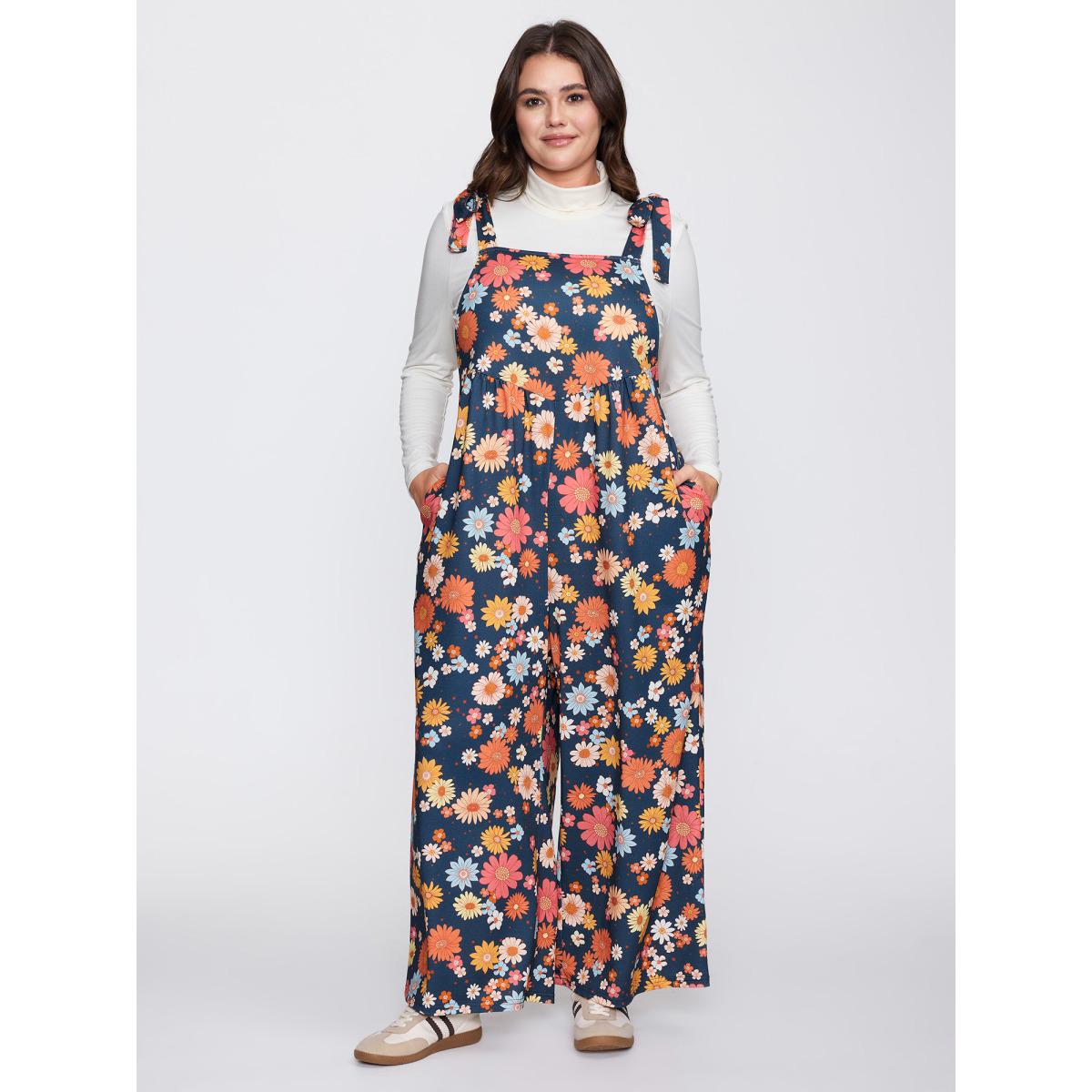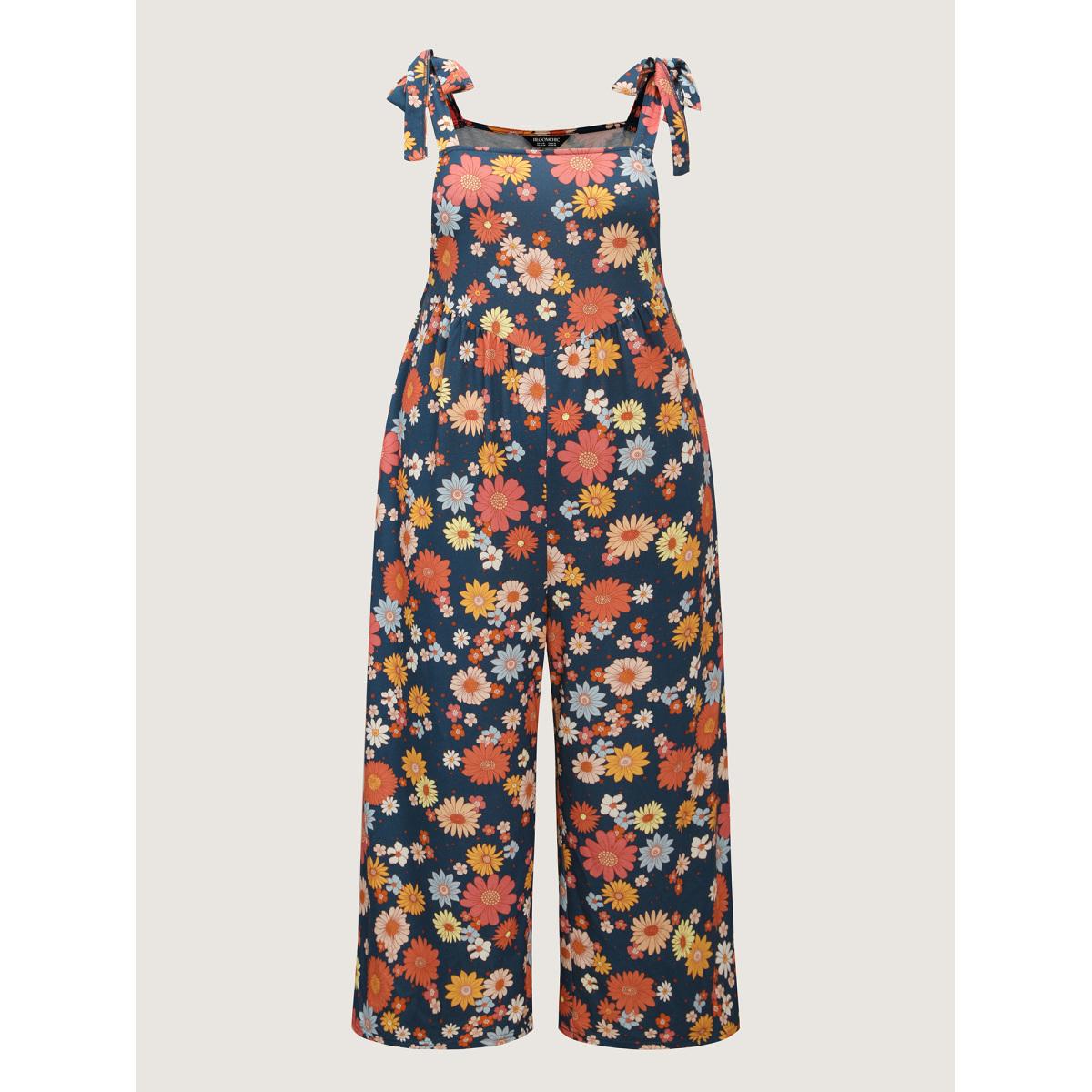 Plus Size Indigo Floral Print Adjustable Shoulder-Tie Pockets Jumpsuit Women Playful Sleeveless Square Neck Casual Loose Jumpsuits BloomChic 28/5X