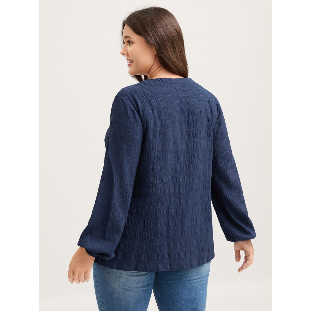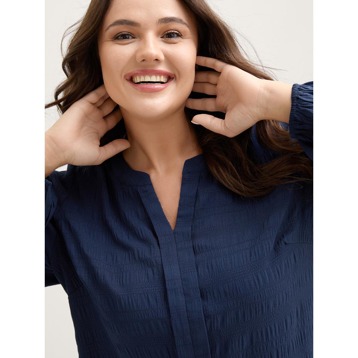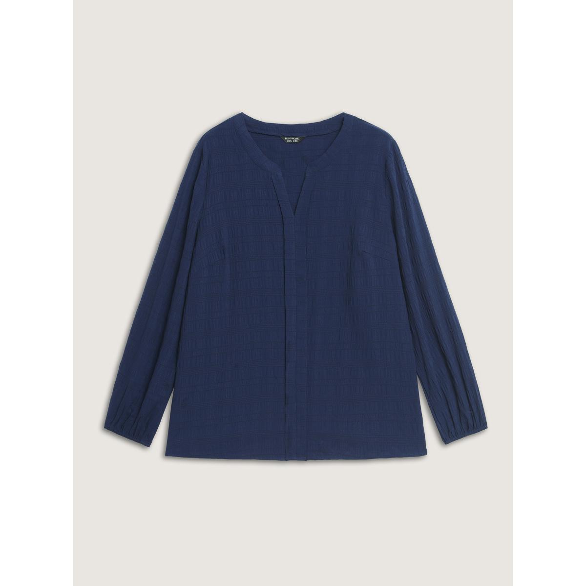 Plus Size Indigo Notched Collar Textured Solid Blouse Women Leisure Extra Long Sleeve Flat collar with V-notch Casual Blouses BloomChic 26/4X