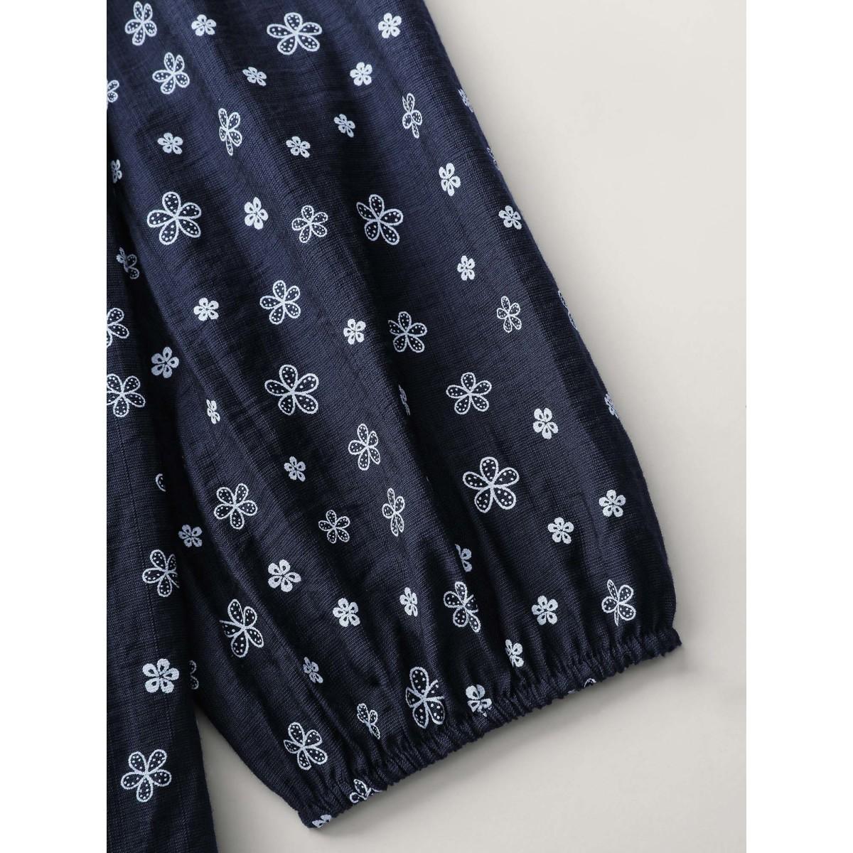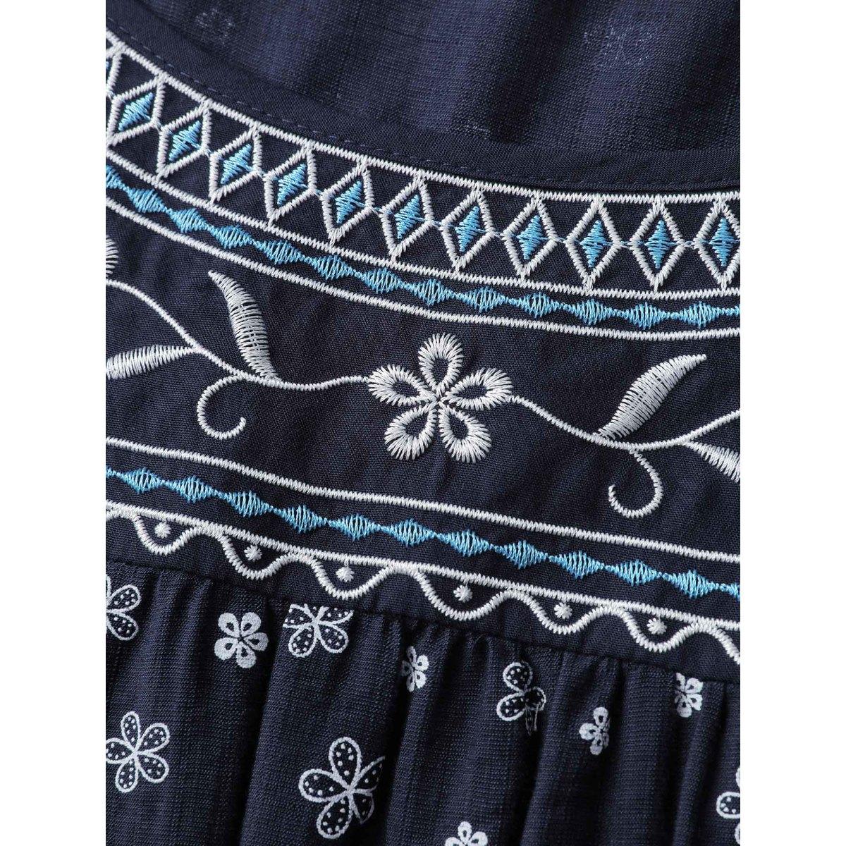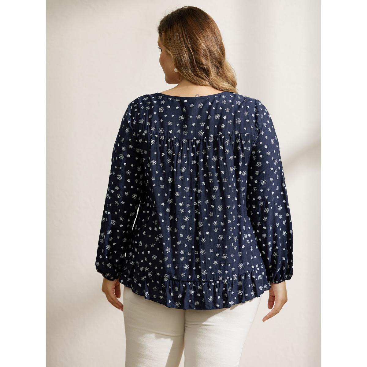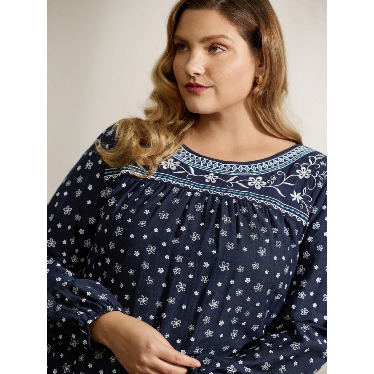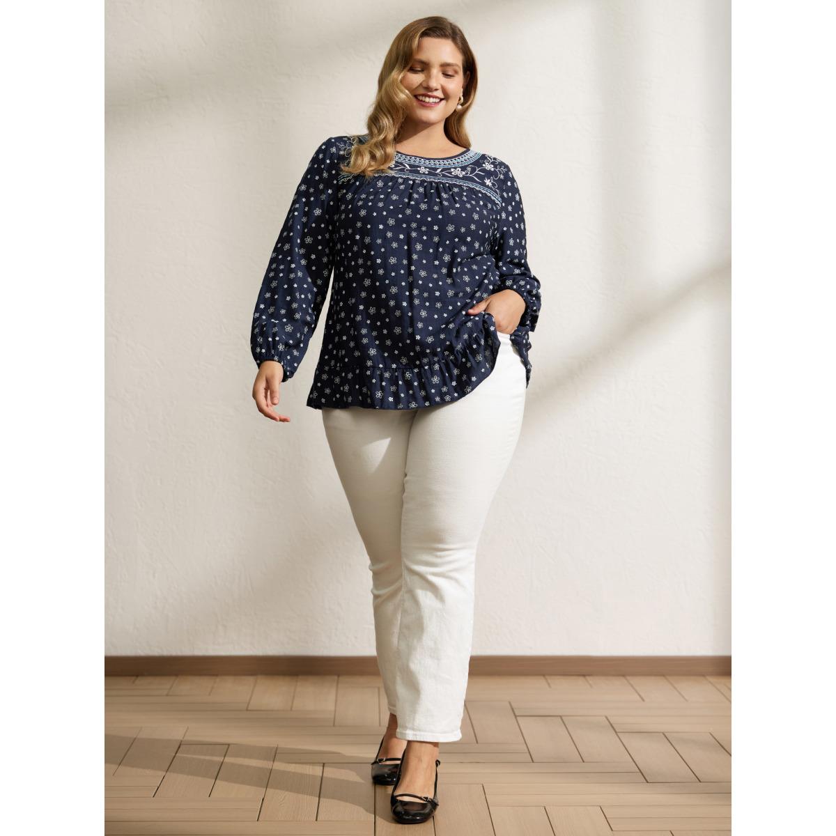 Plus Size Indigo Supersoft Embroidered Ruffled Hem Blouse Women Boho Extra Long Sleeve Round Neck Vacation Blouses BloomChic 30/6X