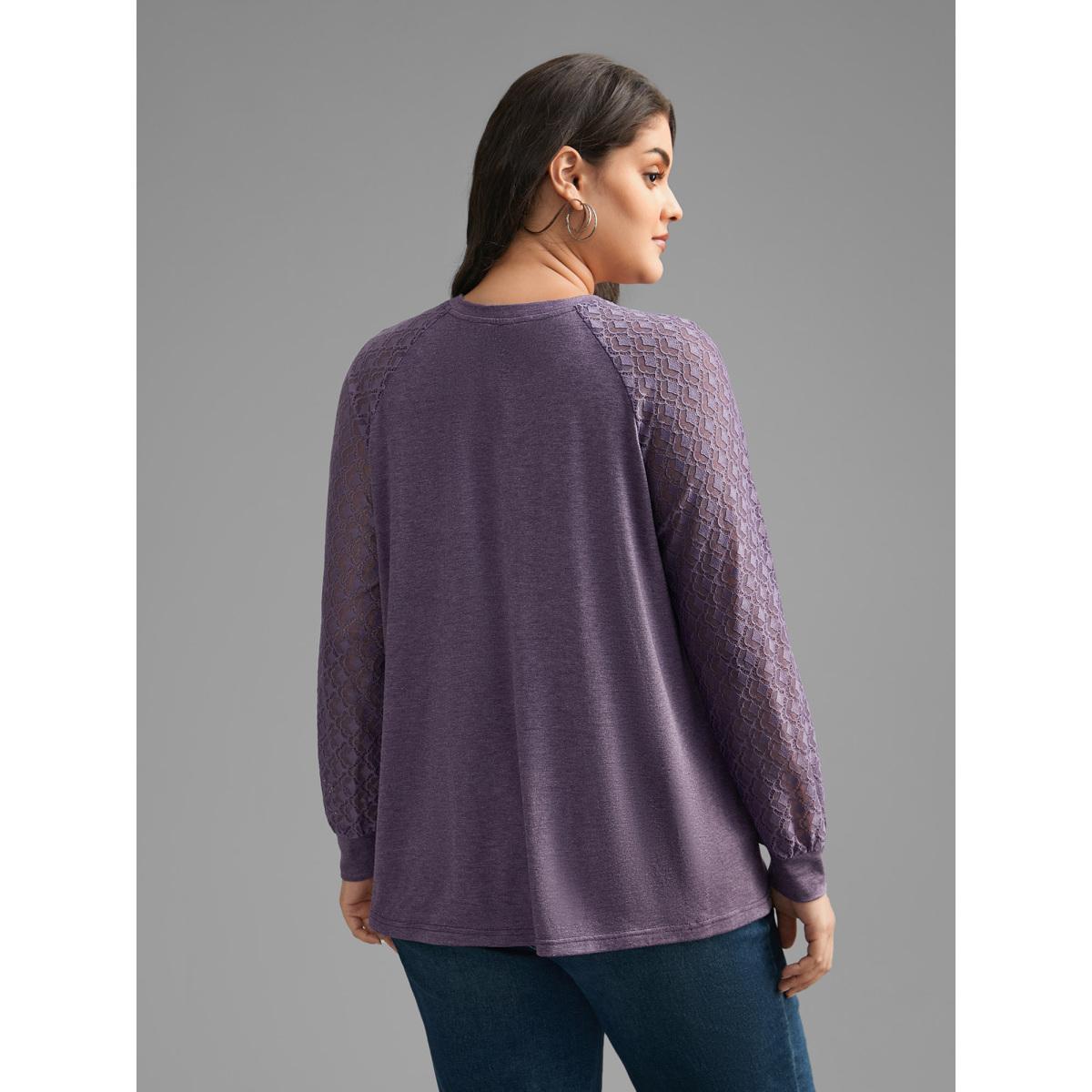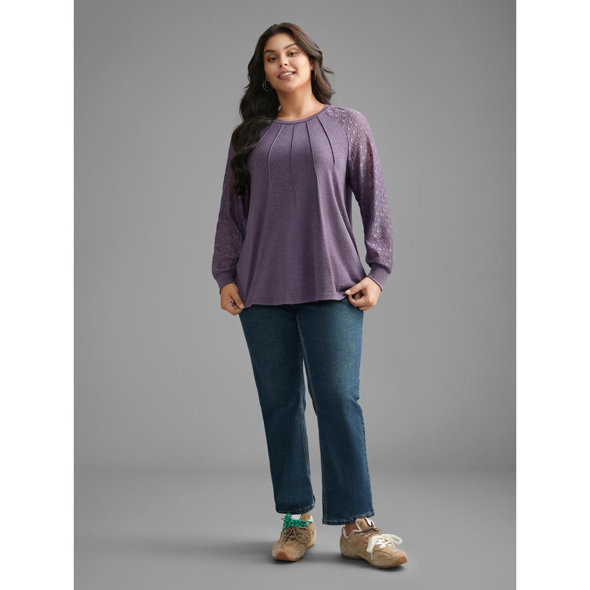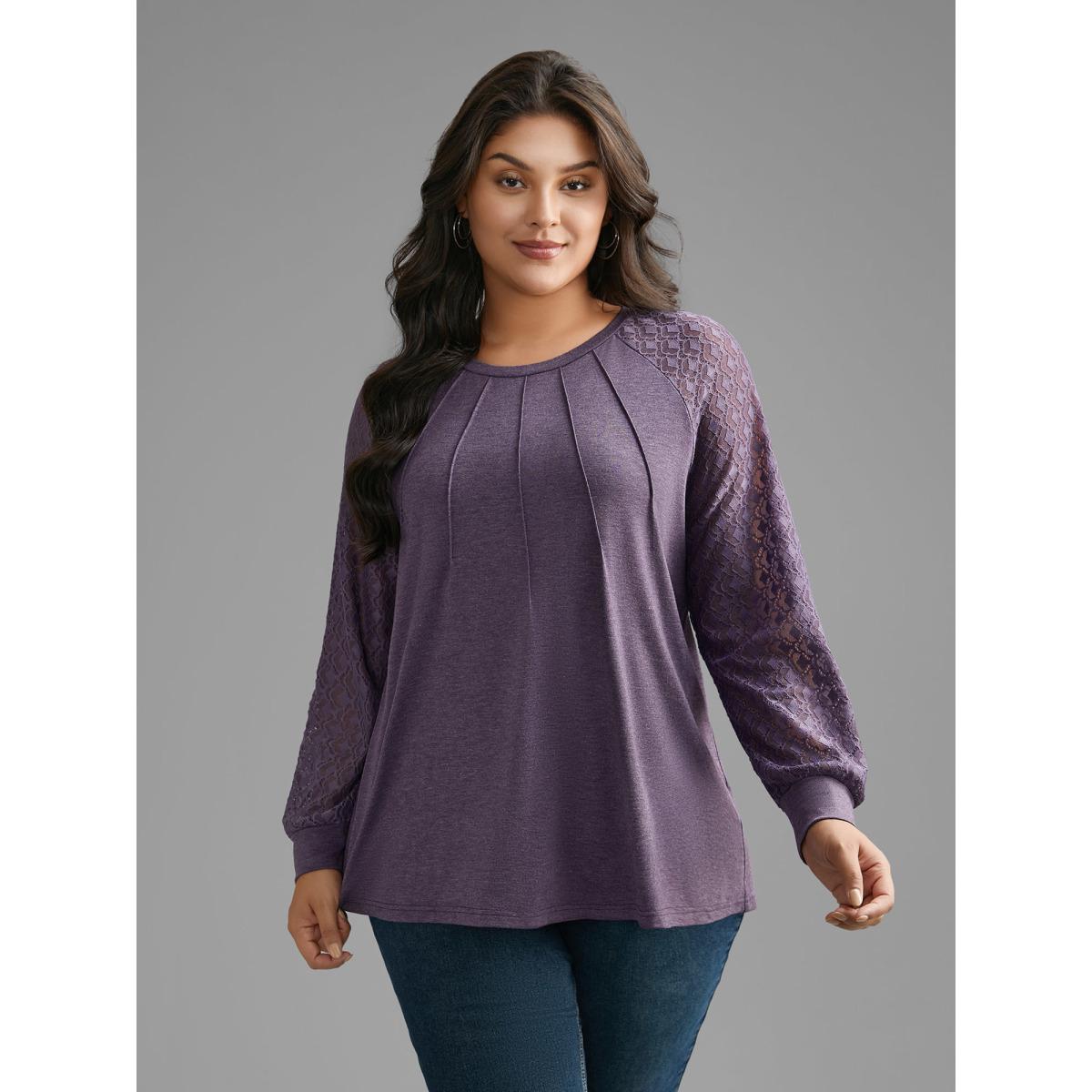 Plus Size Lace Patchwork Pleated Raglan Sleeve T-shirt Eggplant Women Casual Pleated Round Neck Everyday T-shirts BloomChic 10/M