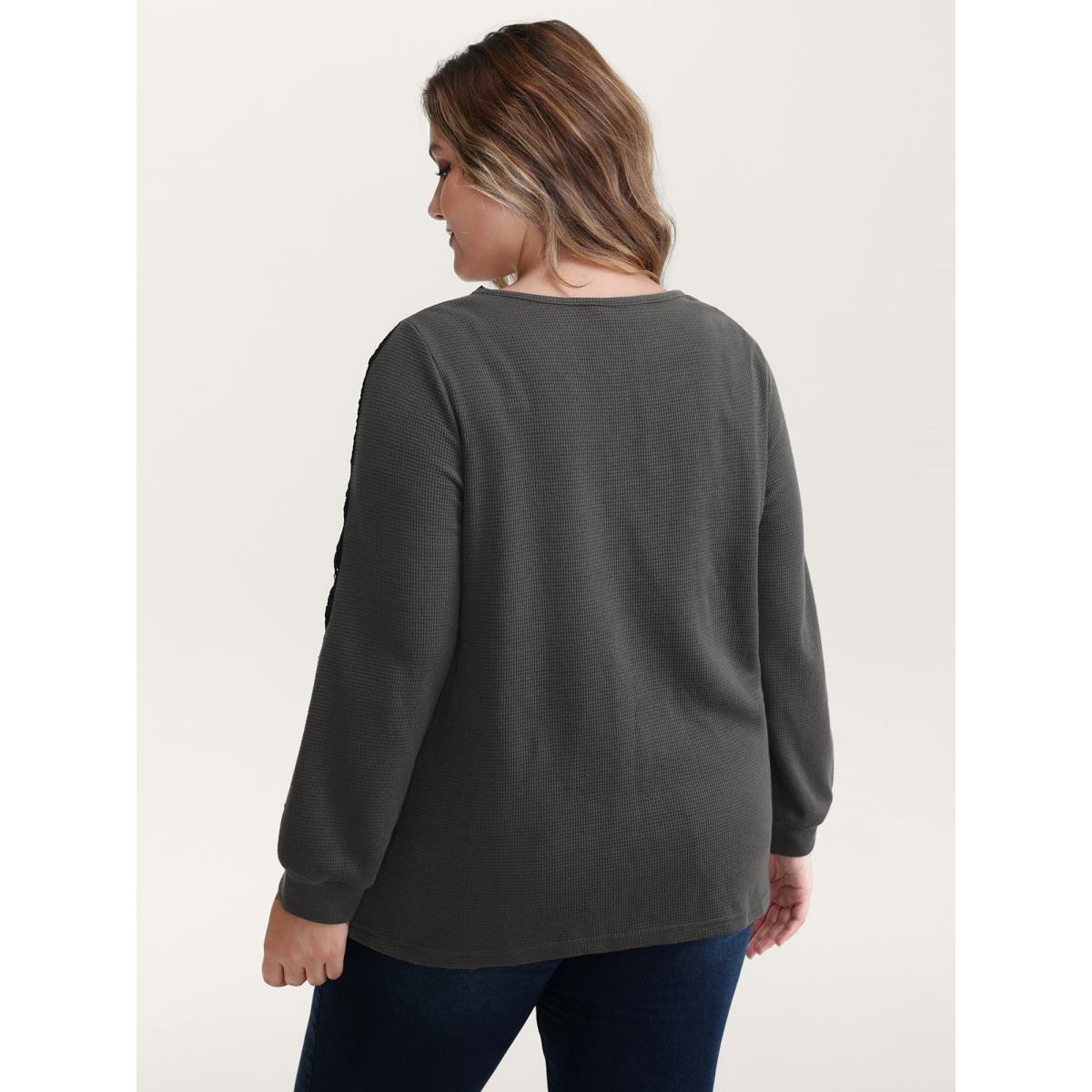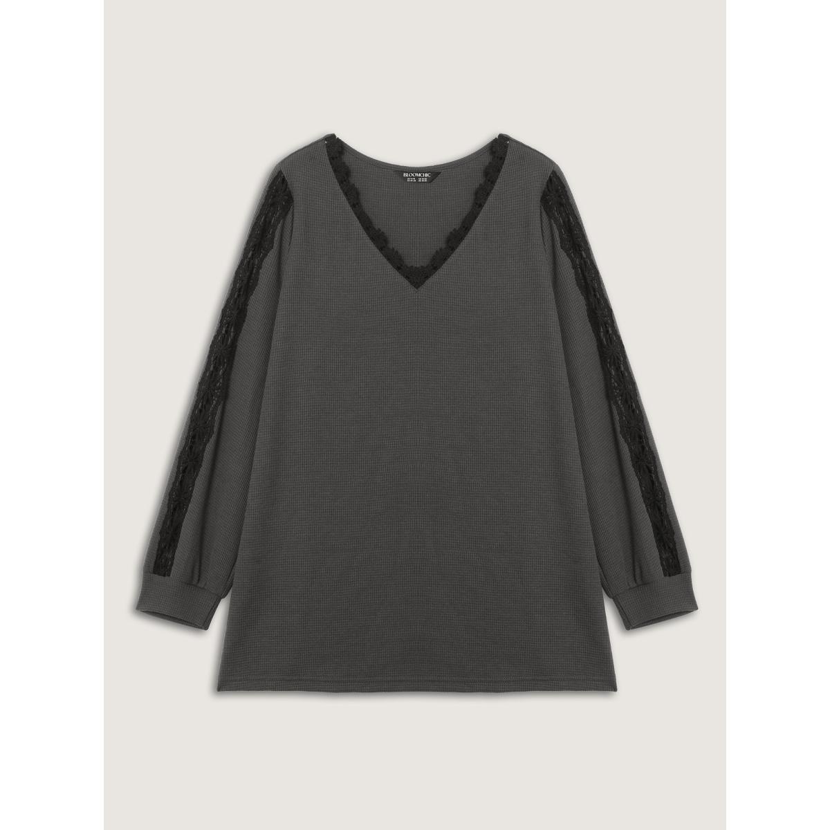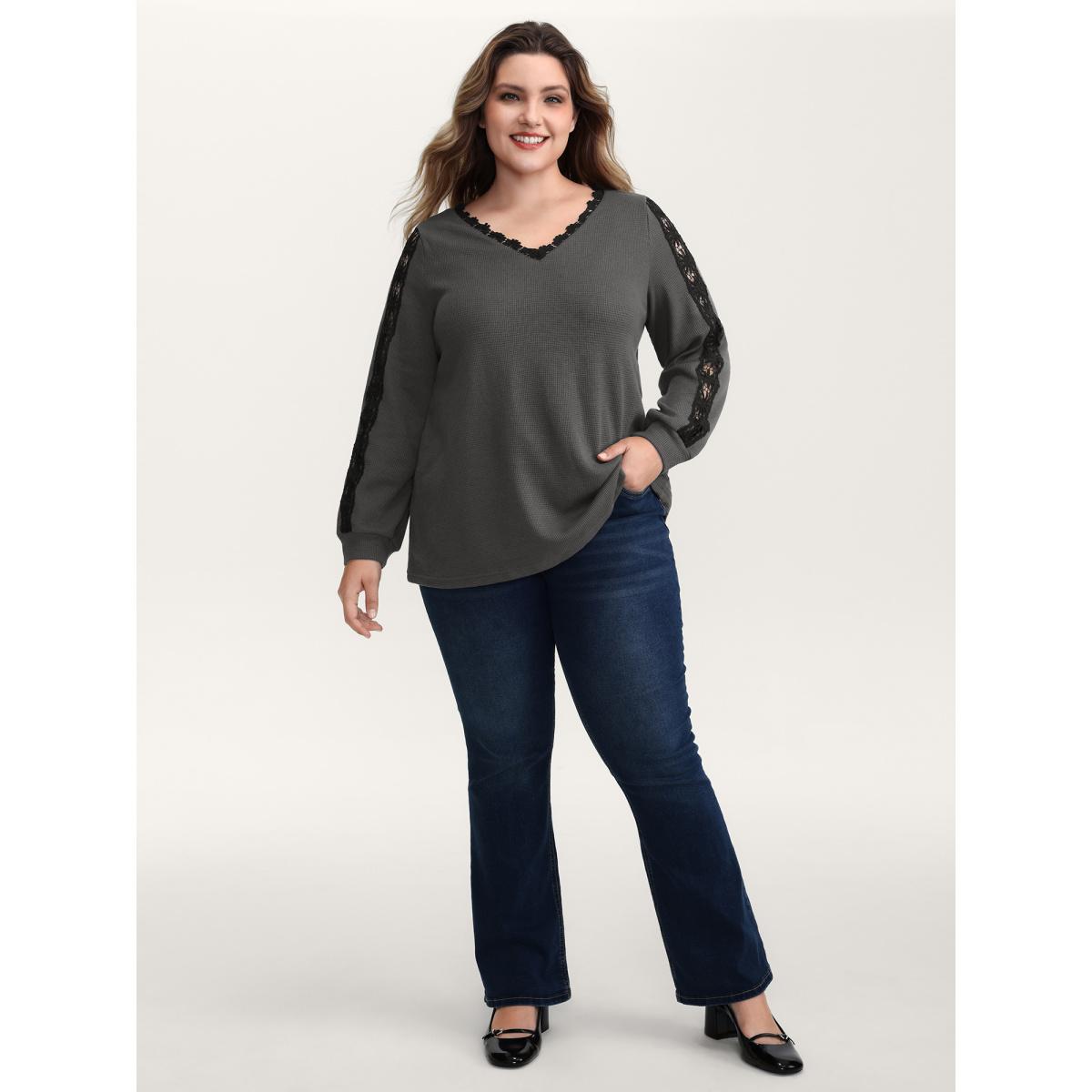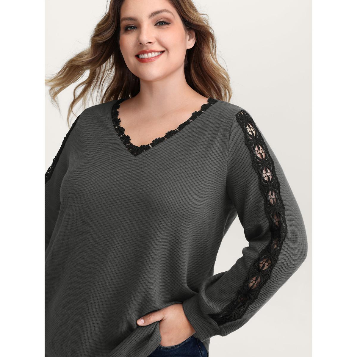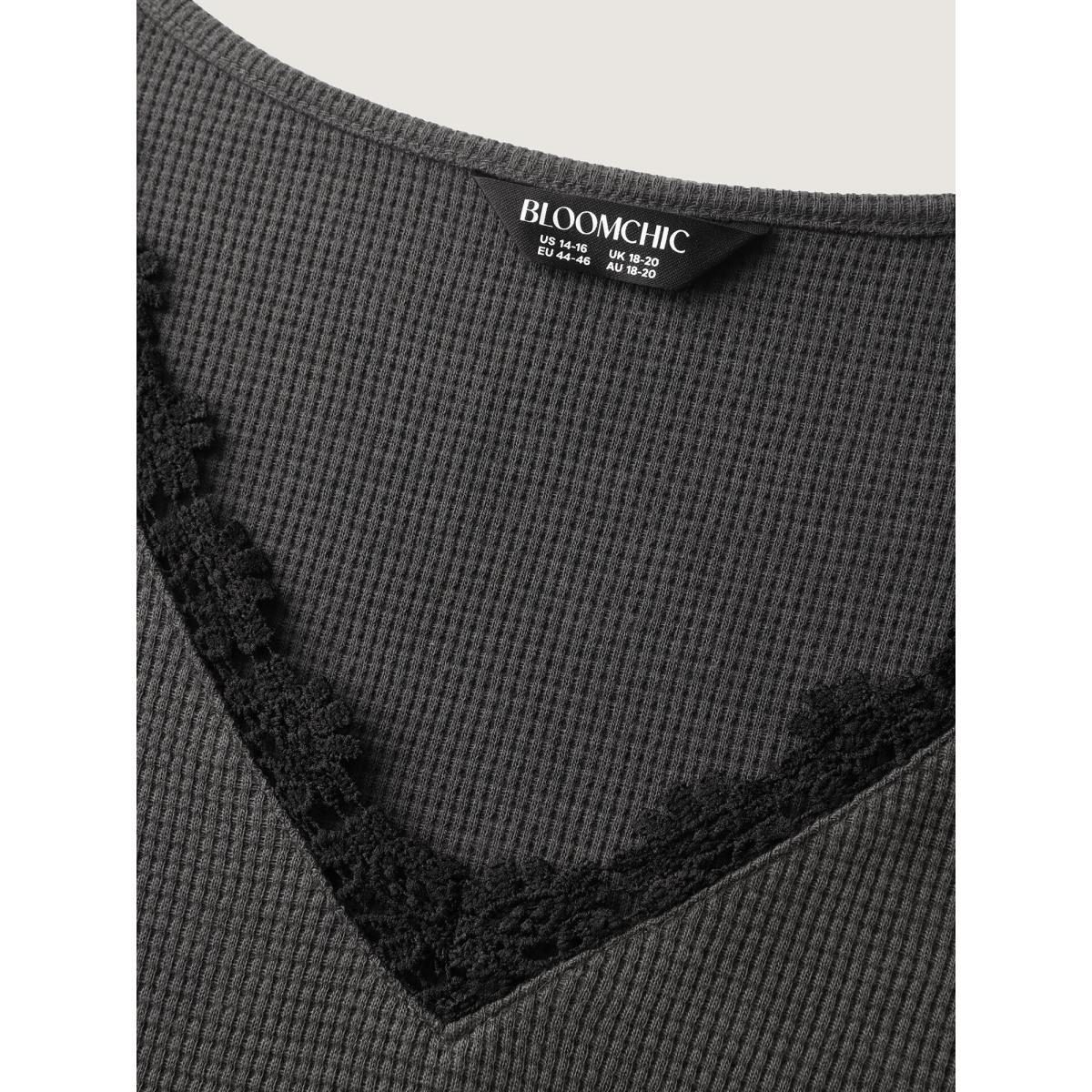 Plus Size Lace Trim Textured V-Neck T-Shirt DimGray Women Leisure Woven ribbon&lace trim V-neck Casual T-shirts BloomChic 22-24/3X