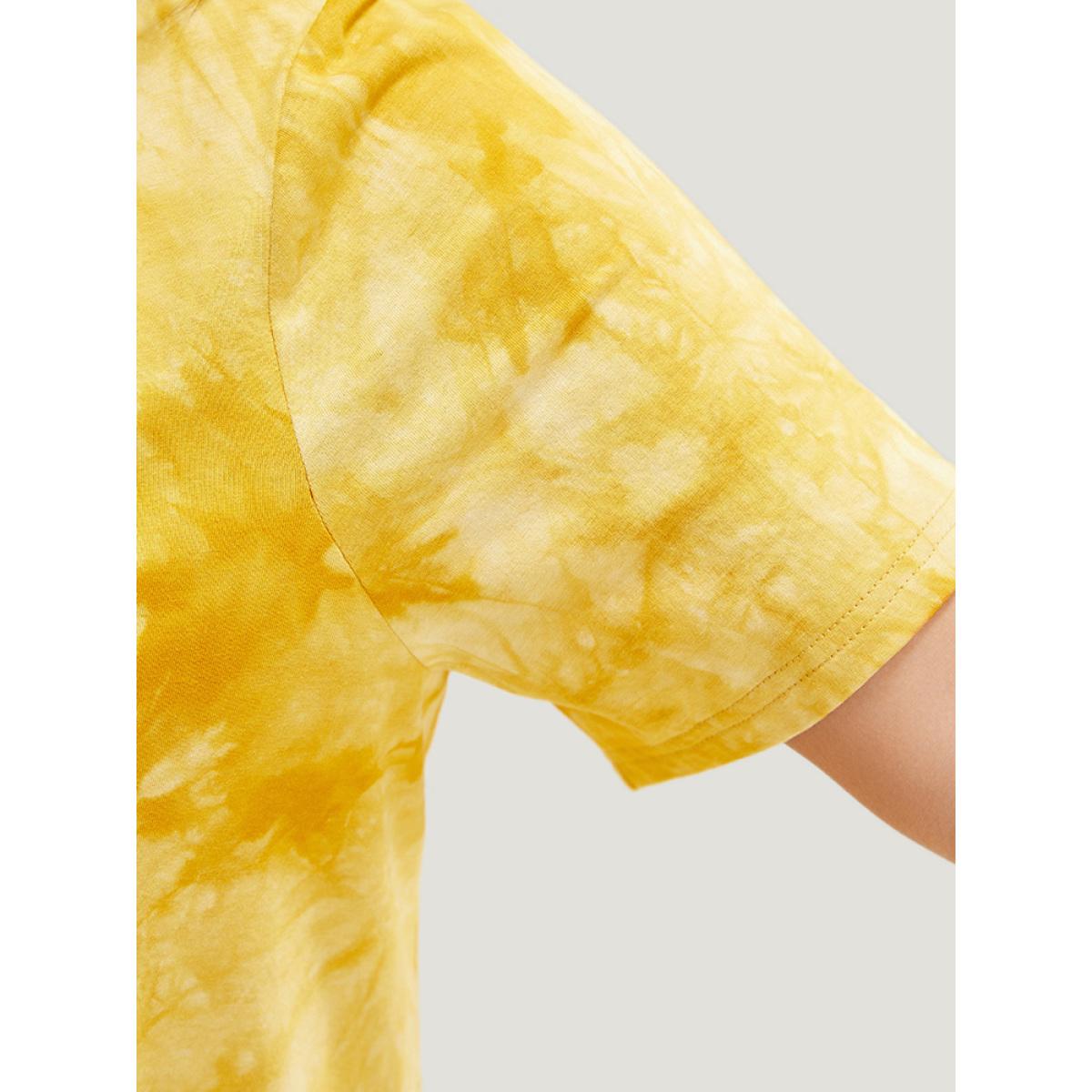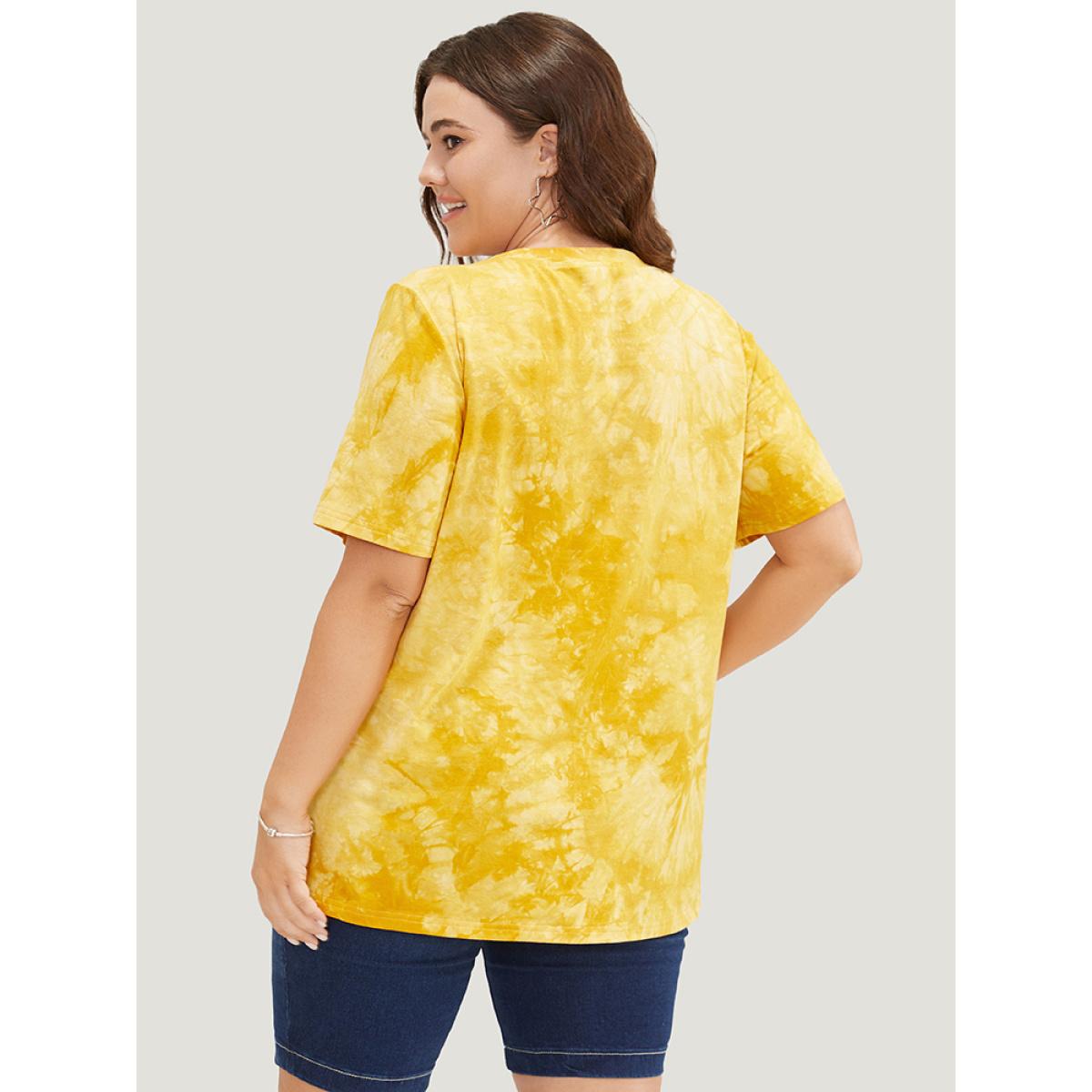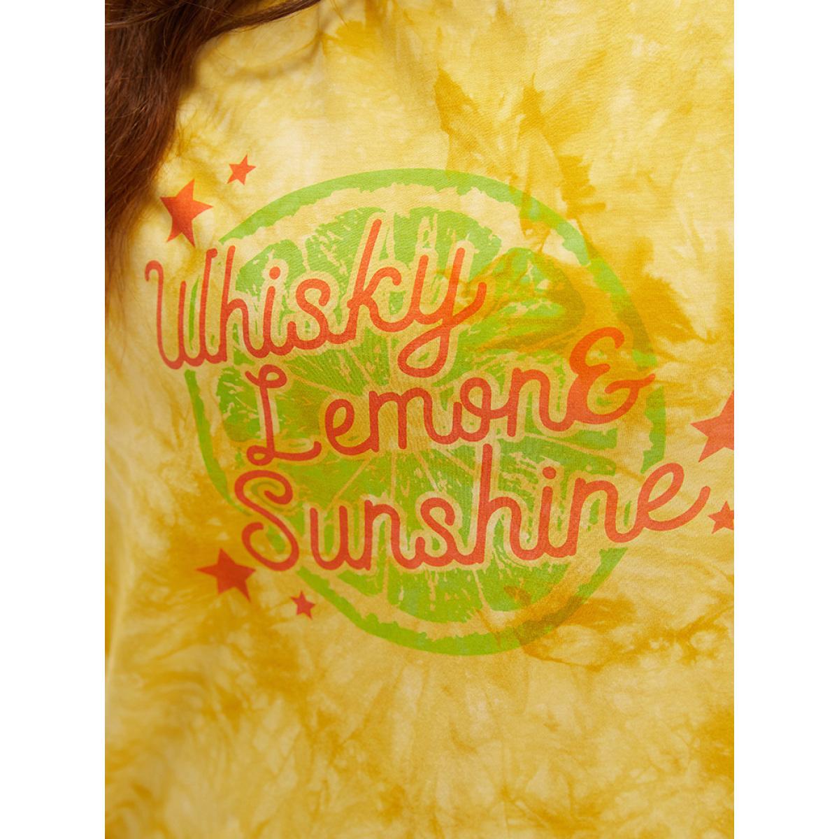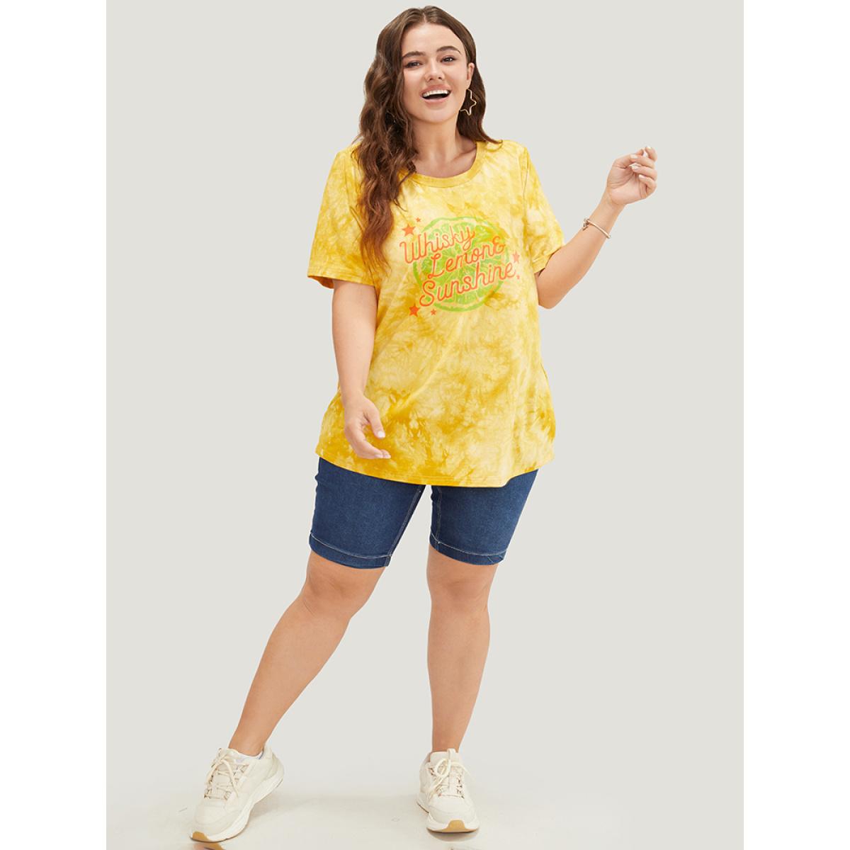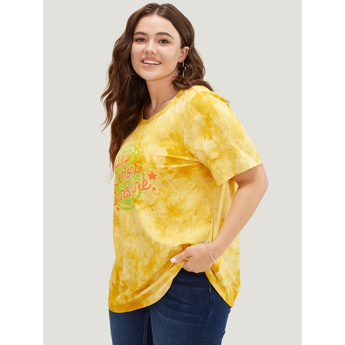 Plus Size Lemon & Letter Print Crew Neck Tie Dye T-shirt Yellow Women Casual Graphic Dailywear T-shirts BloomChic 18-20/2X