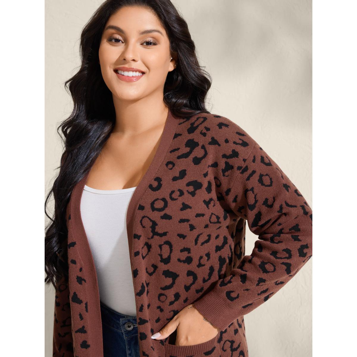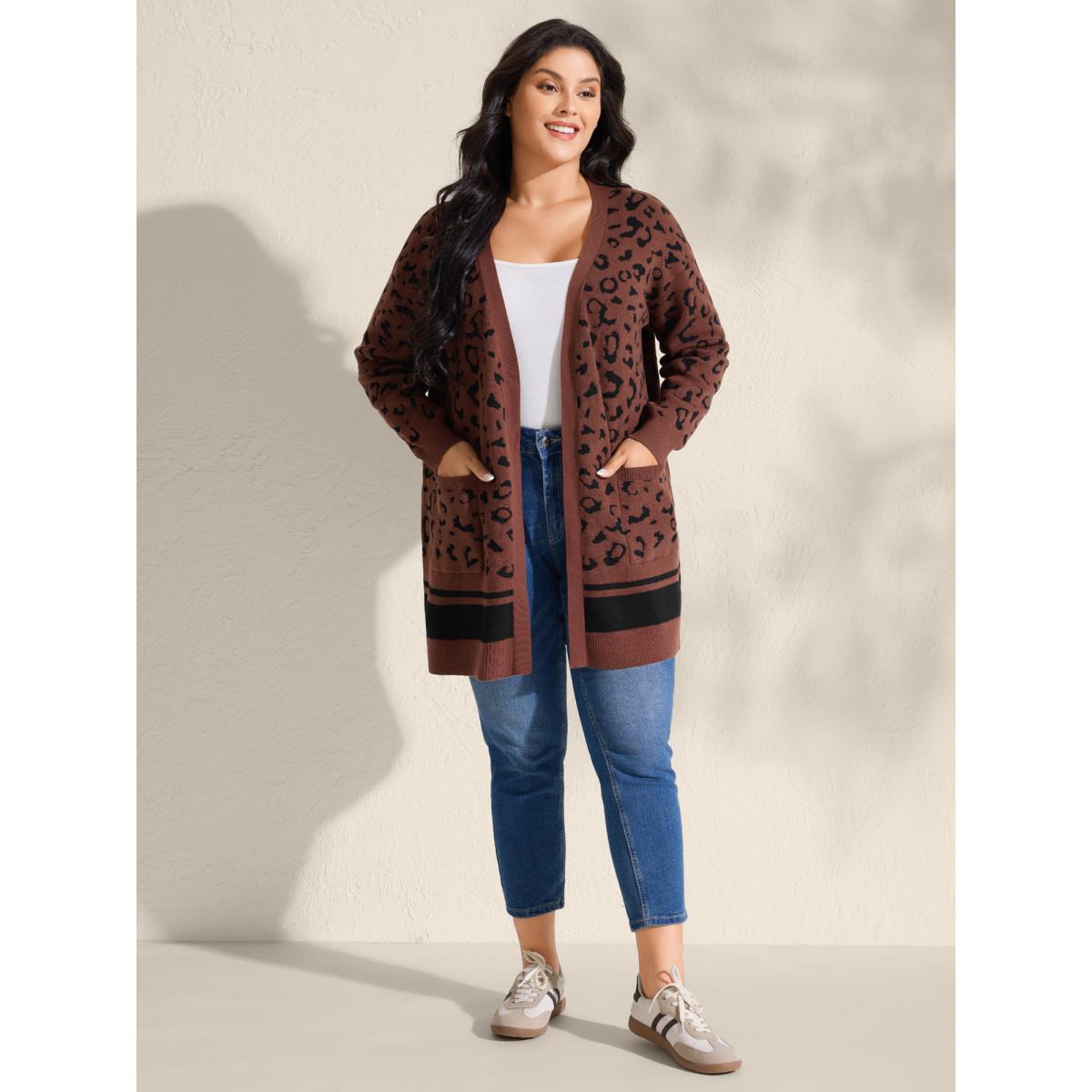 Plus Size Leopard Print Patch Pockets Front-Open Cardigan Browncoffeecolor Women Leisure Loose Long Sleeve Casual Cardigans BloomChic 14-16/1X