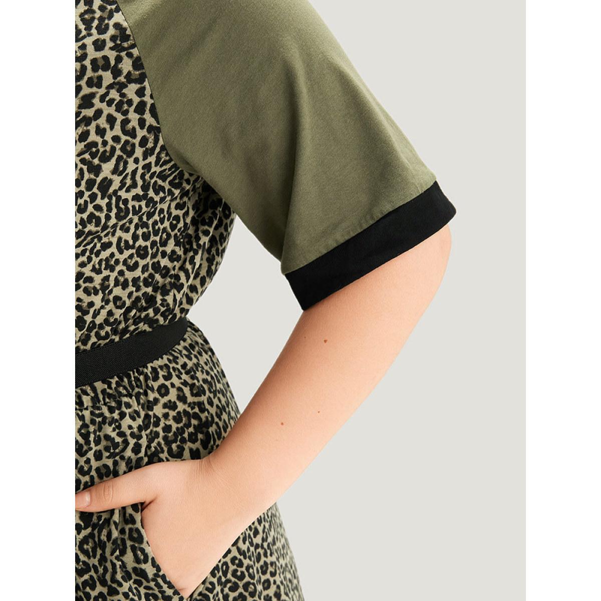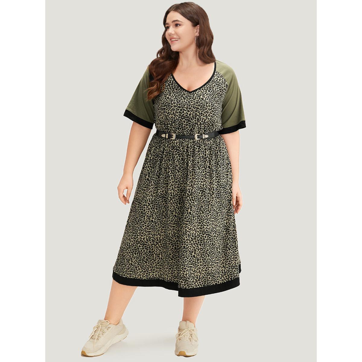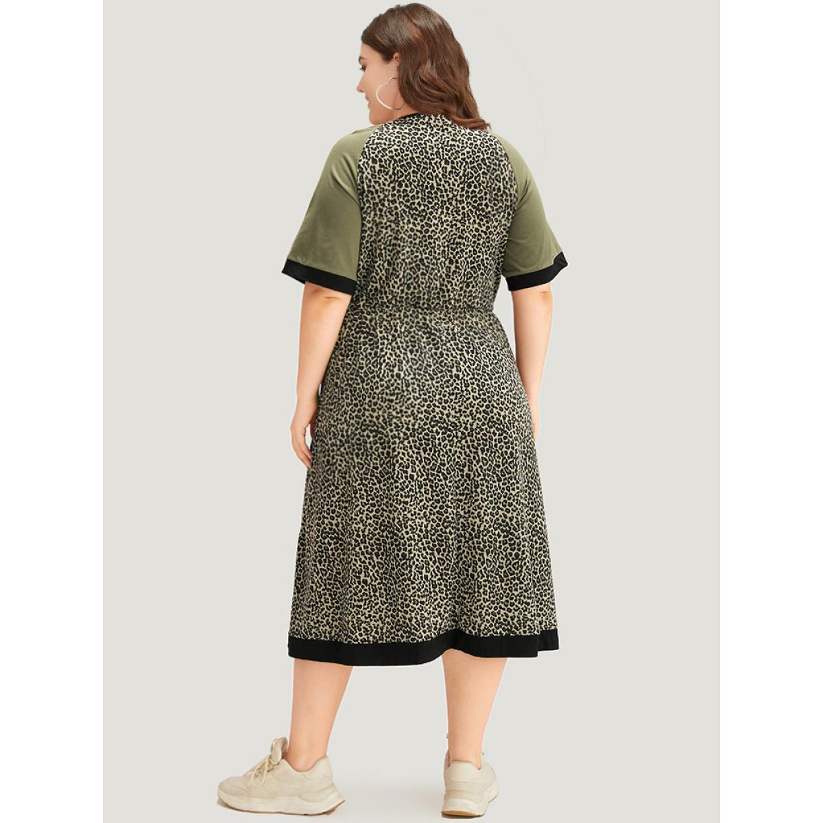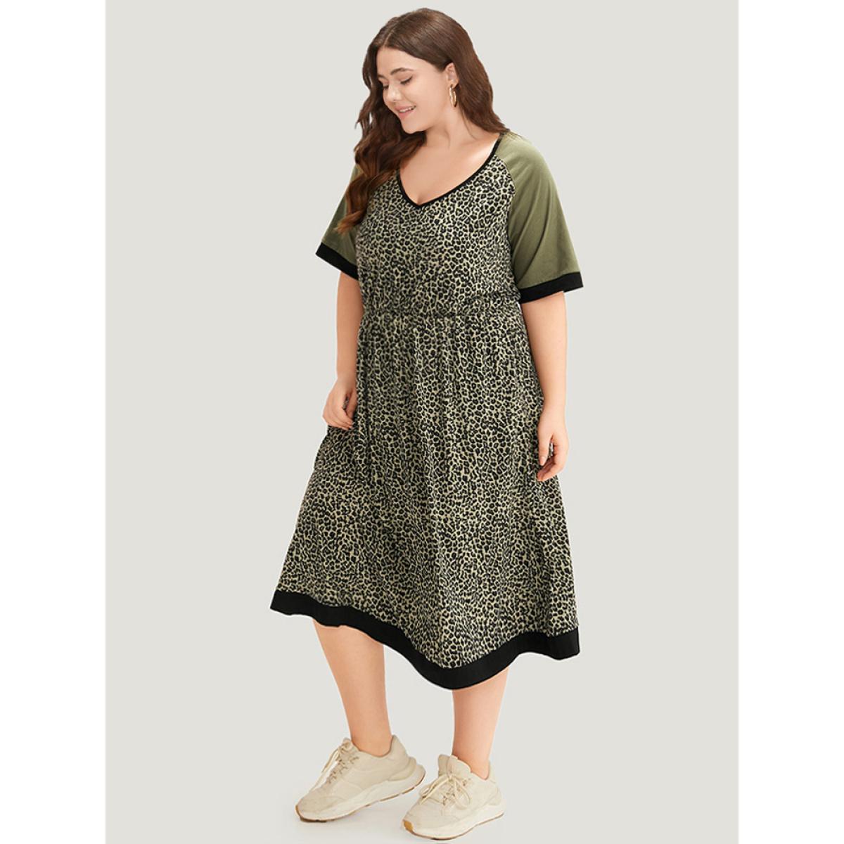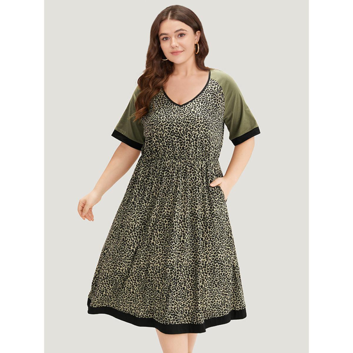 Plus Size Leopard Print Pocket Patchwork Gathered Contrast Trim Dress ArmyGreen Women Casual Gathered V-neck Half Sleeve Curvy Midi Dress BloomChic 10/M