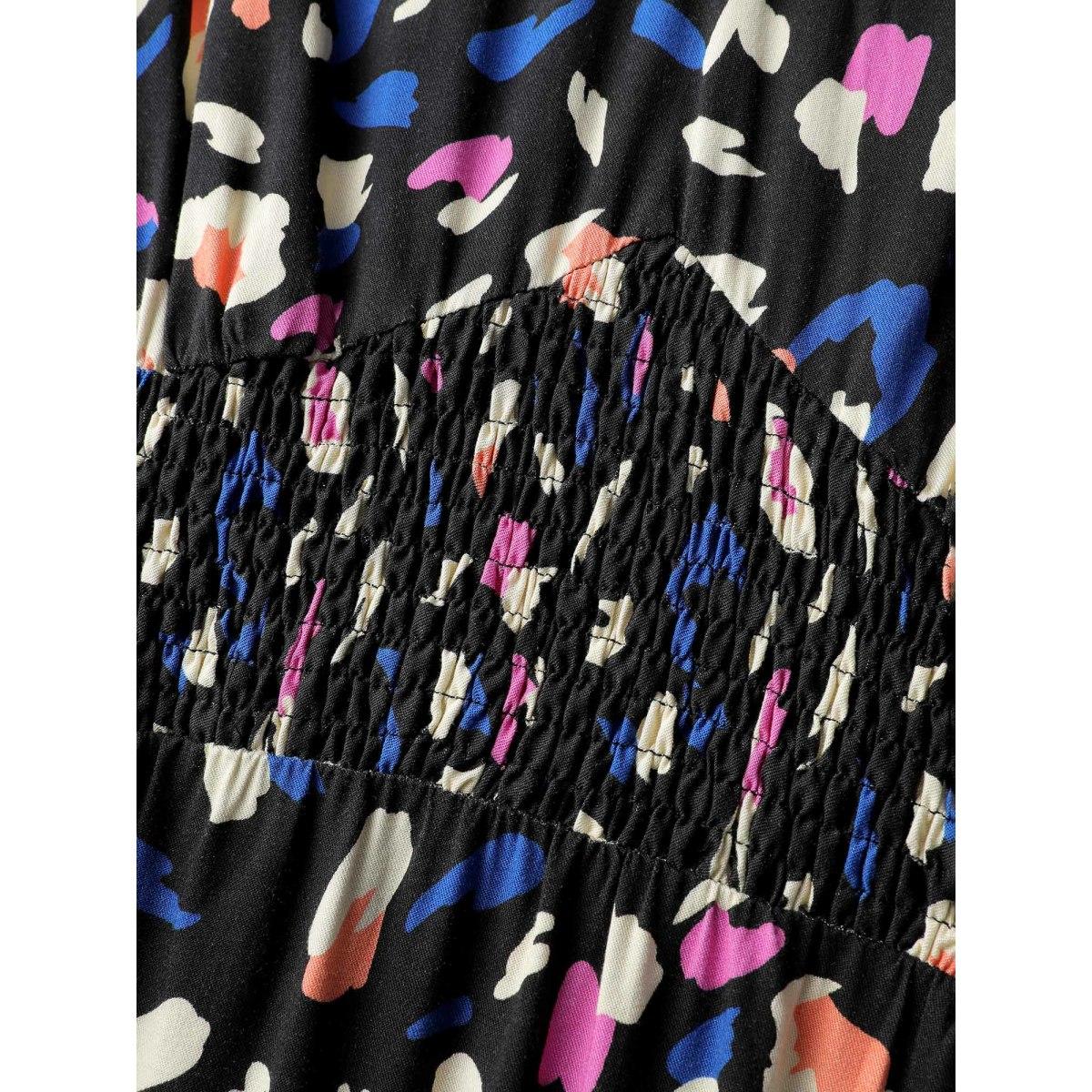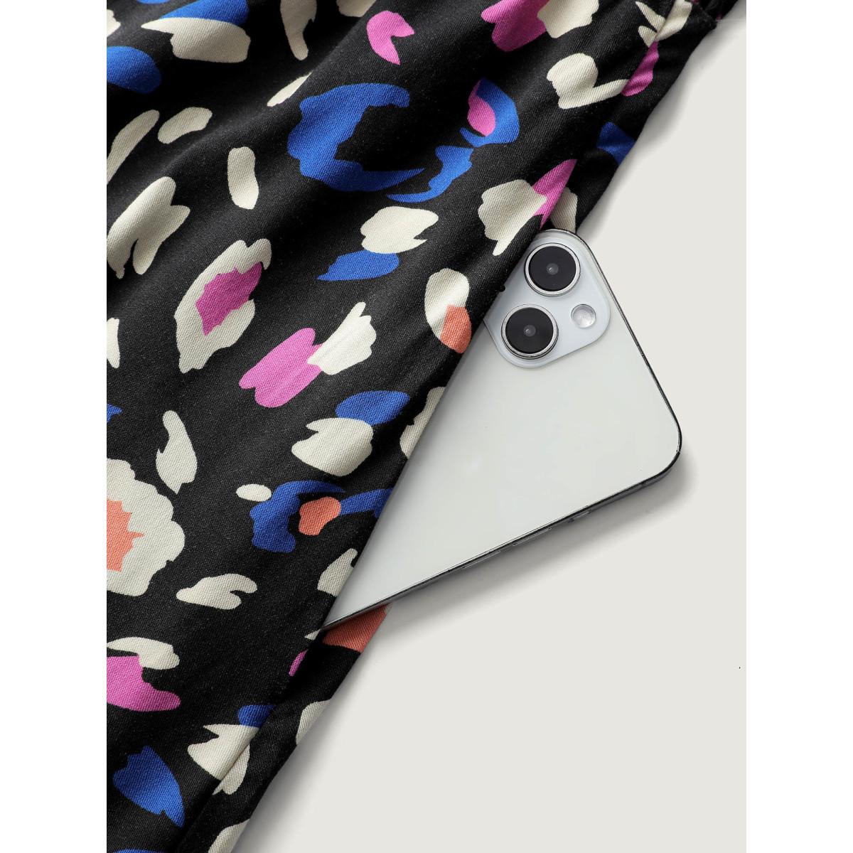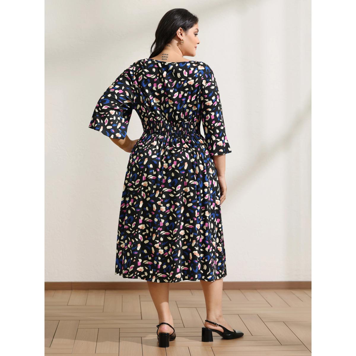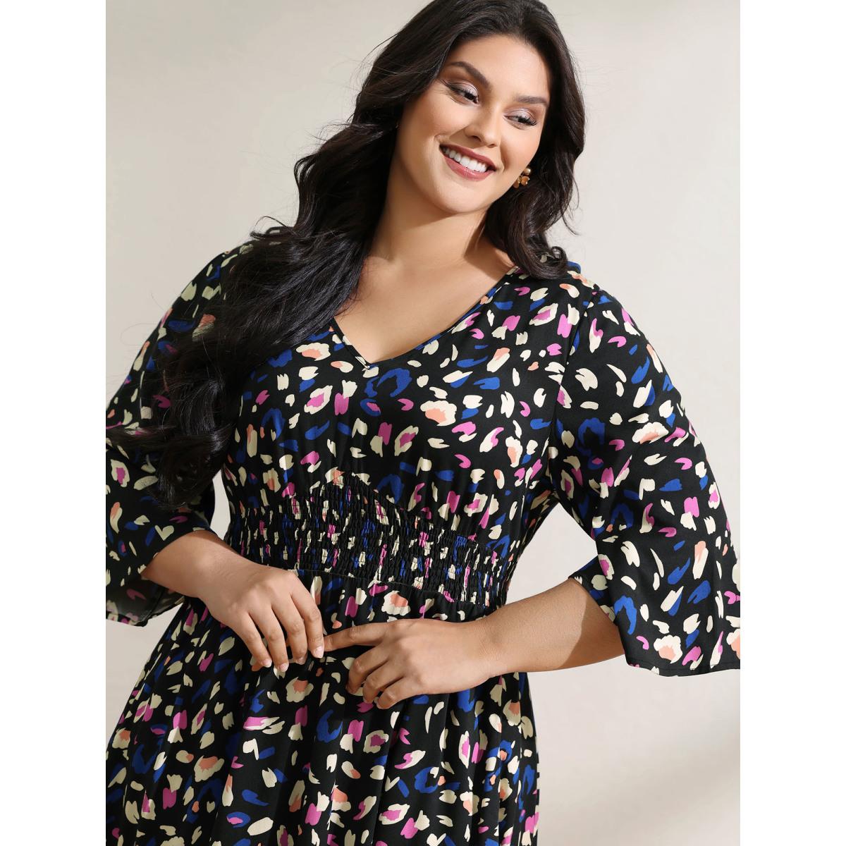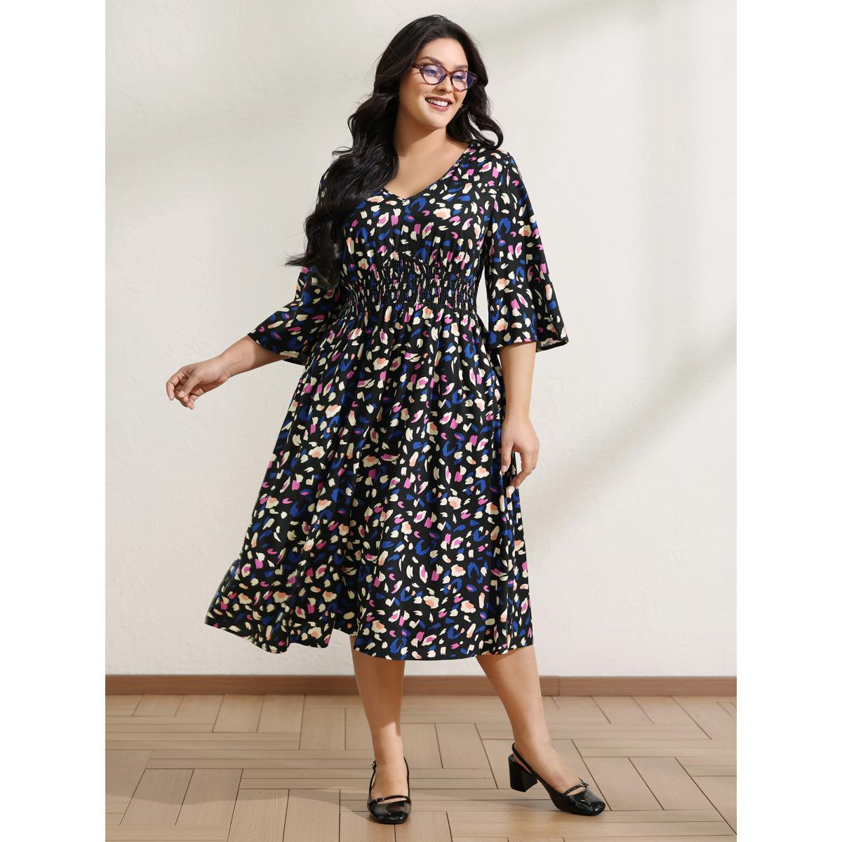 Plus Size Leopard Print Shirred Waist V-Neck Midi Dress Black Women Playful Shirred V-neck Elbow-length sleeve Curvy BloomChic 18-20/2X