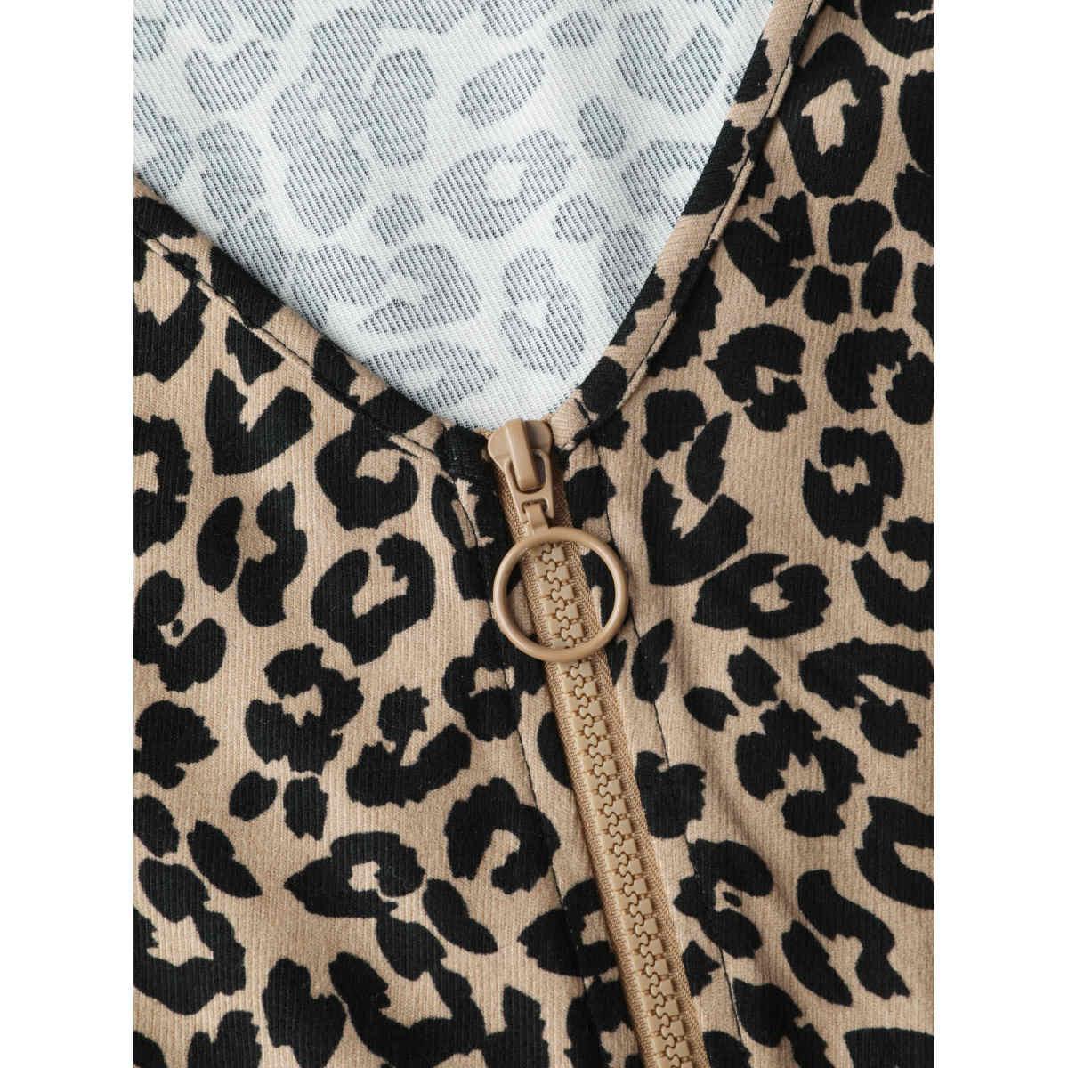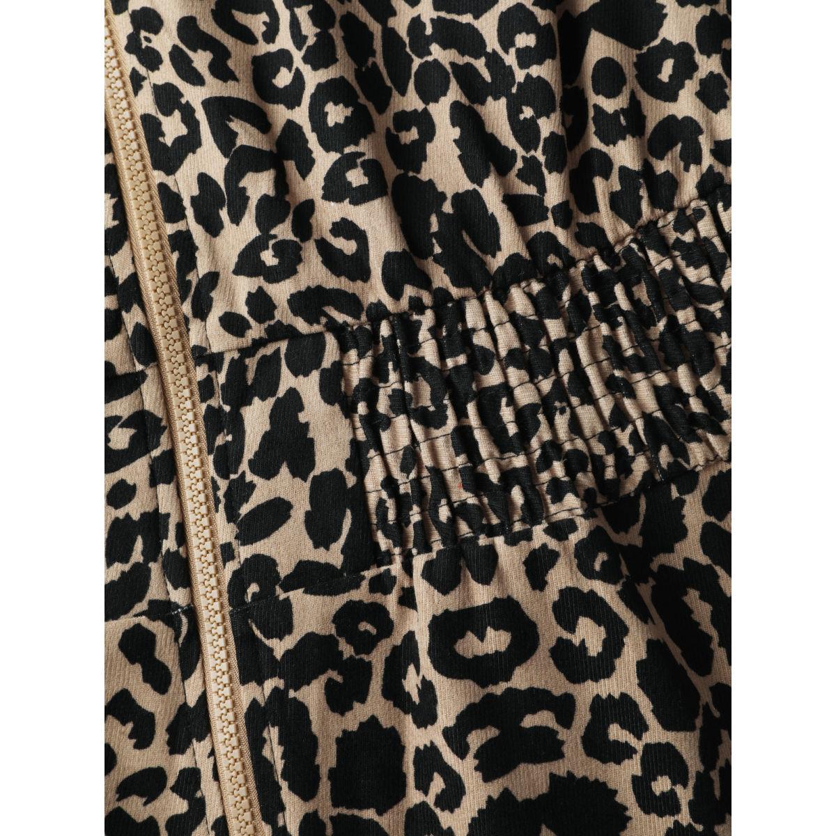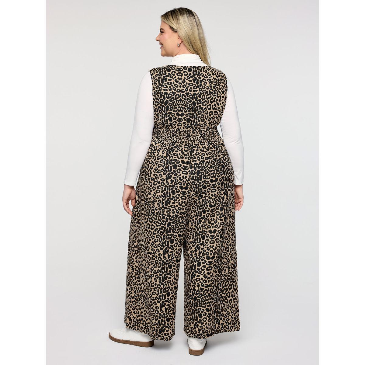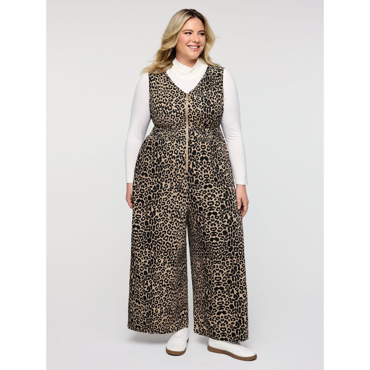 Plus Size LightBrown Leopard Pattern Zipper-Front Shirred Jumpsuit Women Sleeveless V-neck Casual Loose Jumpsuits BloomChic 12/L
