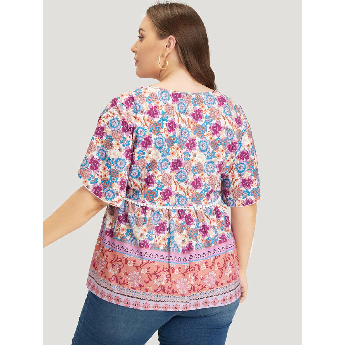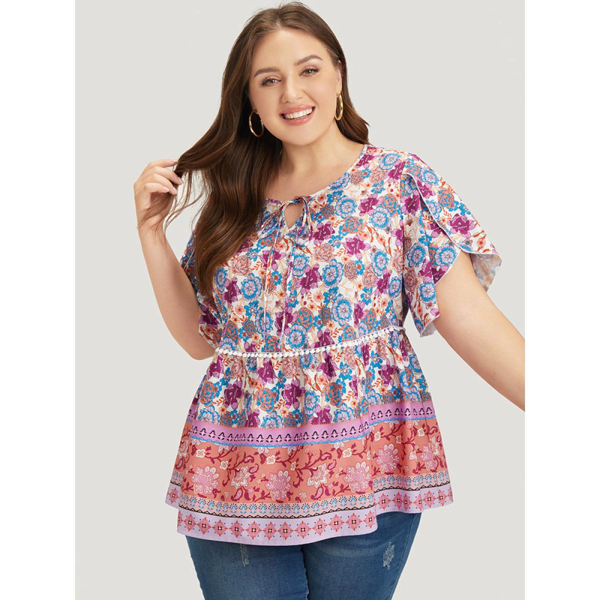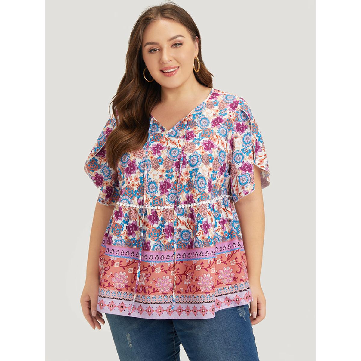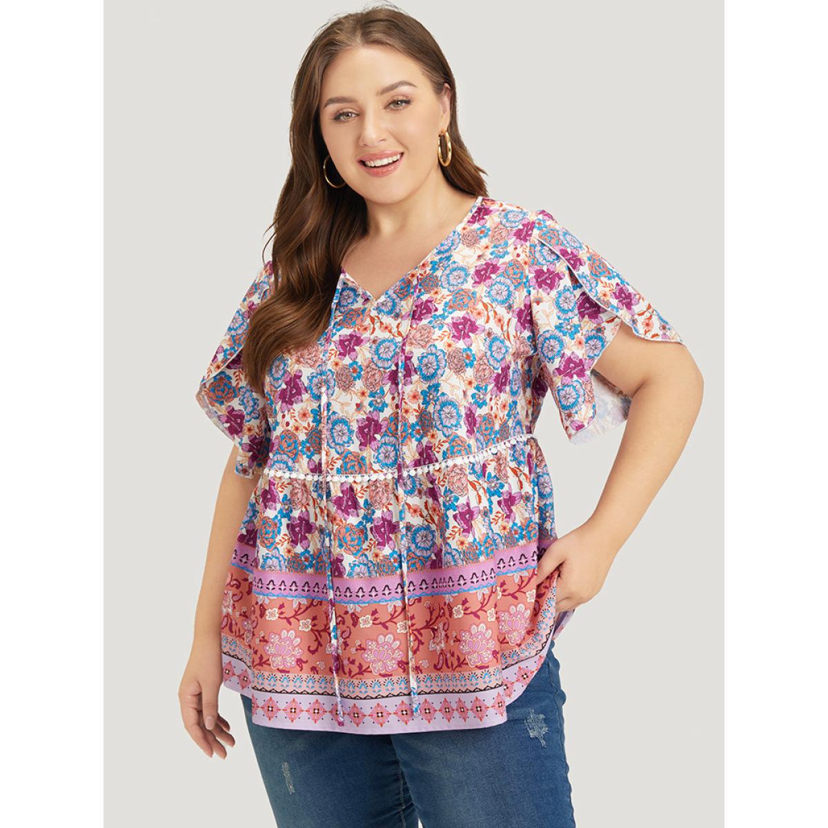 Plus Size Lilac Bandana Print Petal Sleeve Tie Neck Pompom Trim Blouse Women Vacation Short sleeve Tie Neck Dailywear Blouses BloomChic 10/M