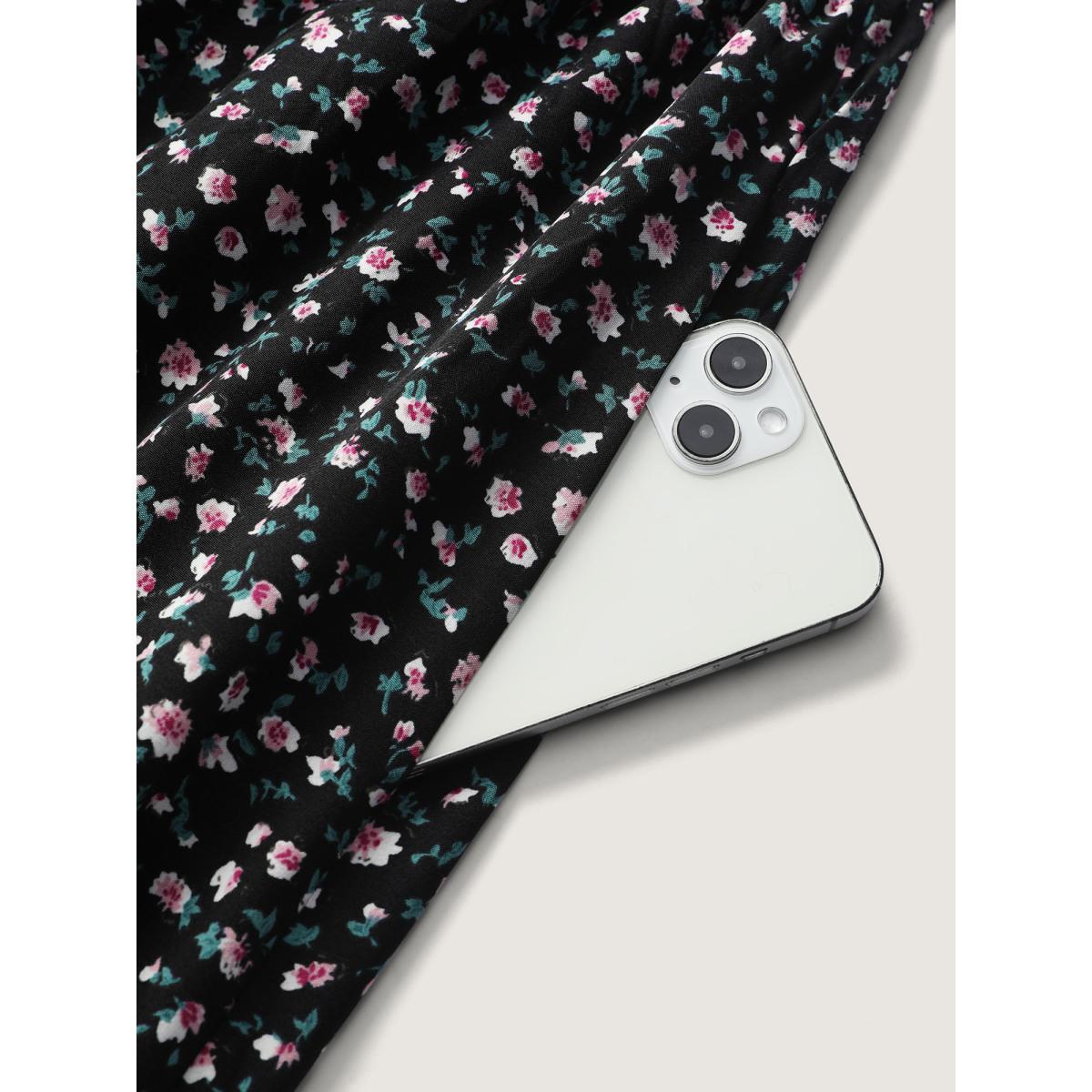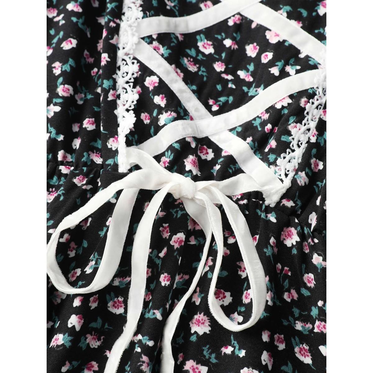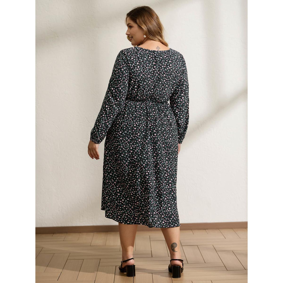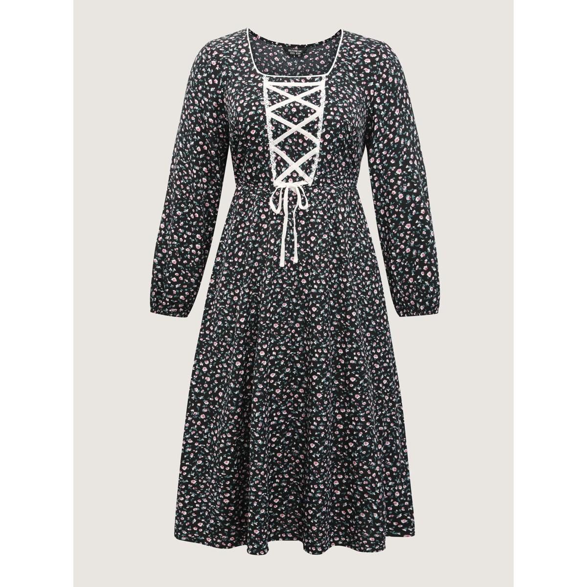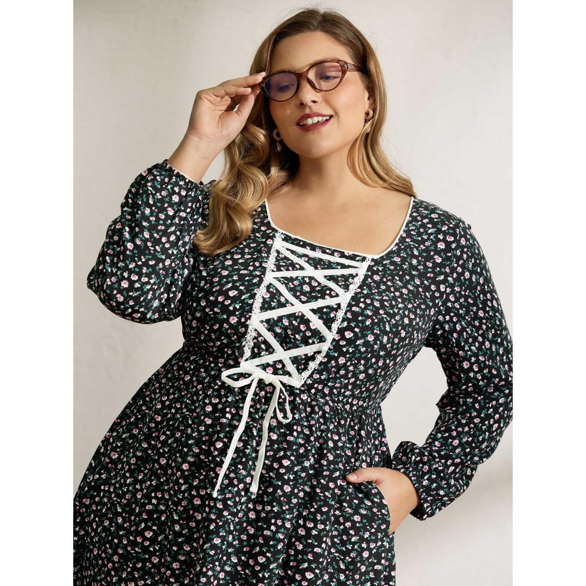 Plus Size Micro Floral Print Adjustable Drawstring Maxi Dress Black Women Timeless Woven ribbon&lace trim Square Neck Extra Long Sleeve Curvy BloomChic 12/L