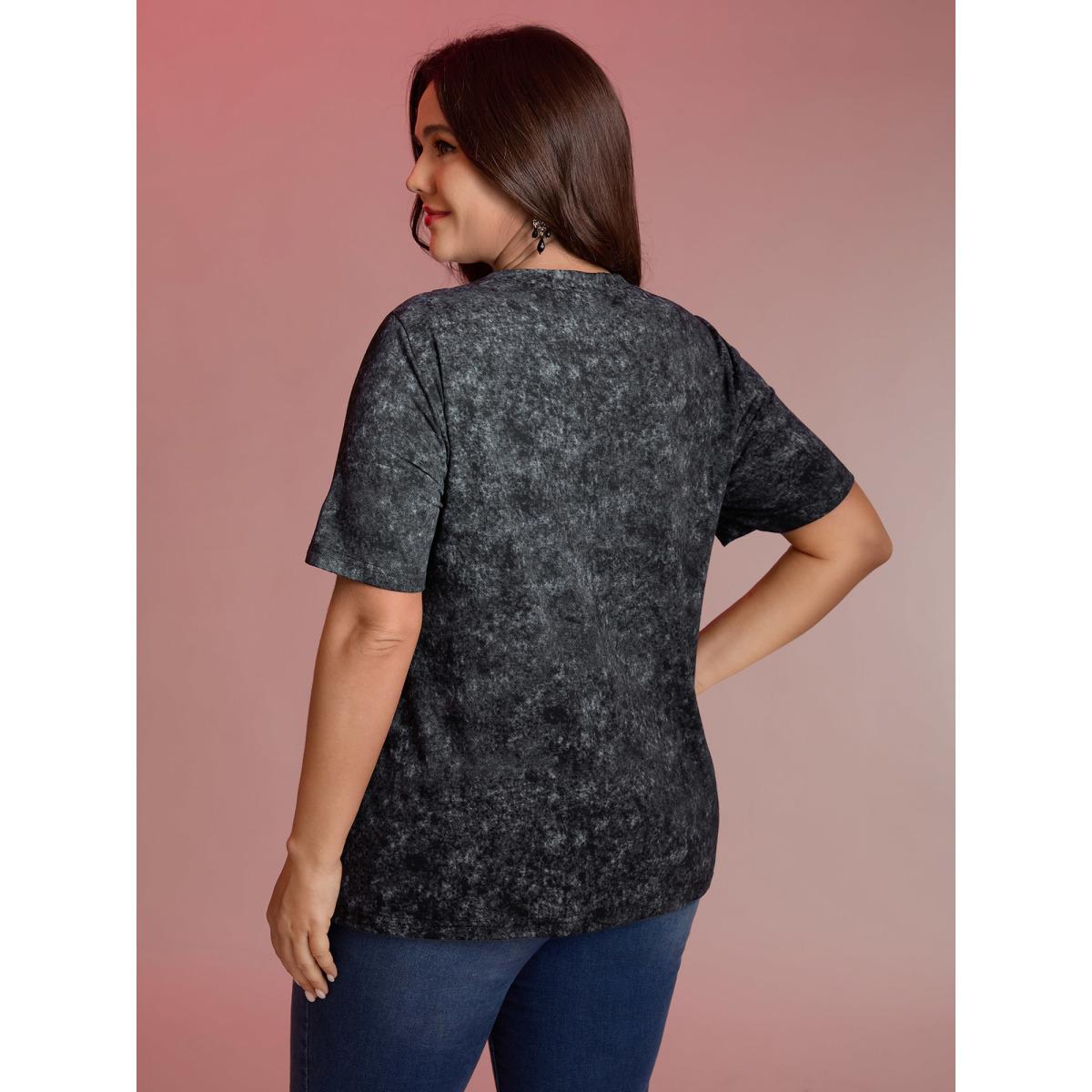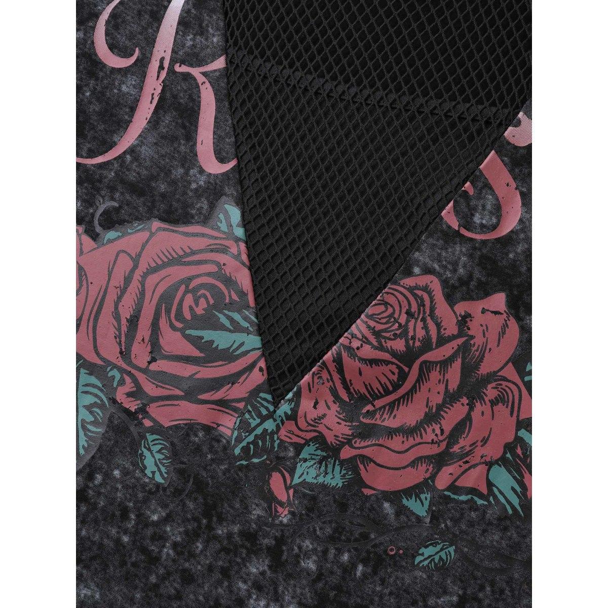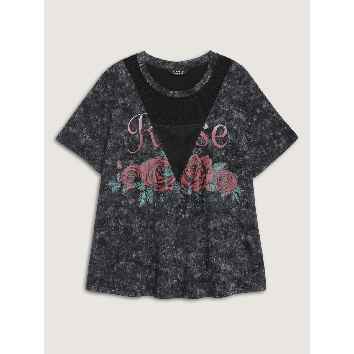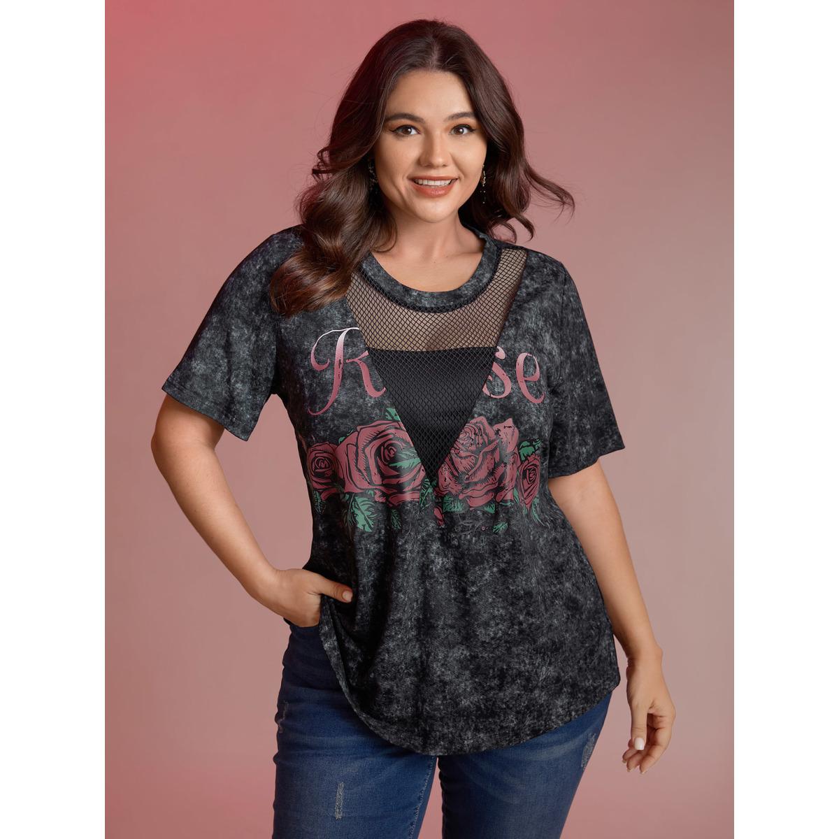 Plus Size Midnight Rosy Print Sheer Neckline T-Shirt Black Women Playful See through Natural Flowers Round Neck Casual T-shirts BloomChic 18-20/2X