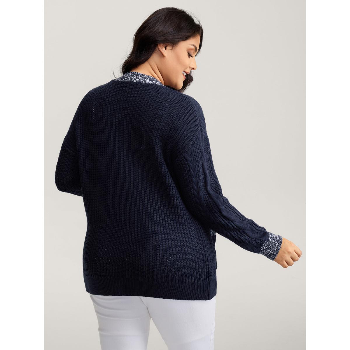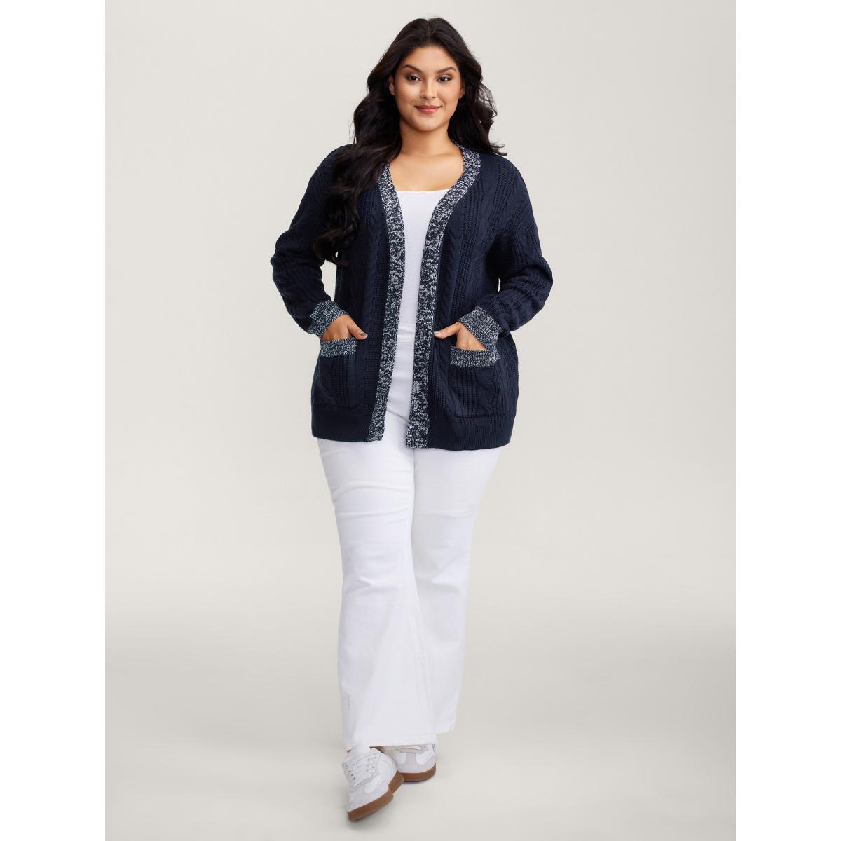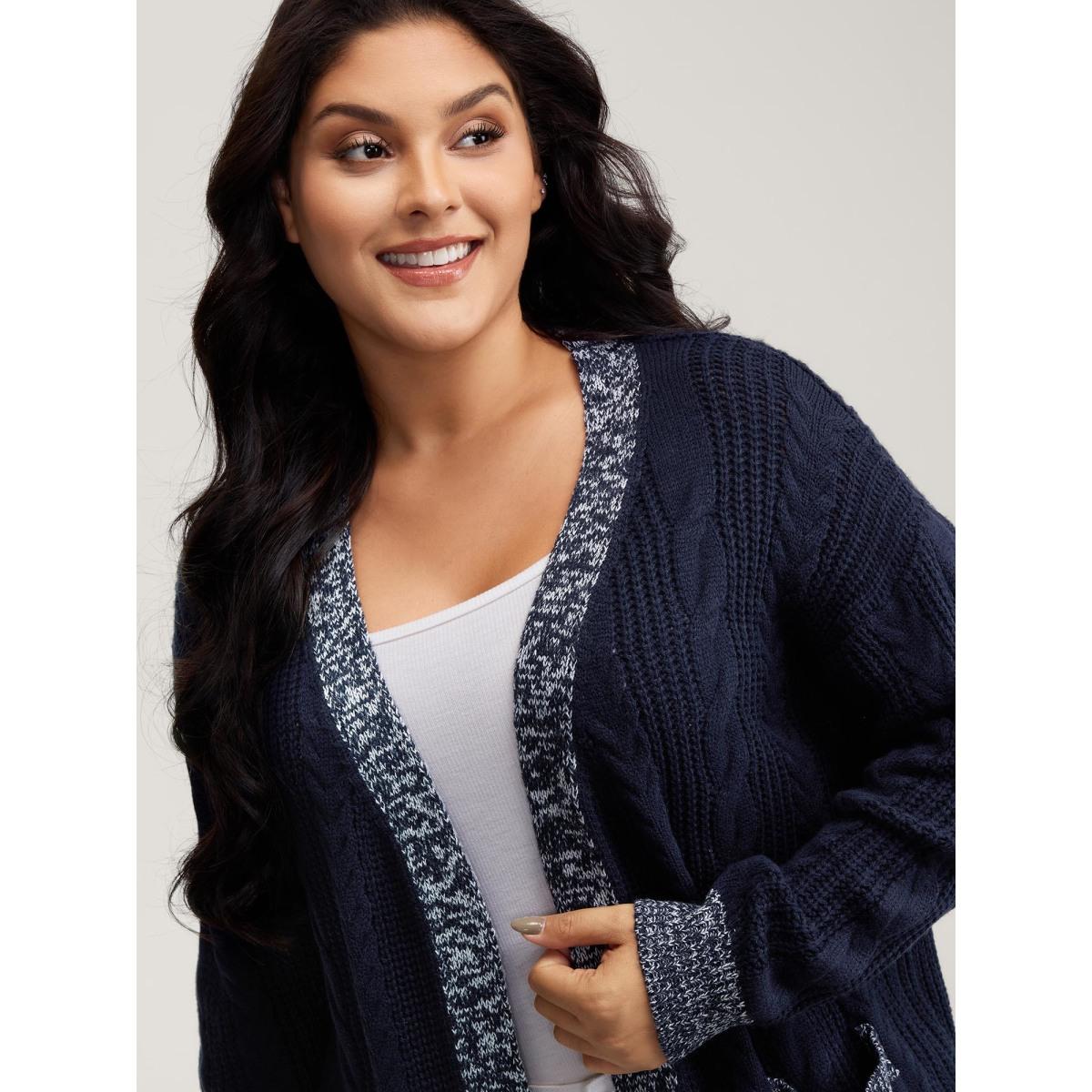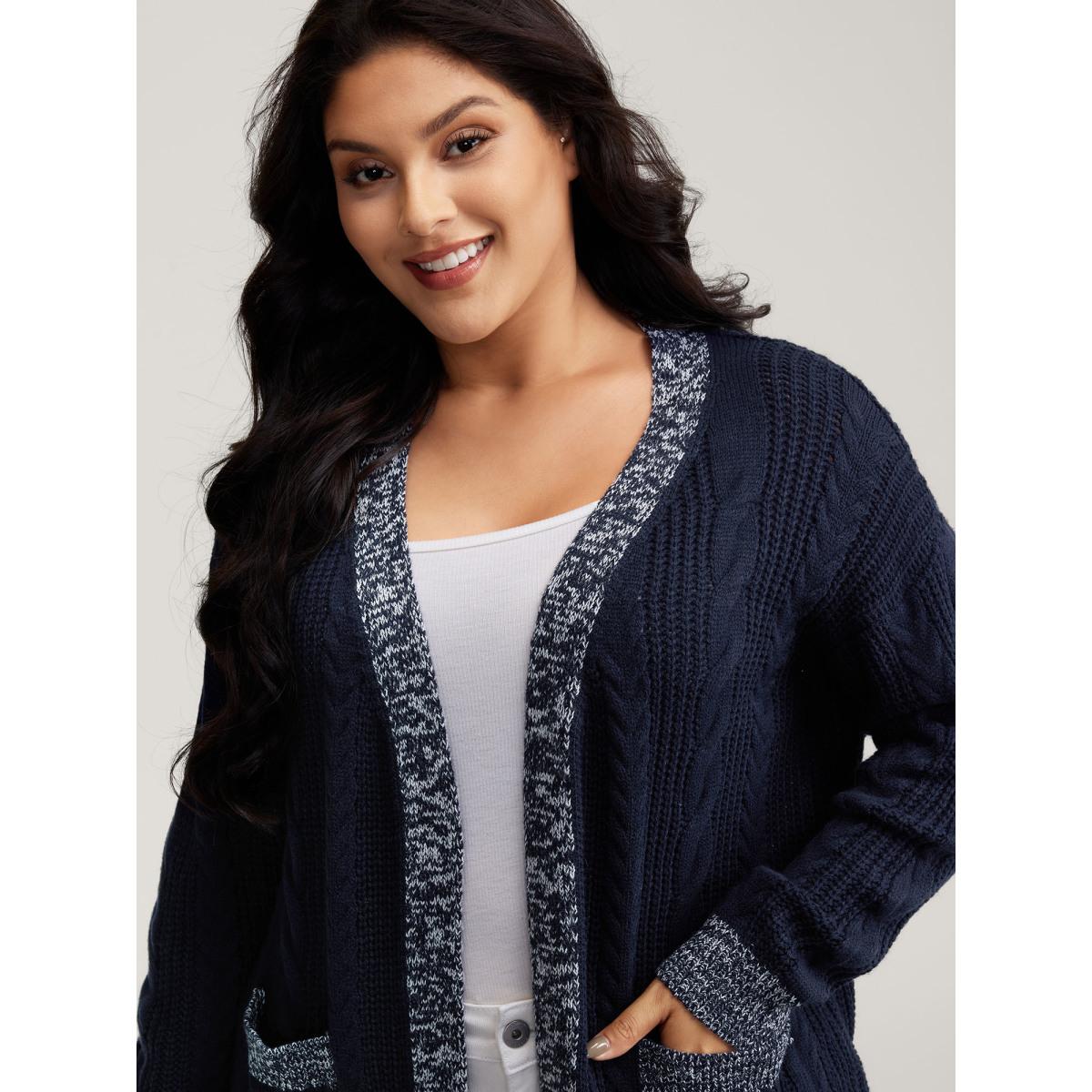 Plus Size Mixed-Yarn Color Contrast Pockets Knit Cardigan Indigo Women Leisure Loose Long Sleeve Casual Cardigans BloomChic 18-20/2X