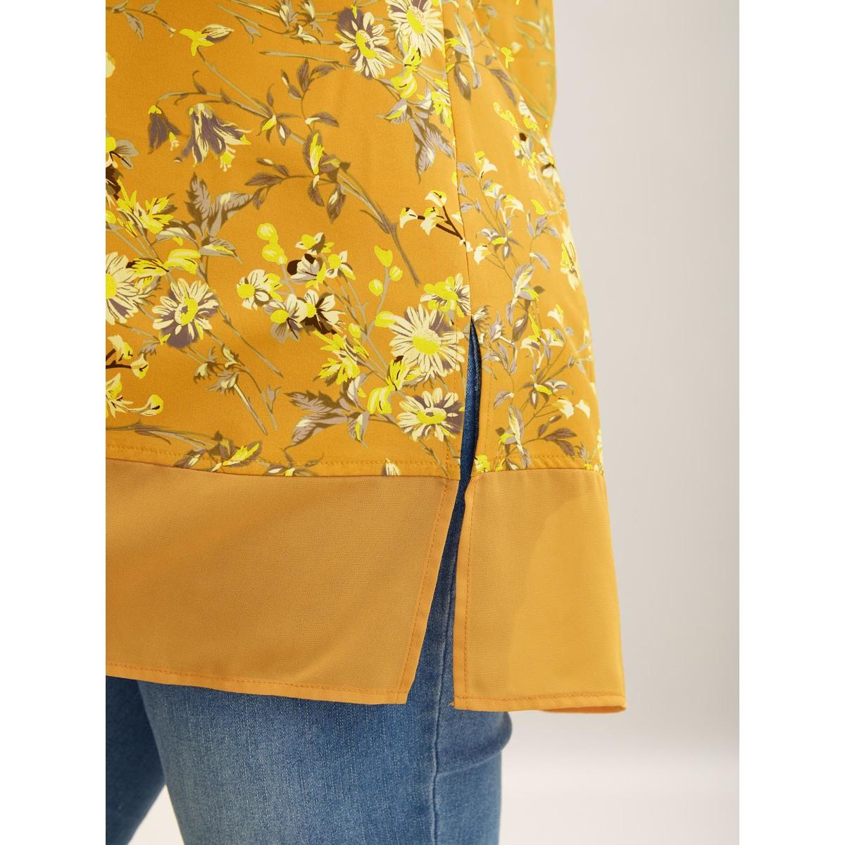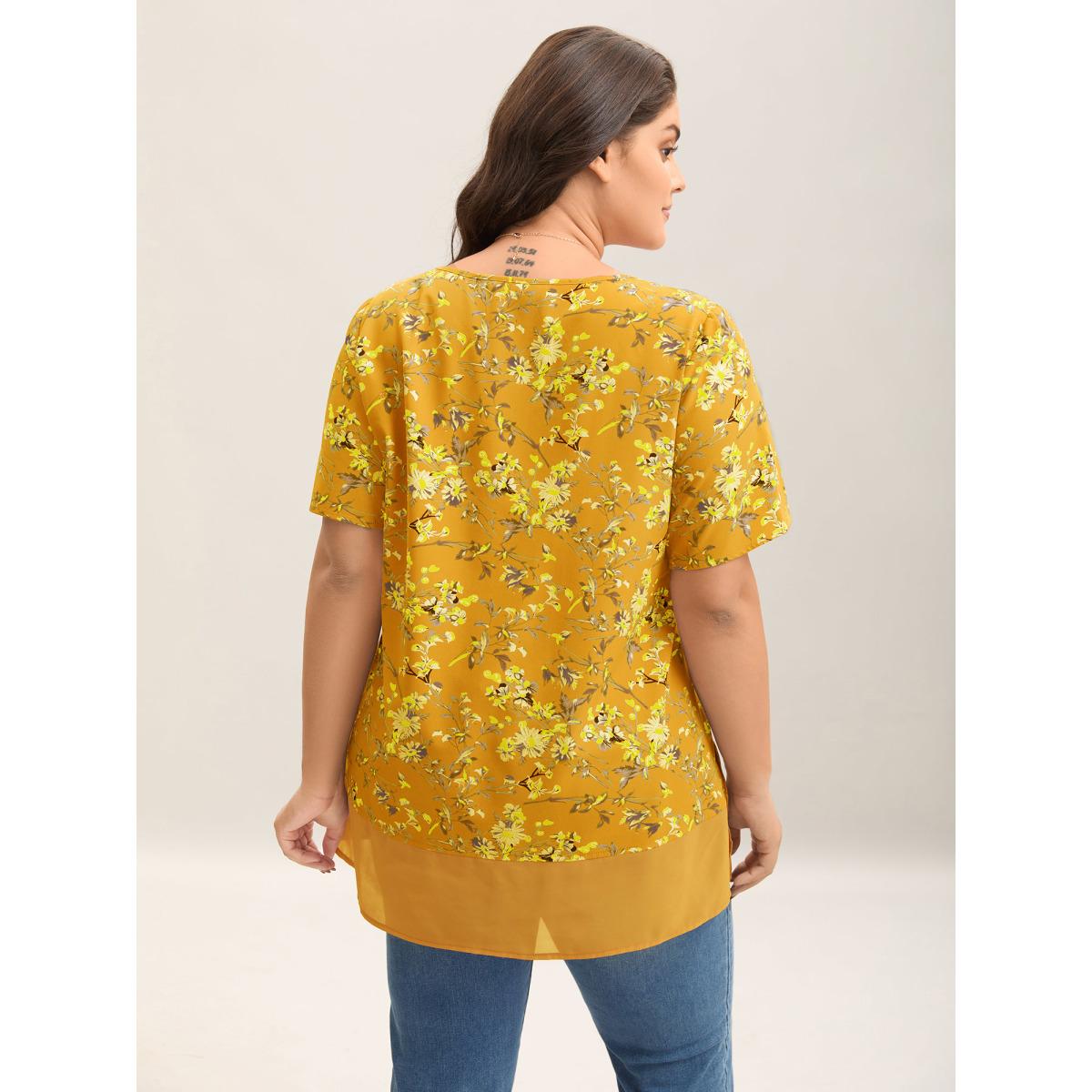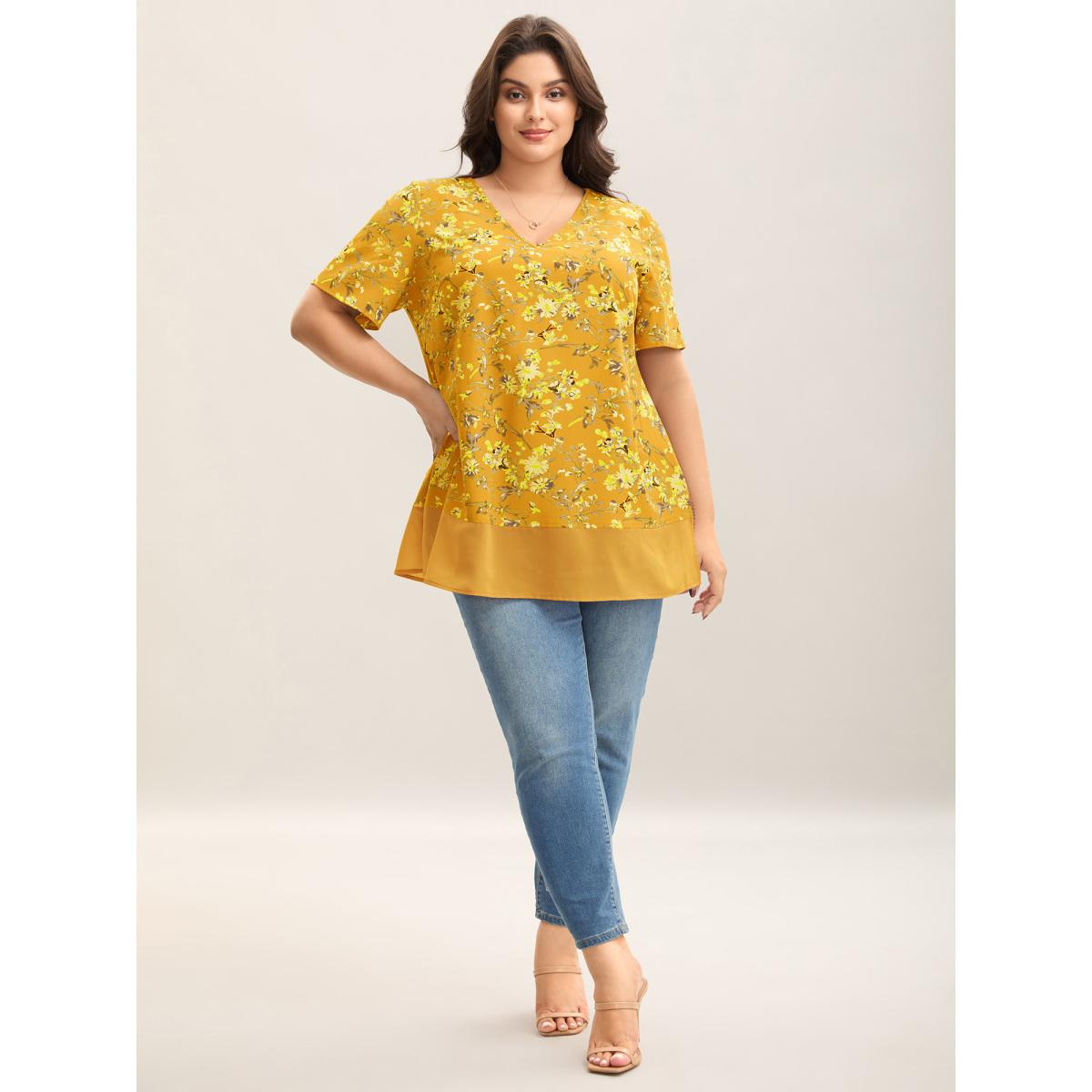 Plus Size Mustardyellow Garden Print Spliced V-Neck Blouse Women Romantic Short sleeve V-neck Elegant Blouses BloomChic 22-24/3X