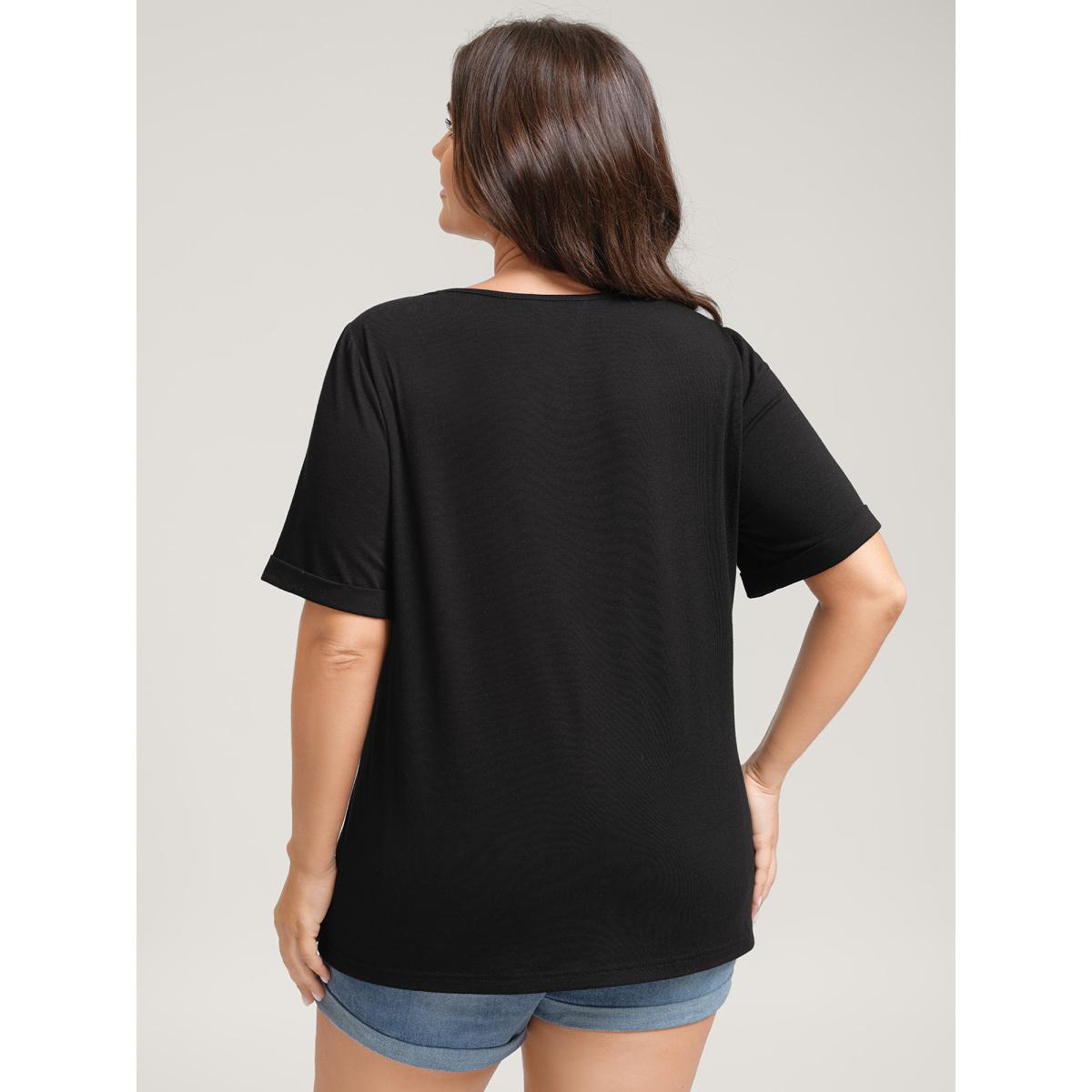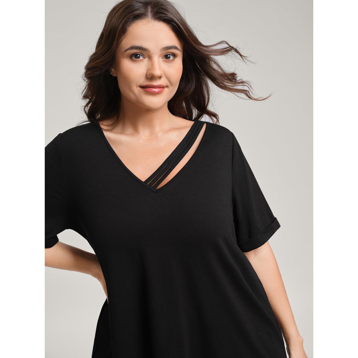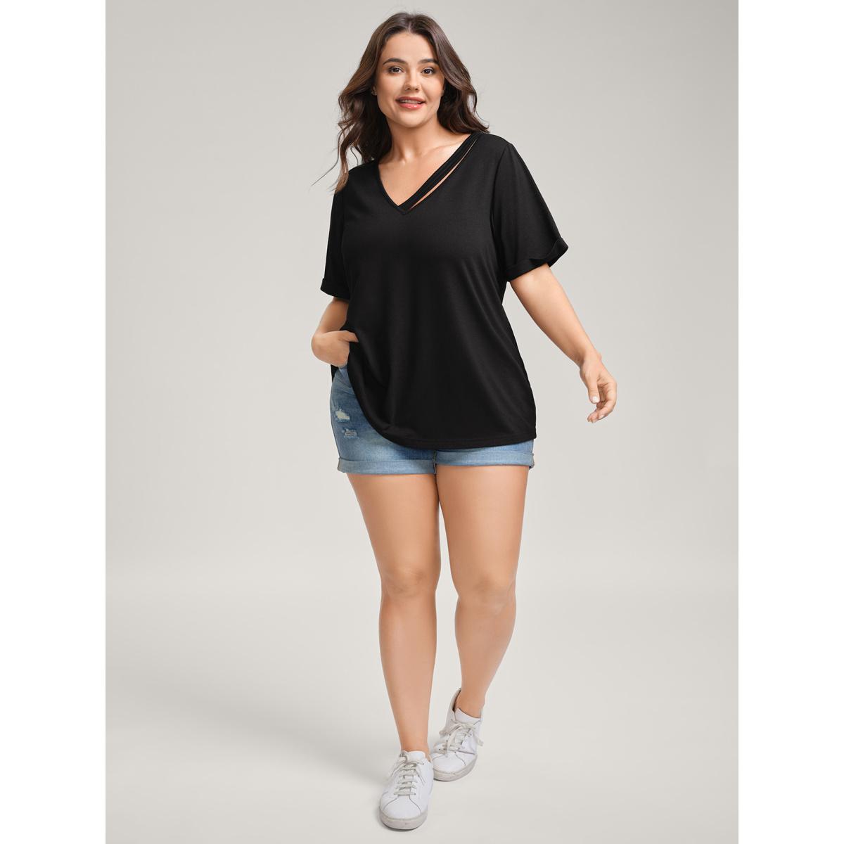 Plus Size Neck Cut-Out Plain T-Shirt Black Women Leisure Asymmetrical V-neck Casual T-shirts BloomChic 18-20/2X Product Image
