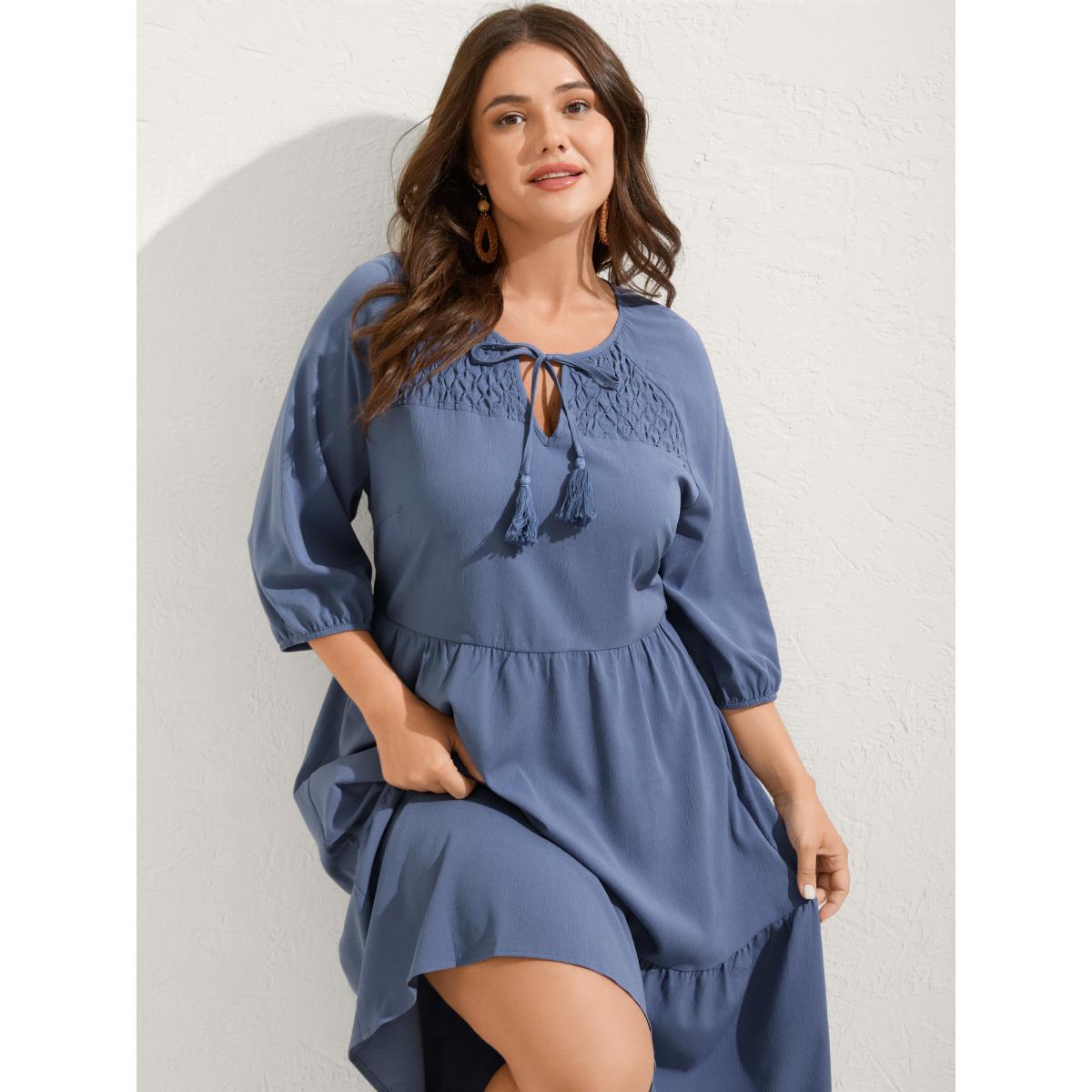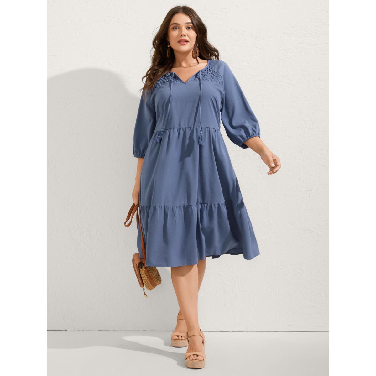Plus Size Neck-Tie Tassel Pockets Tiered Midi Dress Mediumblue Women Notched collar Half Sleeve Curvy BloomChic 18-20/2X
