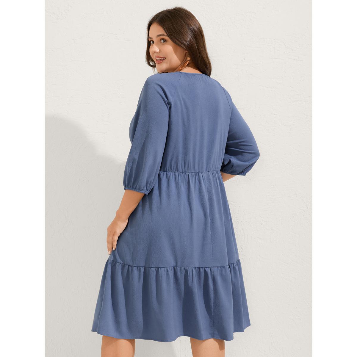 Plus Size Lace Textured Pockets Tiered Midi Dress Mediumblue Women Boho V-neck Short sleeve Curvy BloomChic 26/4X