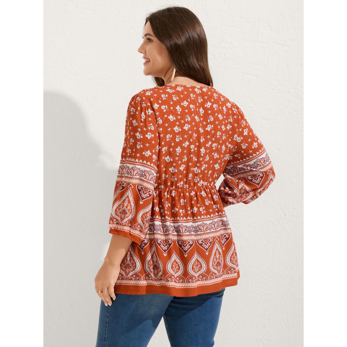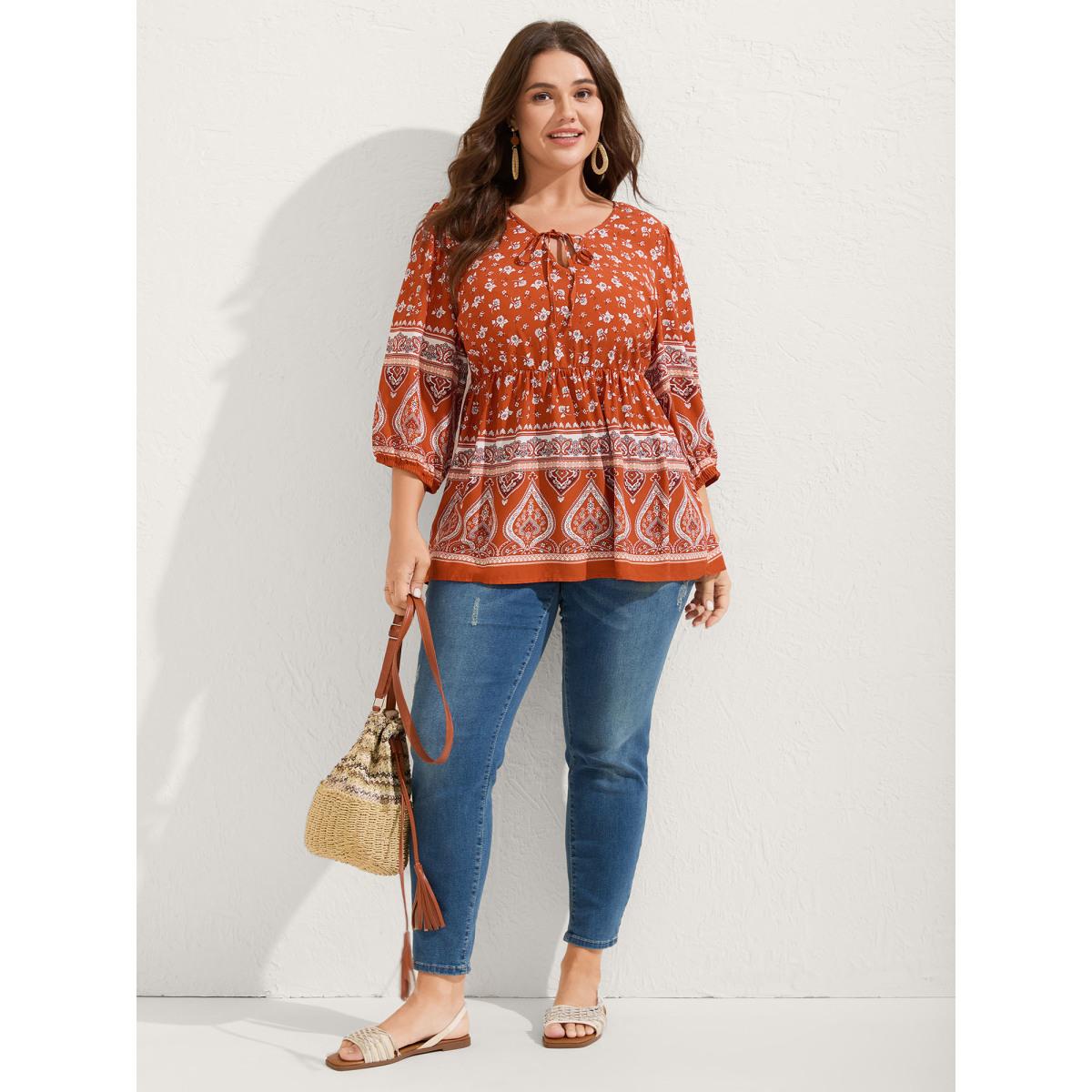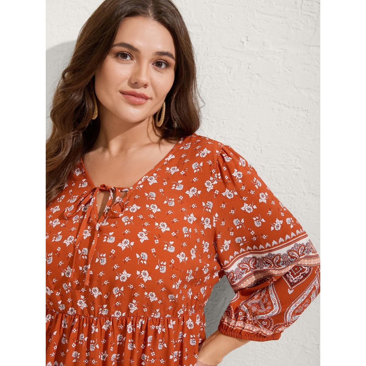 Plus Size OrangeRed Floral Print Neck Tie Flared Blouse Women Boho Elbow-length sleeve V-neck Vacation Blouses BloomChic 14-16/1X