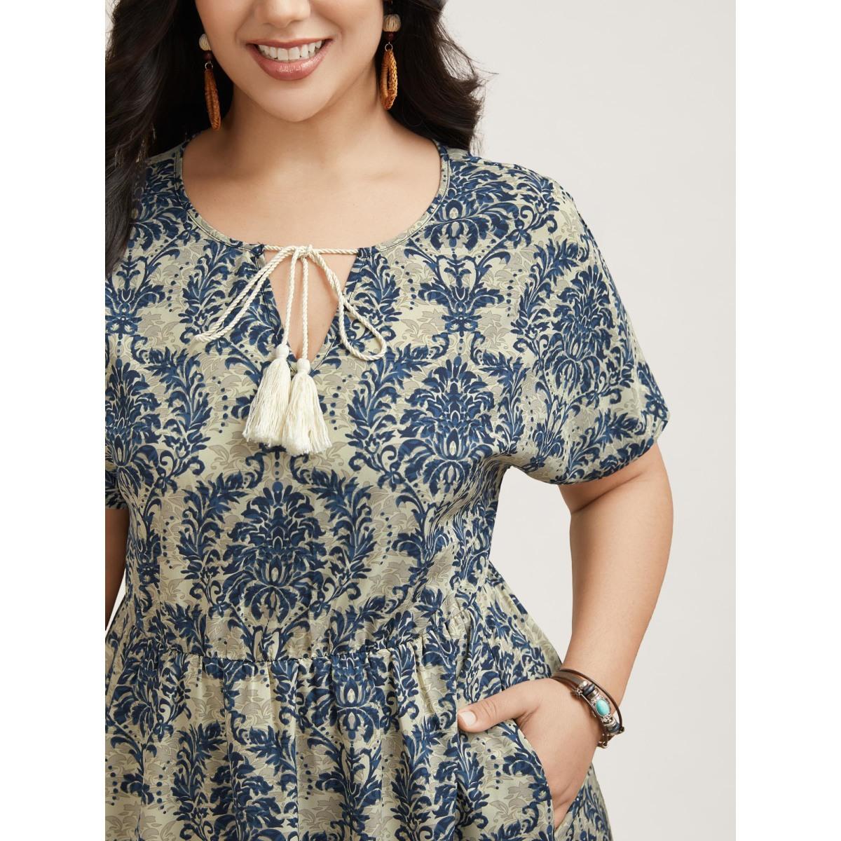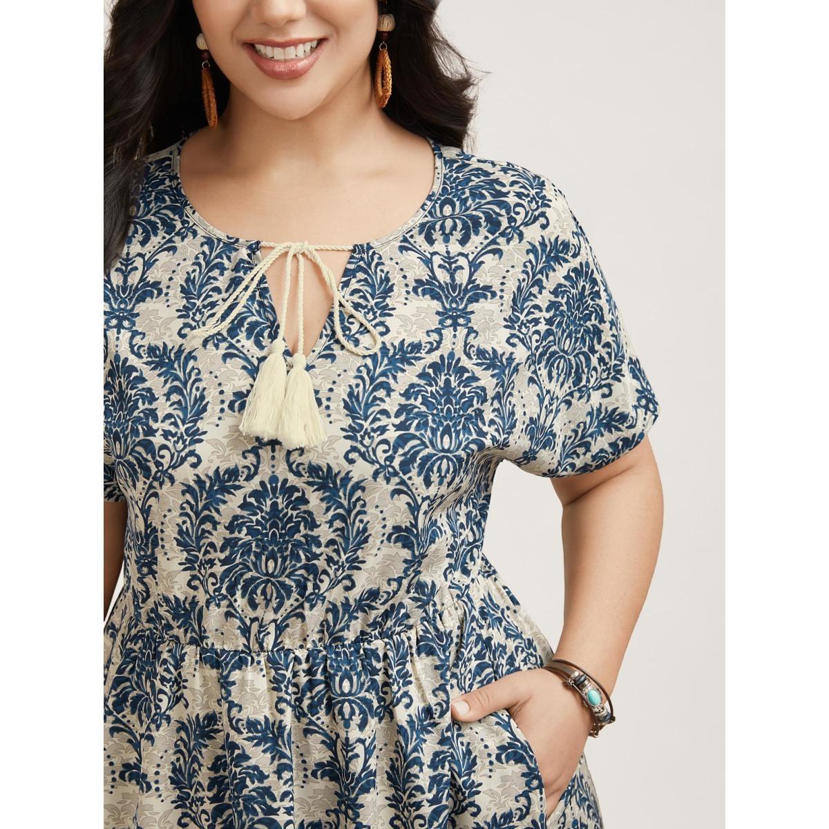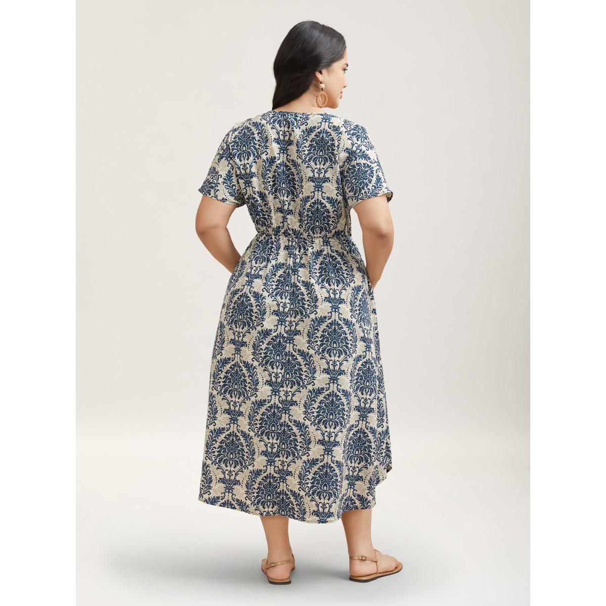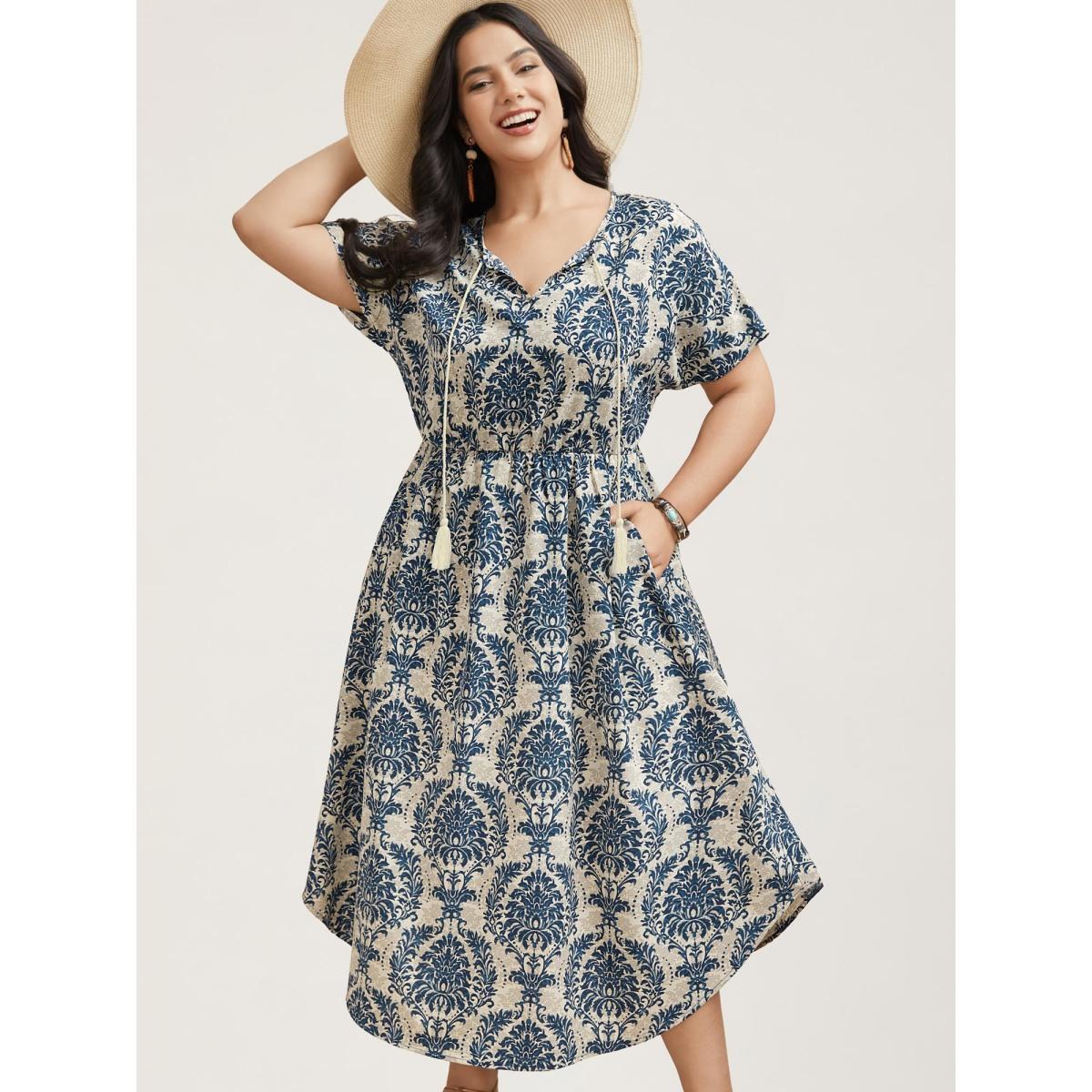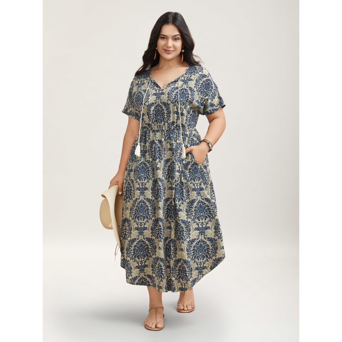 Plus Size Ornate Print Curvy Hem Tied Maxi Dress Navy Women Resort Tie knot V-neck Short sleeve Curvy BloomChic 28/5X