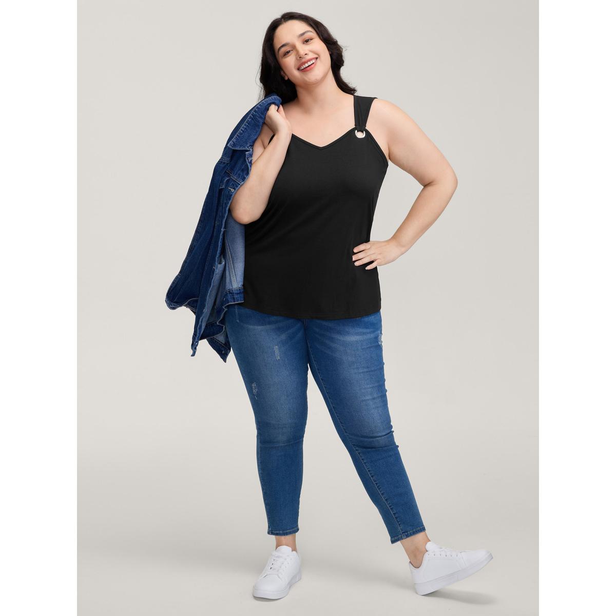 Plus Size Stretchy Neck Cut-Out Solid Tank Top Women Black Leisure Non Asymmetrical Neck Casual Tank Tops Camis BloomChic 12/L