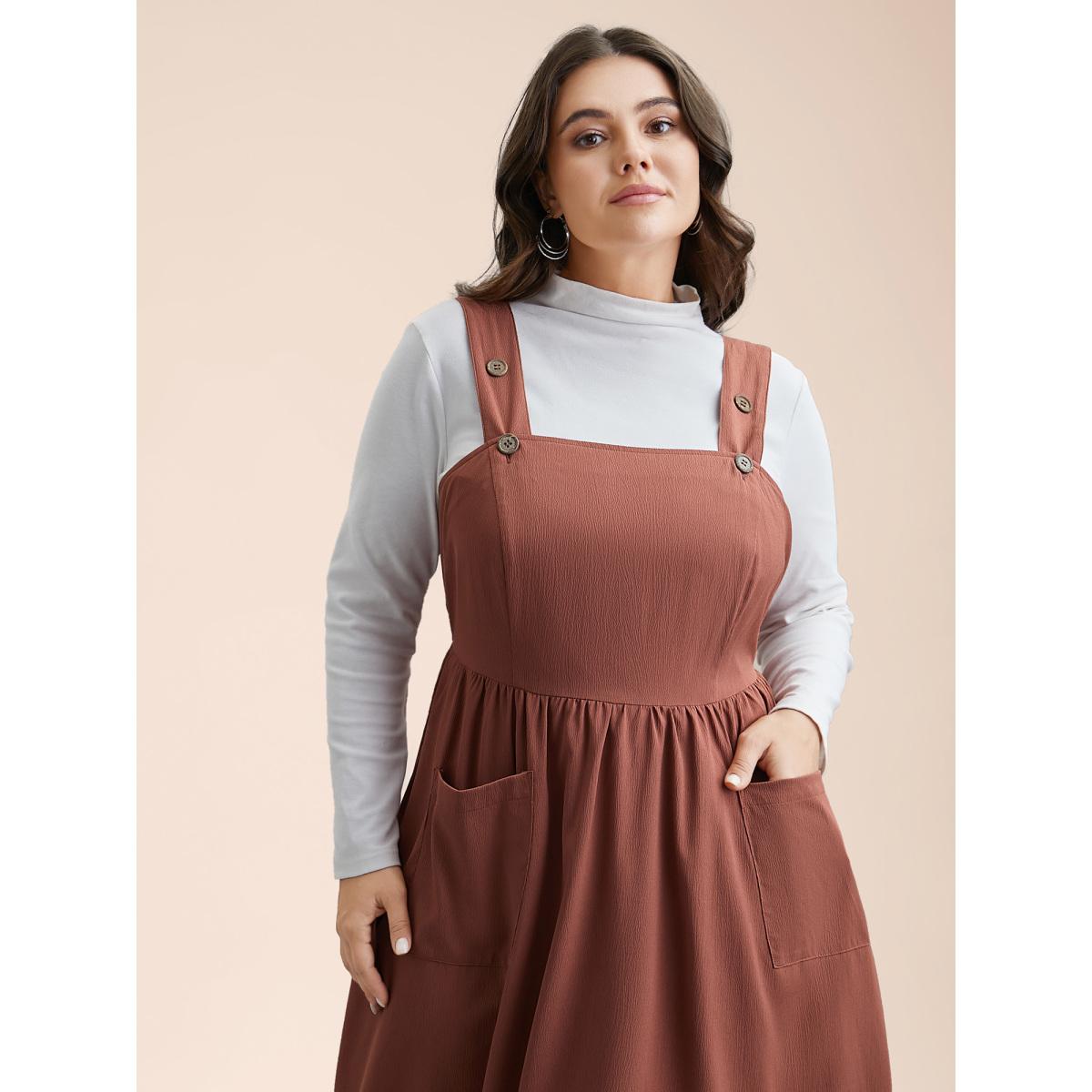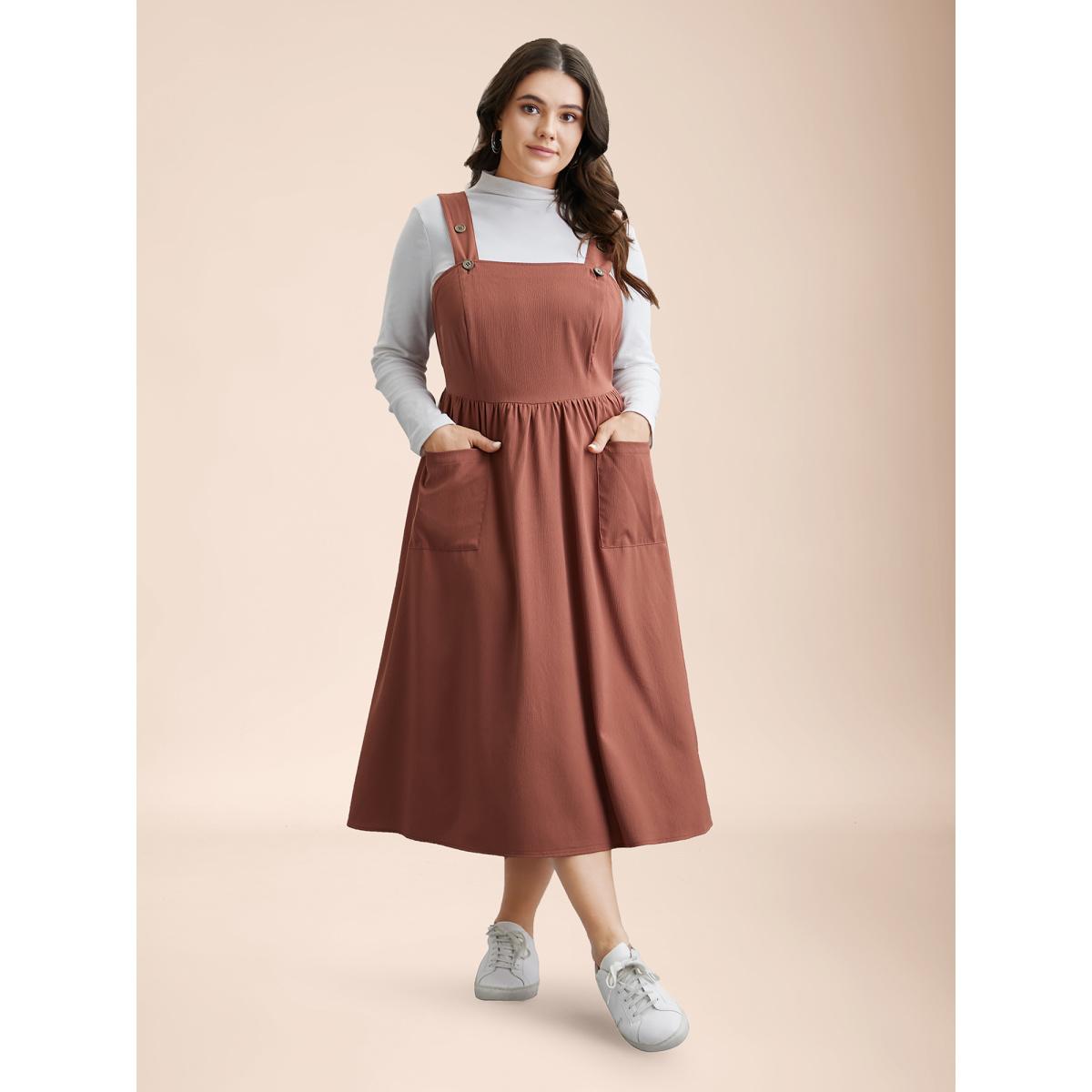 Plus Size Overall Straps Stretchy-Waist Pockets Midi Dress Rust Women Casual Texture Non Sleeveless Curvy BloomChic 10/M