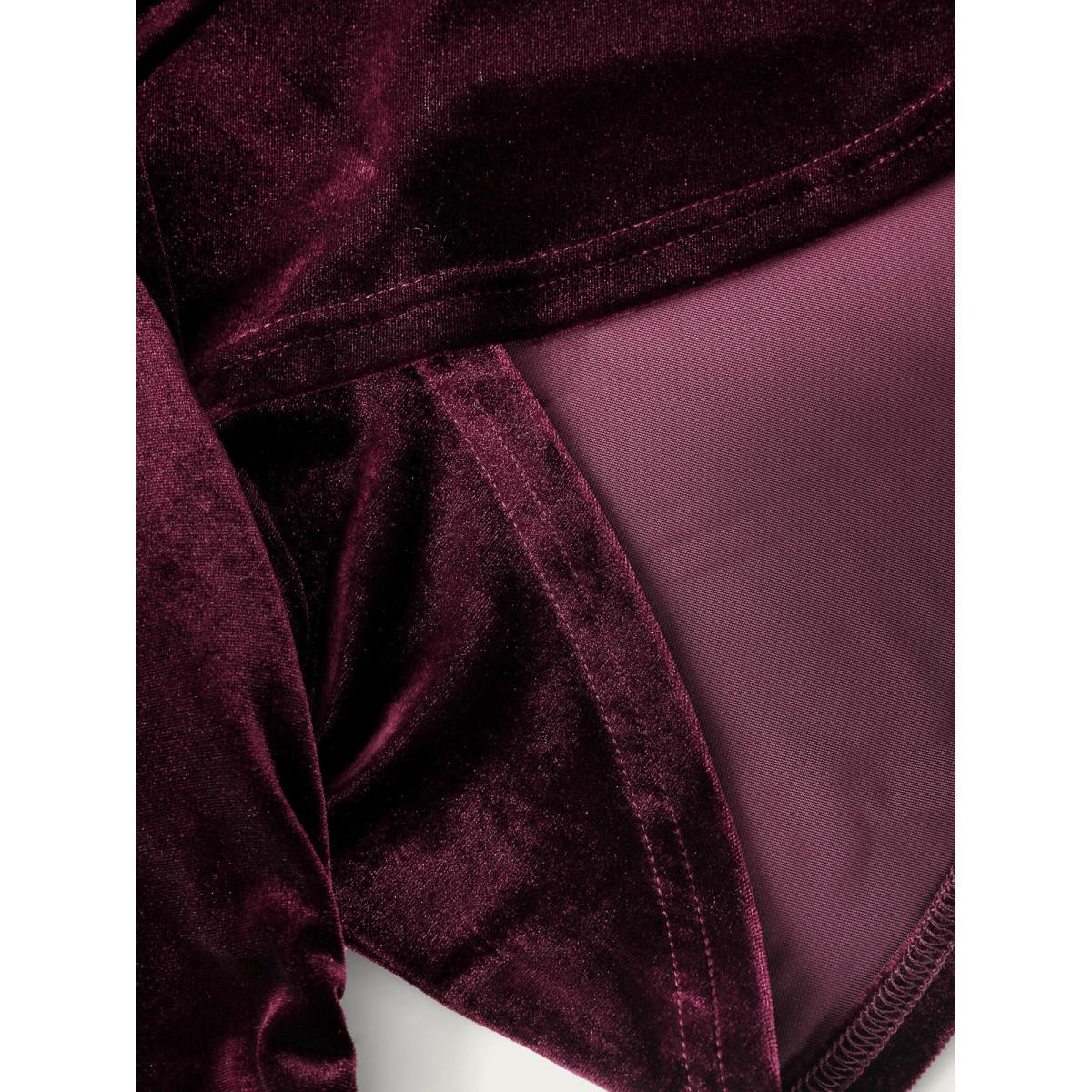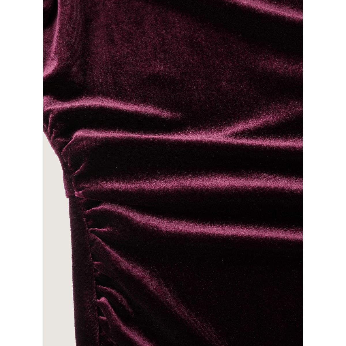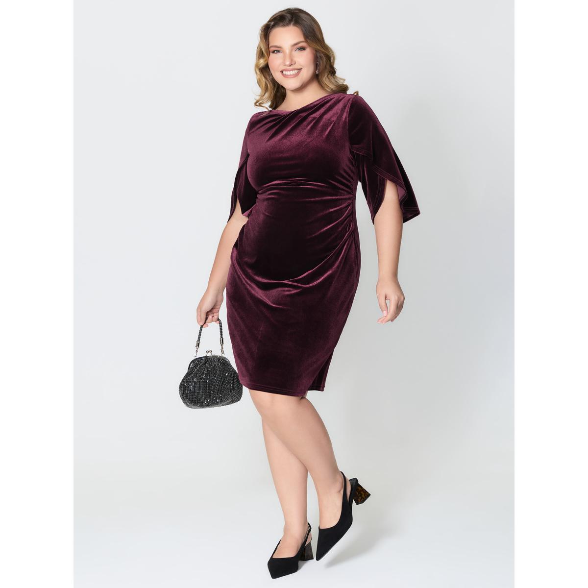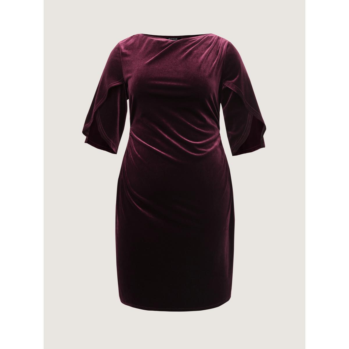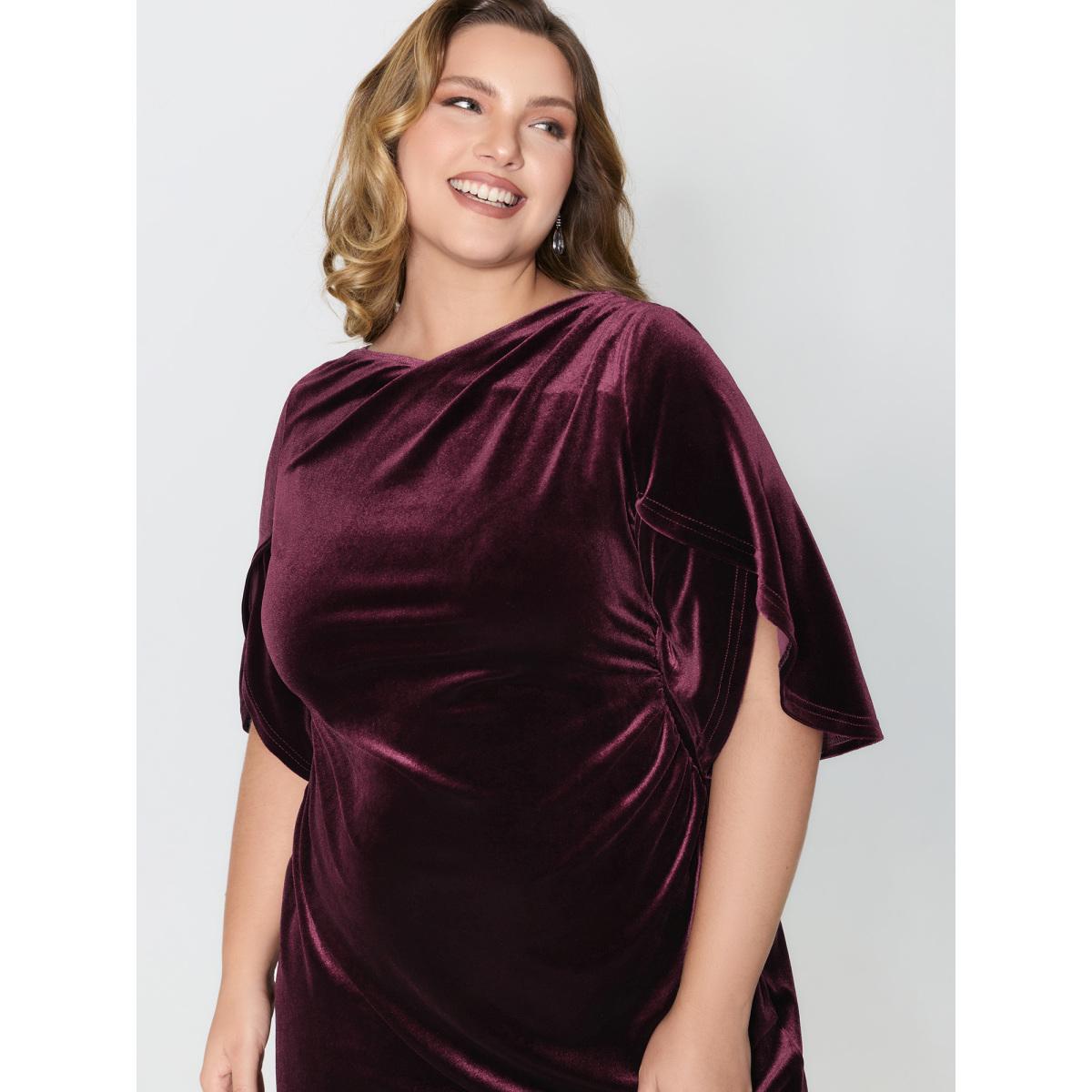 Plus Size Petal Sleeve Pleated Waist-Defining Midi Dress Burgundy Women Party&Cocktail Asymmetrical Neck Half Sleeve Curvy BloomChic 28/5X