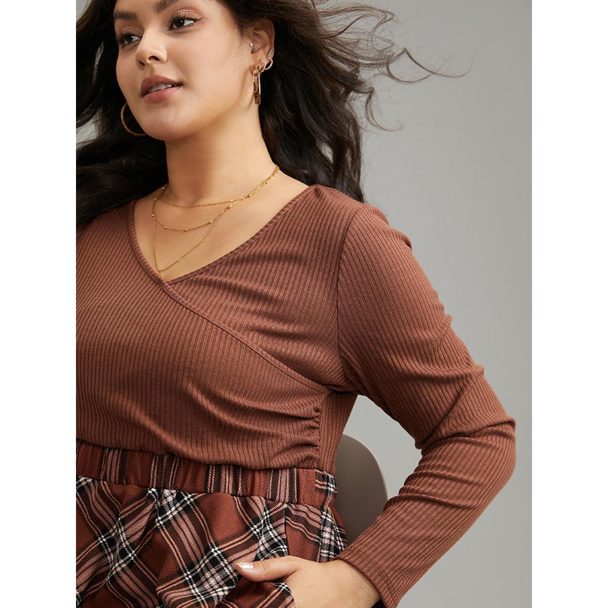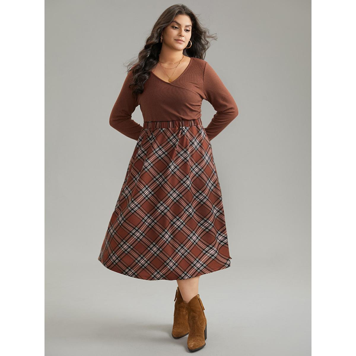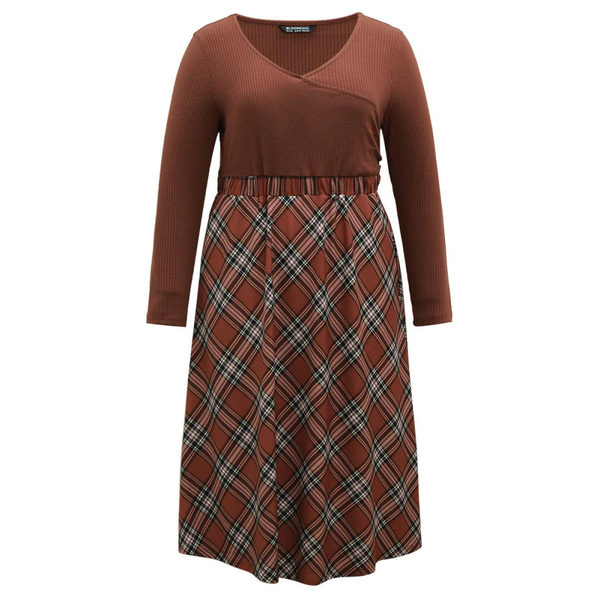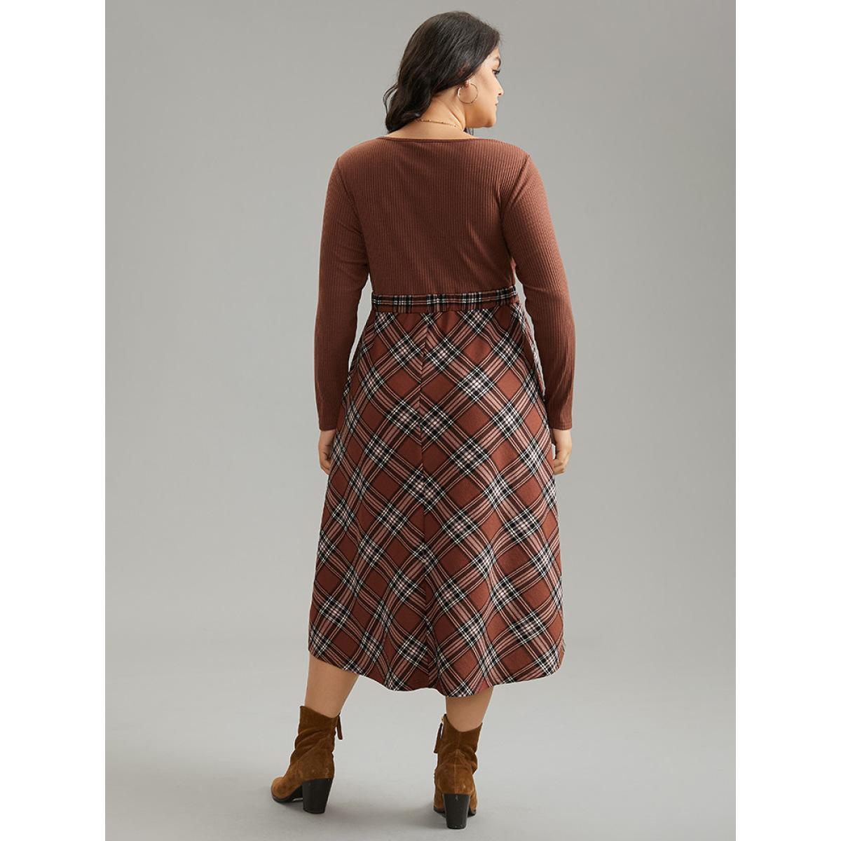 Plus Size Plaid Elastic Waist Patchwork Rib Knit Dress Maroon Women Elegant Printed Round Neck Long Sleeve Curvy Midi Dress BloomChic 30/6X