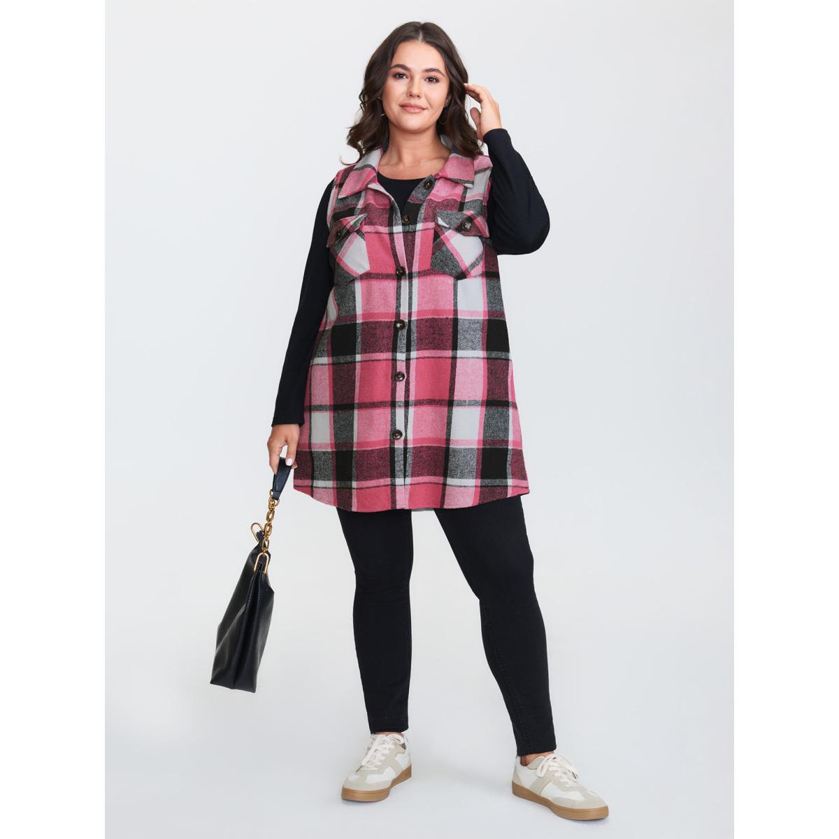 Plus Size Plaid Flap Detail Sleeveless Jacket Women Rosered Button Side seam pocket Casual Jackets BloomChic 14-16/1X