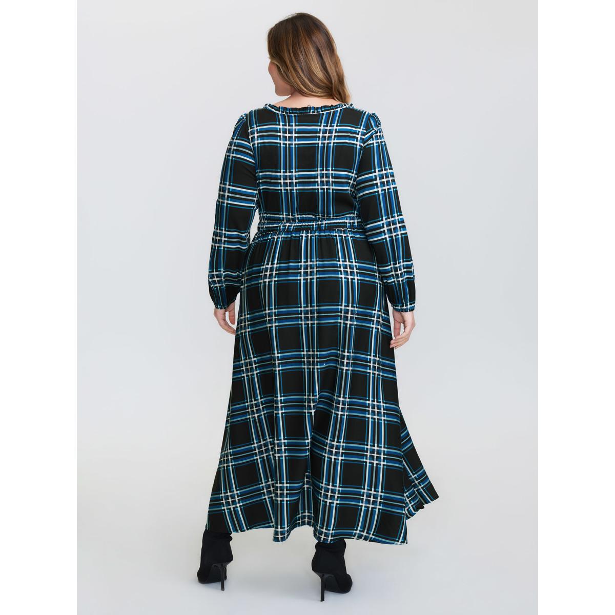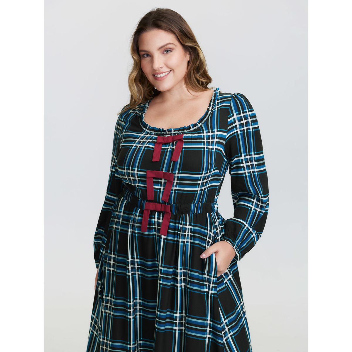 Plus Size Plaid Pattern Bowknot Pockets Maxi Dress DarkGreen Women Leisure Tie knot U-neck Long Sleeve Curvy BloomChic 10/M Product Image